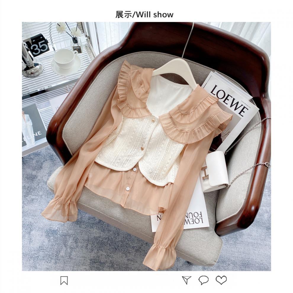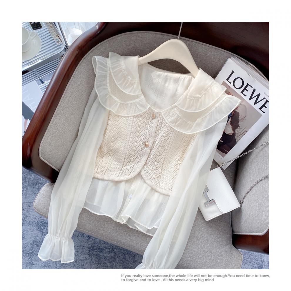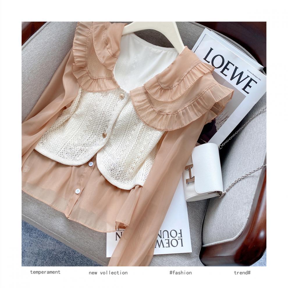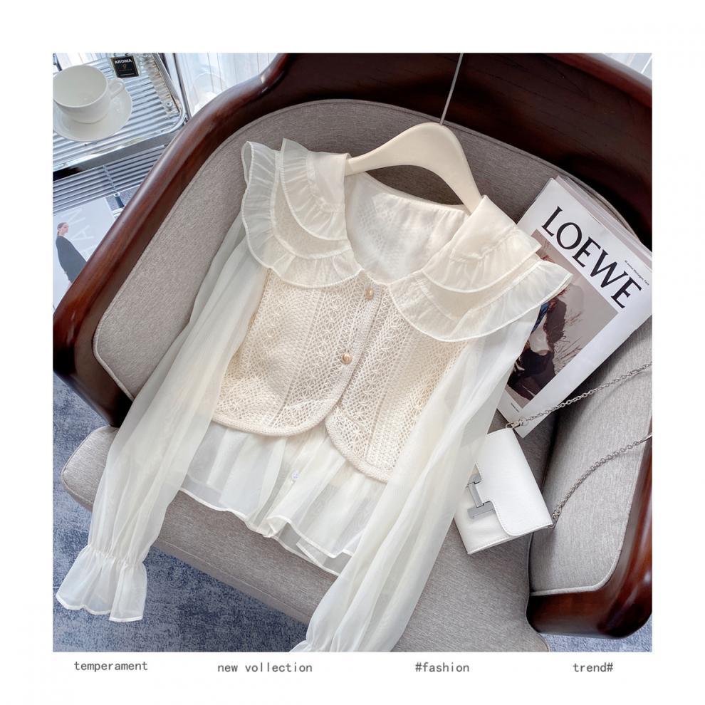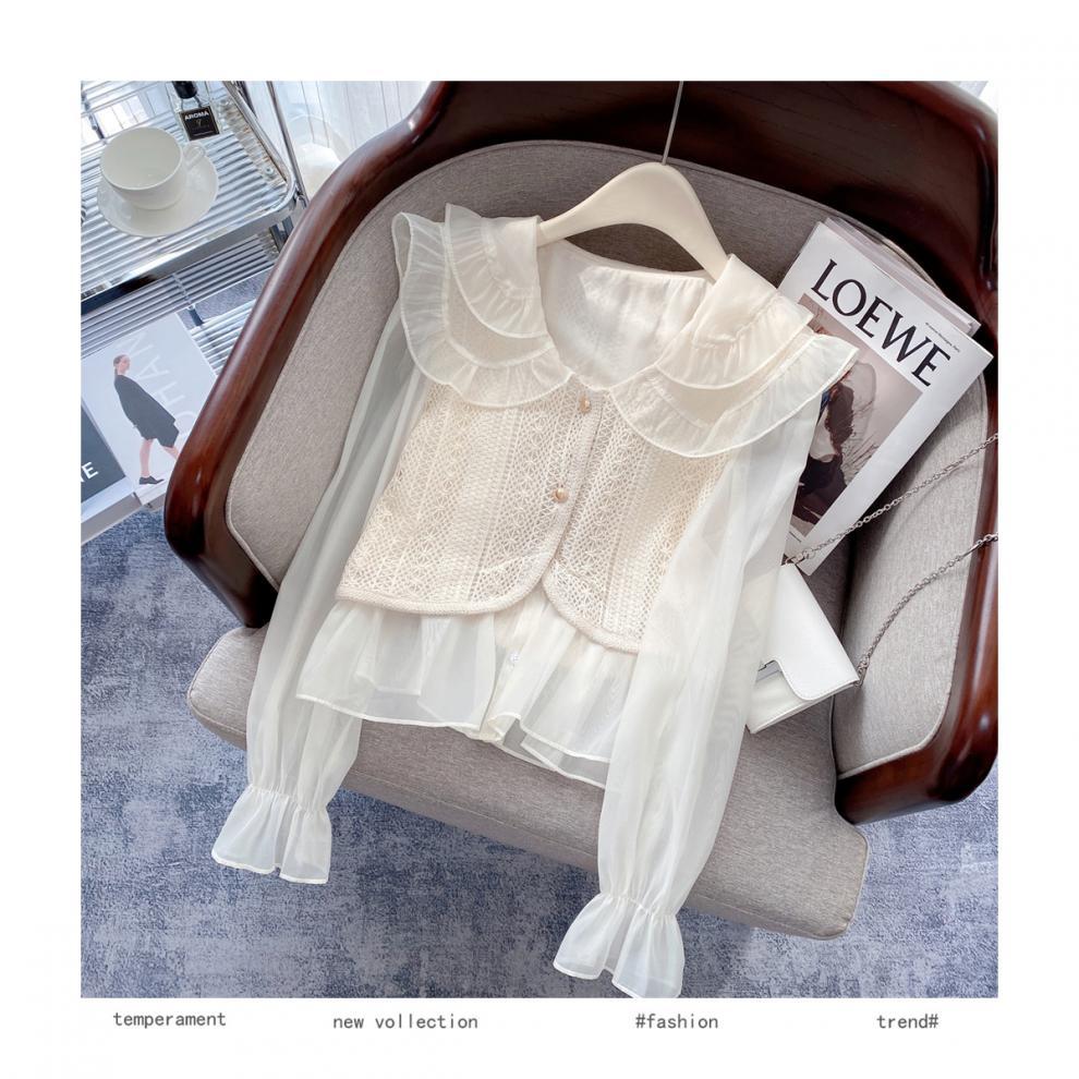 봄과 가을 프랑스 달콤한 더블 레이스 인형 칼라 셔츠 여성용 쉬폰 긴 소매 가짜 투피스 스티칭 조끼 탑