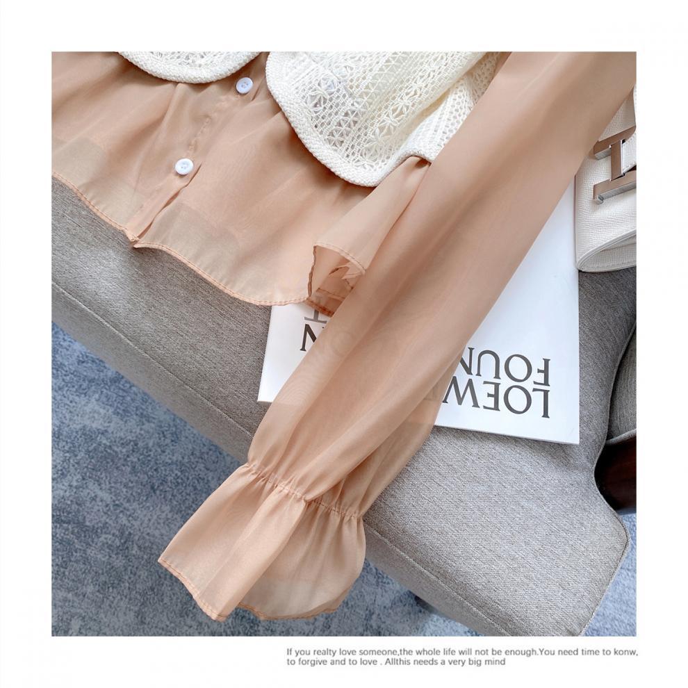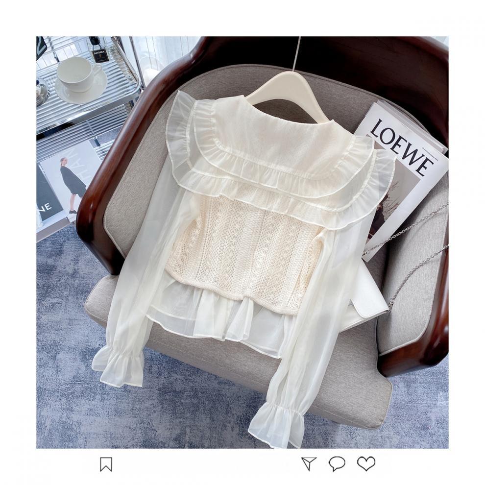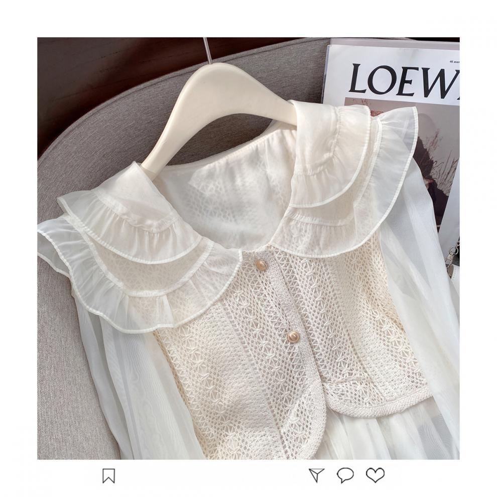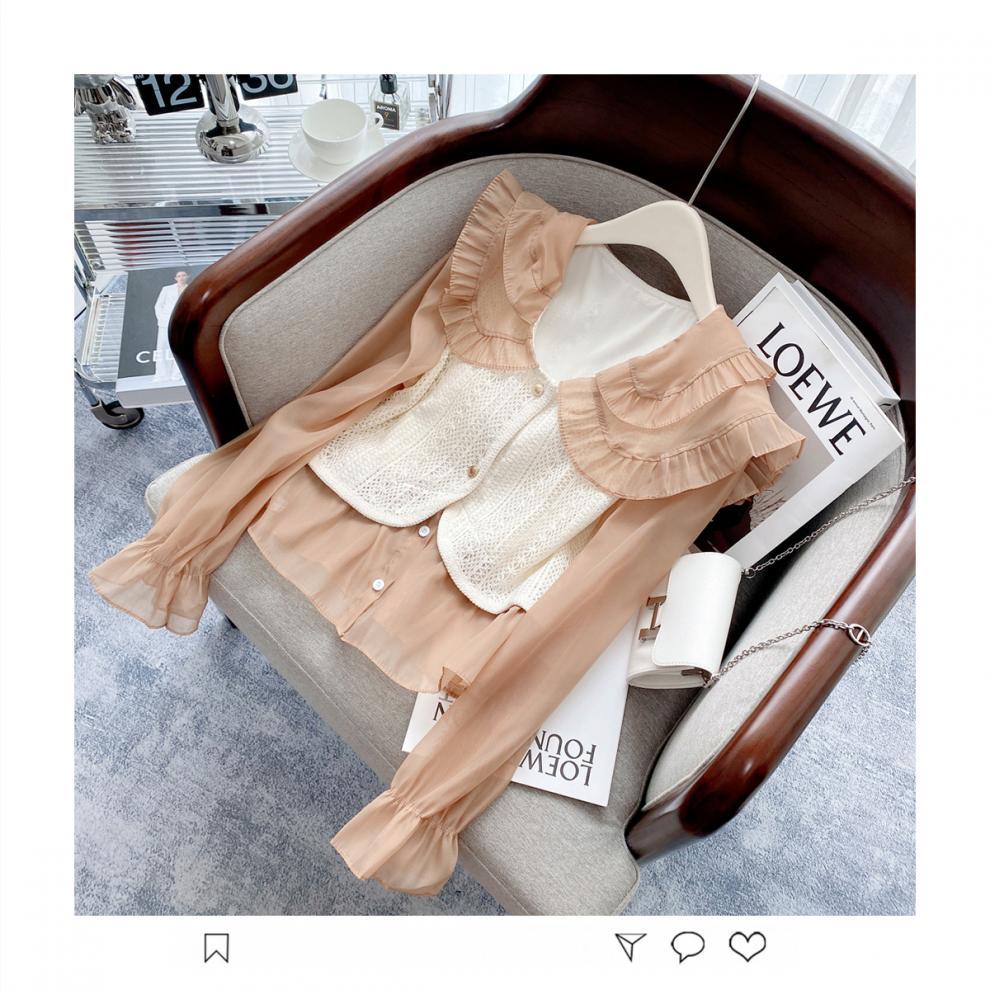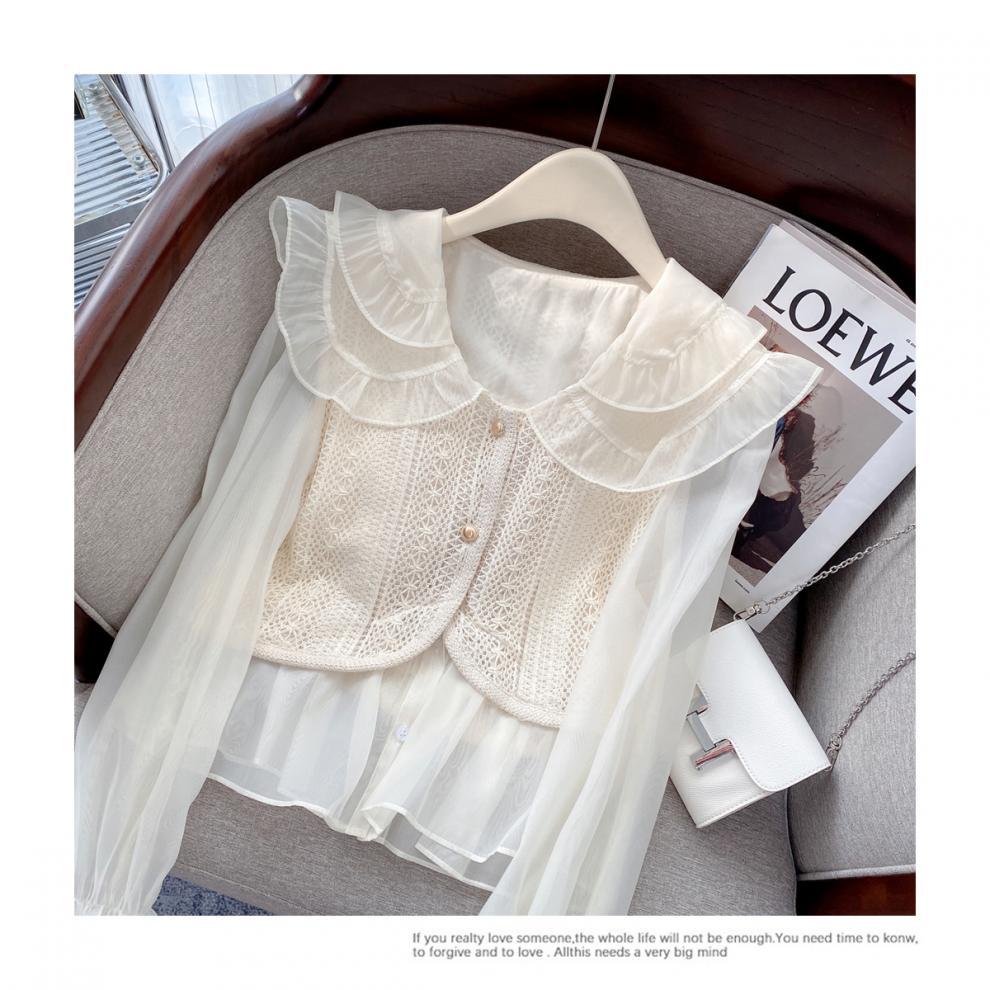 봄과 가을 프랑스 달콤한 더블 레이스 인형 칼라 셔츠 여성용 쉬폰 긴 소매 가짜 투피스 스티칭 조끼 탑