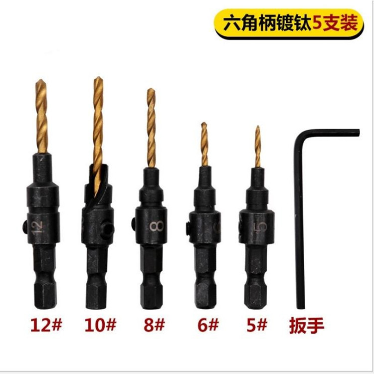 목공 카운터 침몰 드릴 고속 강철 6 피스 세트 티타늄 도금 육각형 생크 트위스트 드릴, 모따기 오프닝 및 통합 카운터 침몰 드릴