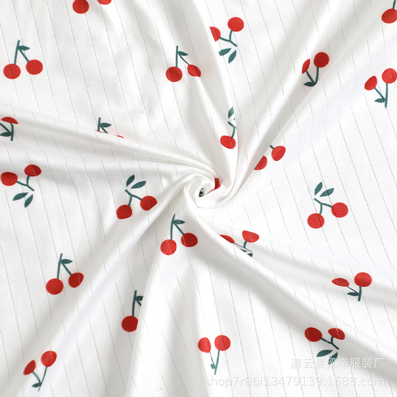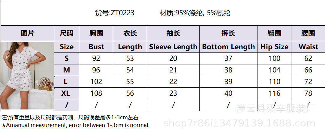 유럽과 미국 스타일의 여성 잠옷 가을과 여름 섹시한 V-Neck 레이스 체리 프린트 티셔츠 슬림 핏 반바지 홈 의류스토어 가기