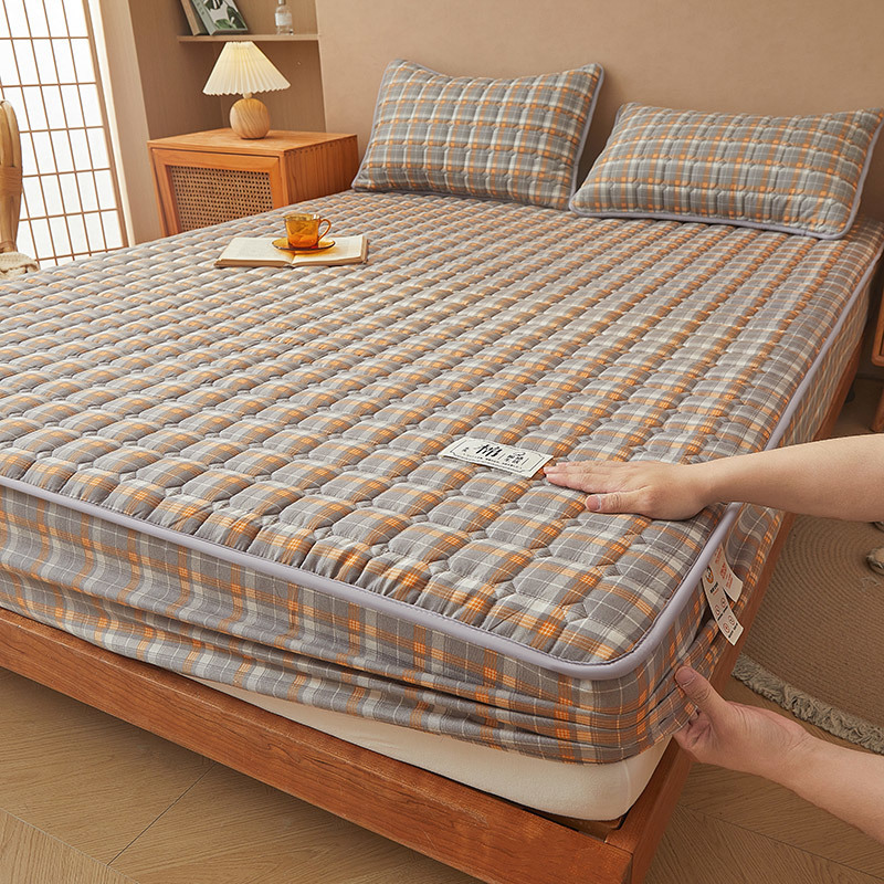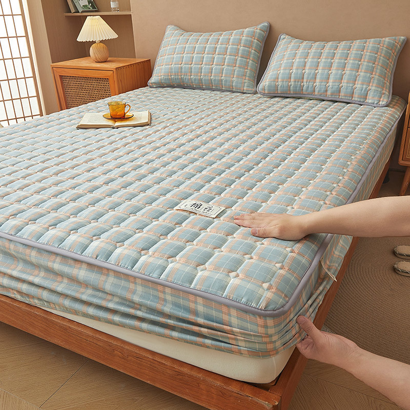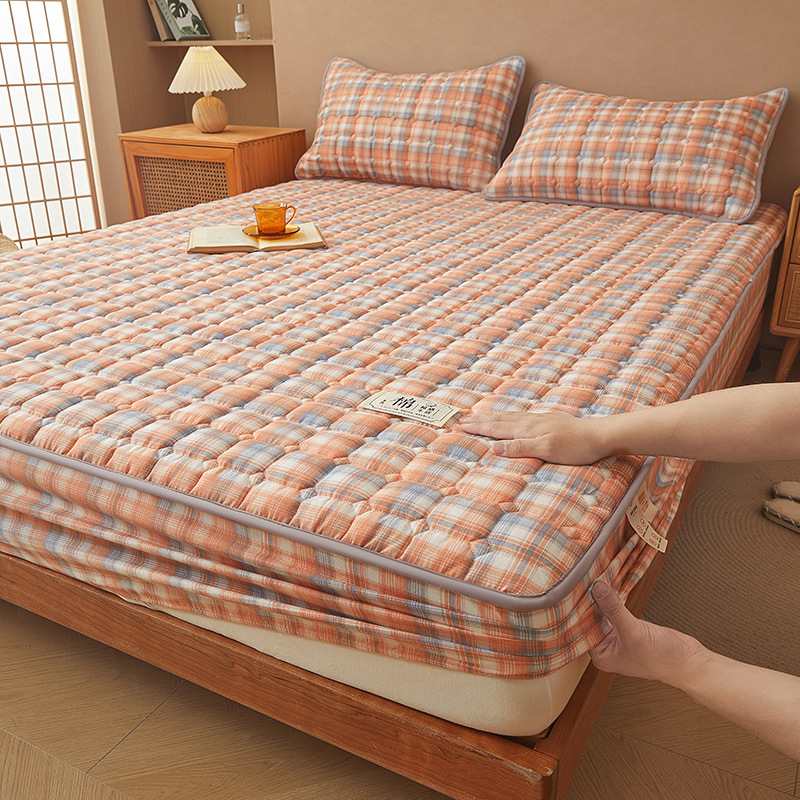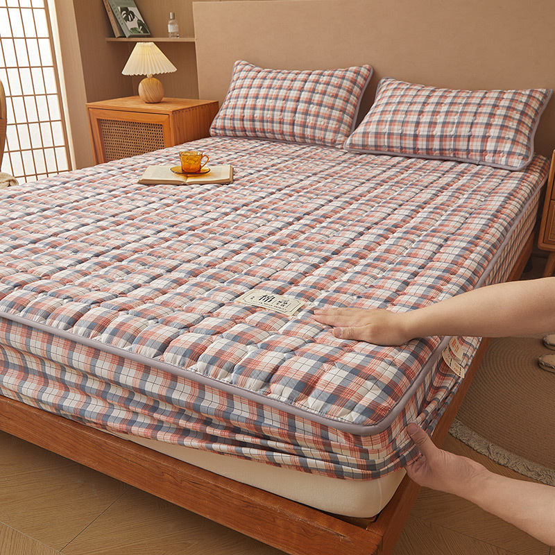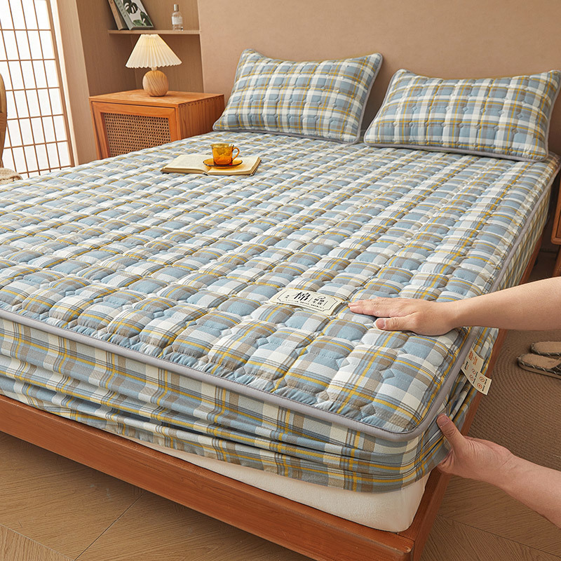 新款a类水洗棉夹棉床笠三件套格子印花床笠床罩席梦思保护套宿舍
