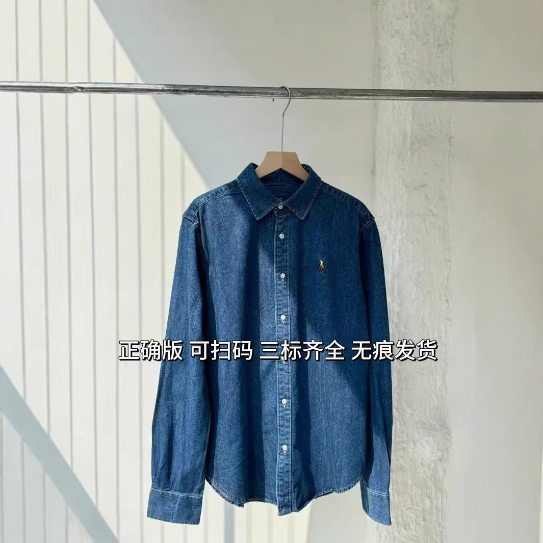 고급 버전은 QR 코드를 스캔할 수 있습니다. 플라프 포니 자수 클래식 올드 머니 스타일 캐주얼 데님 셔츠, 패셔너블하고 다재다능합니다.스토어 가기