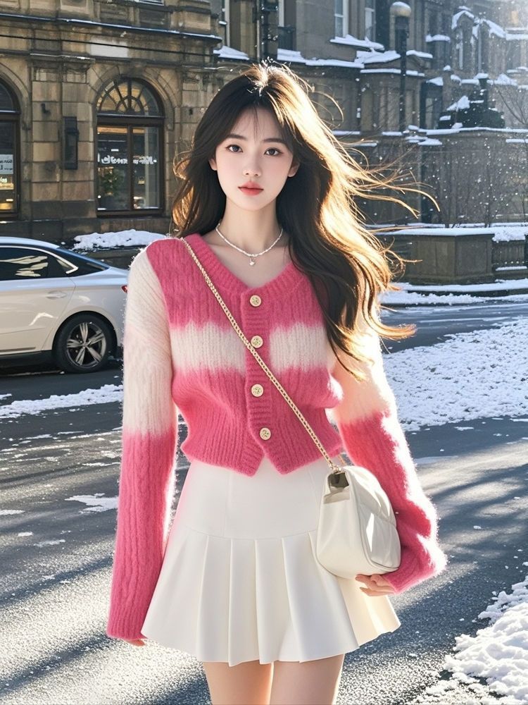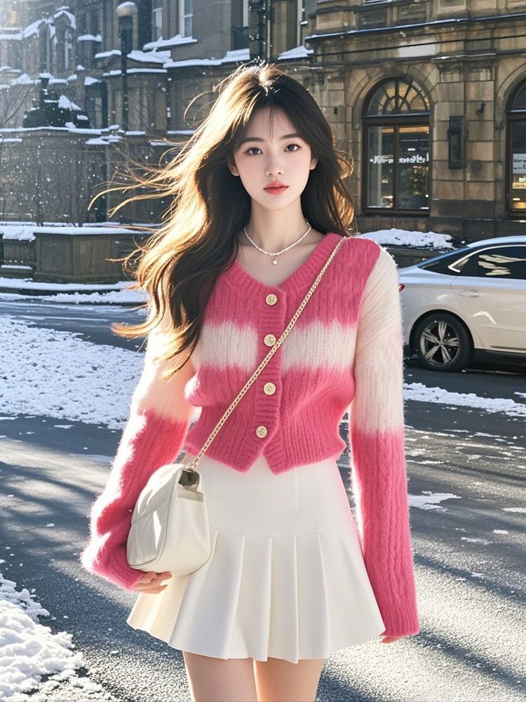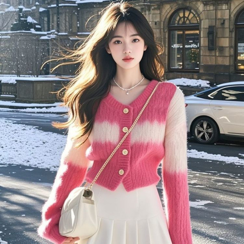 겨울 핑크 스웨터 여성의 2025 새로운 하이 엔드 감각 가을과 겨울 화이트 잘 생긴 긴 소매 니트 탑 코트스토어 가기