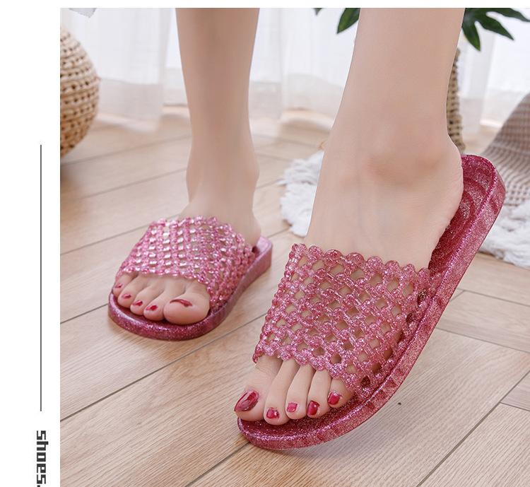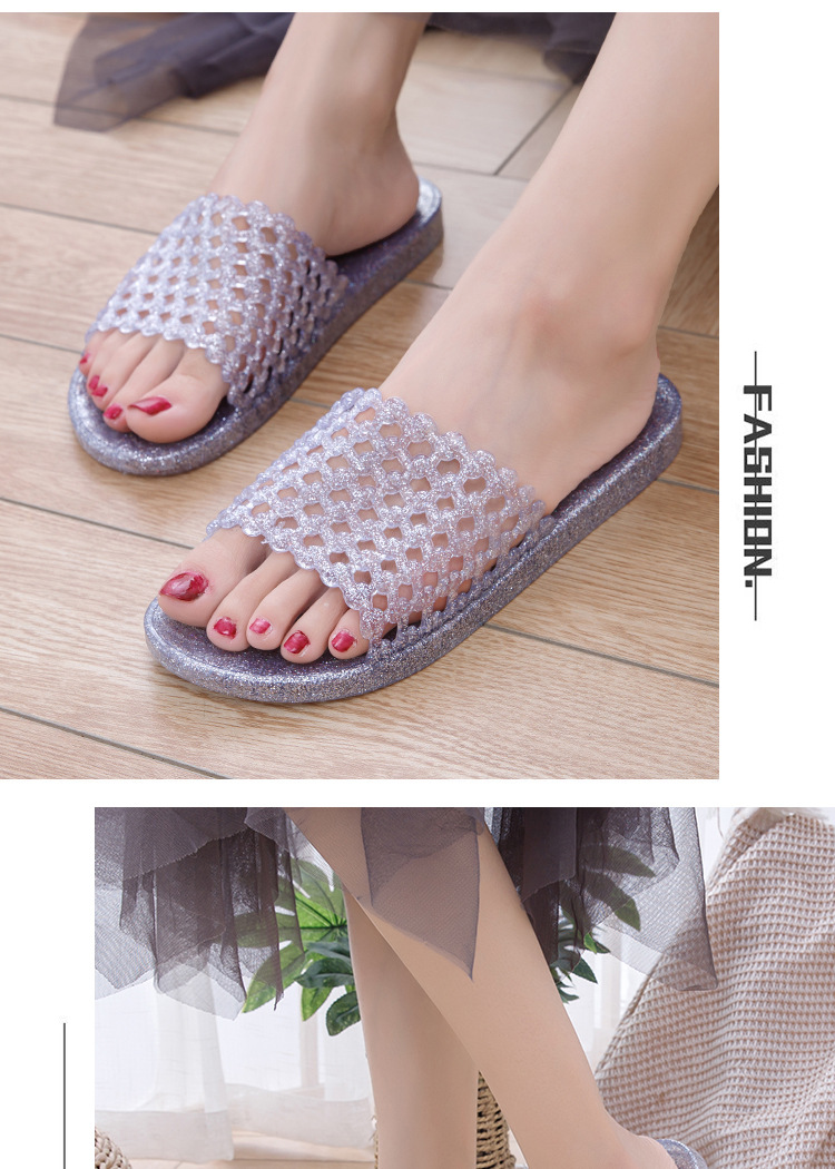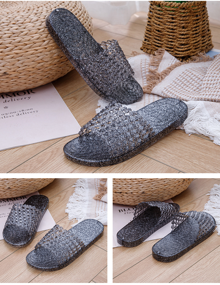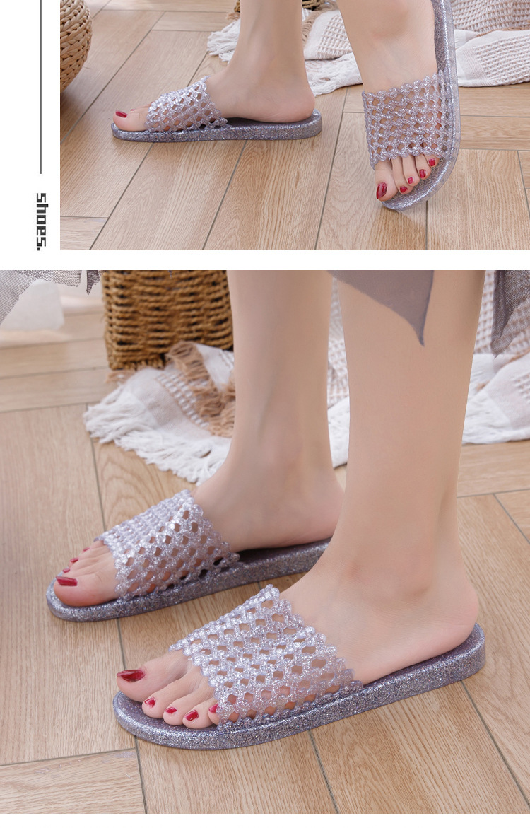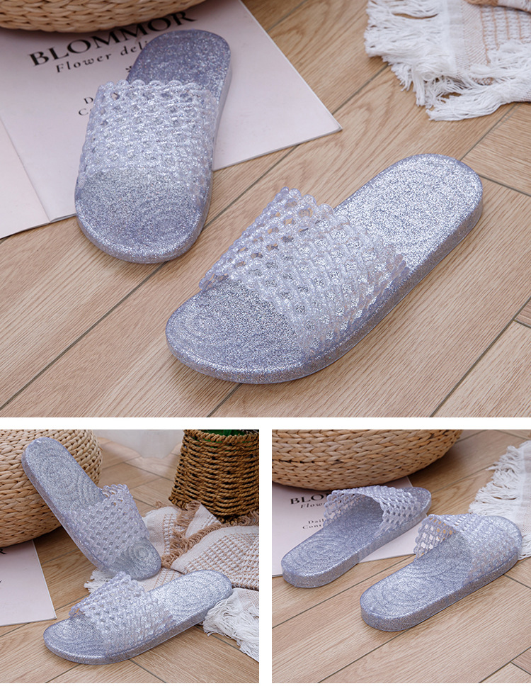 크리스탈 요리 접착제 슬리퍼 욕실 화장실 홈 미끄럼 방지 슬리퍼 여성용 여름 외부 투명 플랫 비 연소 발 착용