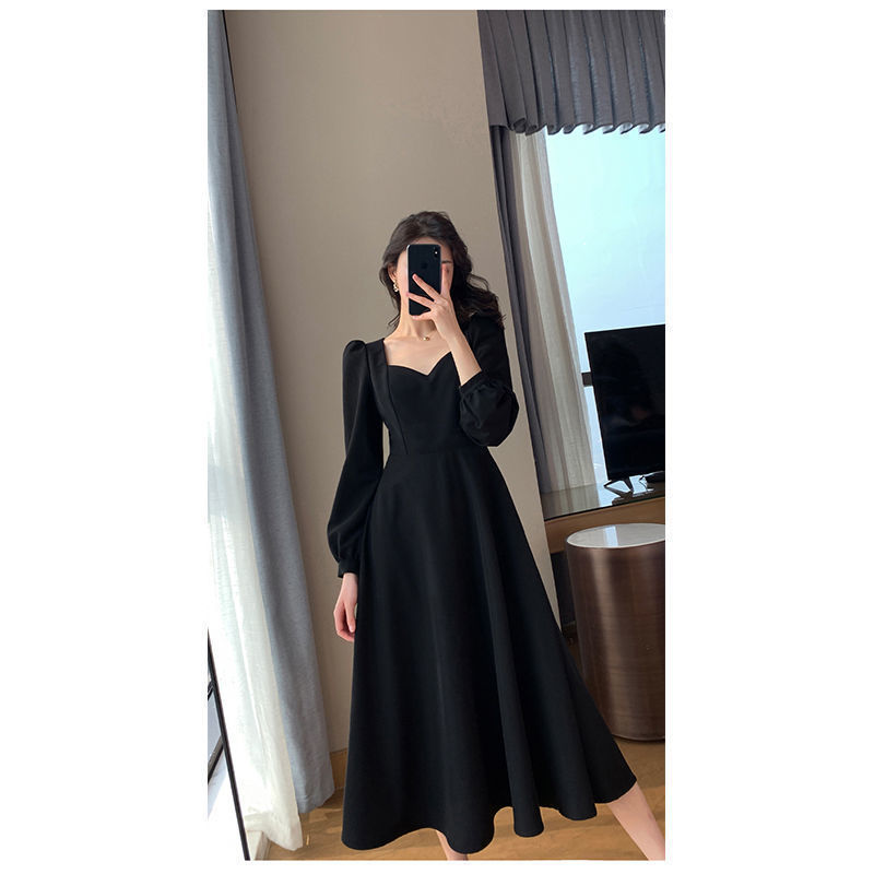 블랙 원피스 2025 긴 소매 새로운 우아한 타이트 허리 슬리밍 오버 더 니 롱 원피스 헵번 스타일 작은 블랙 원피스 슈퍼스토어 가기