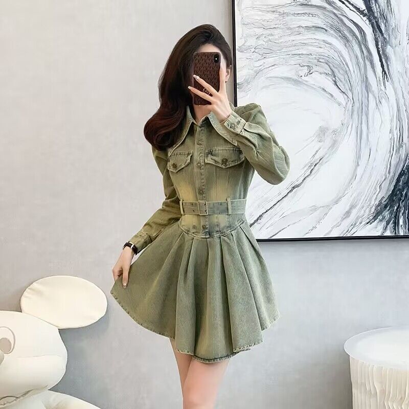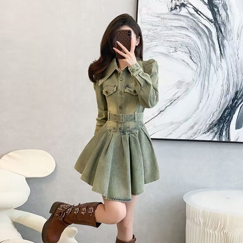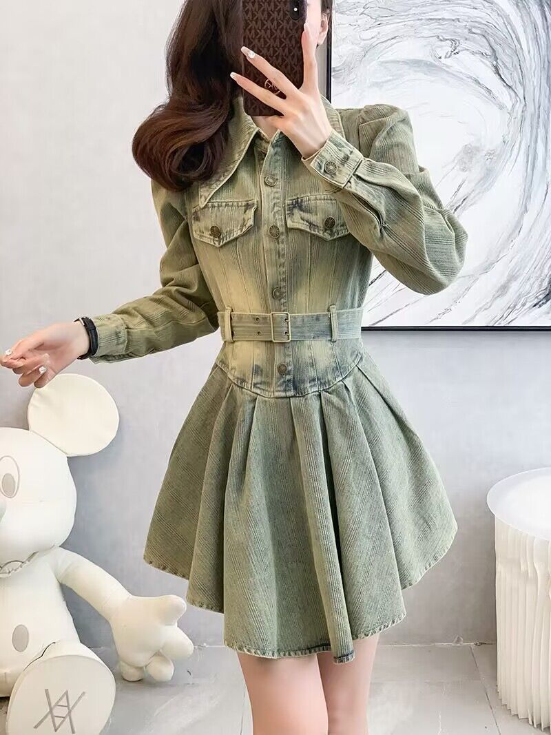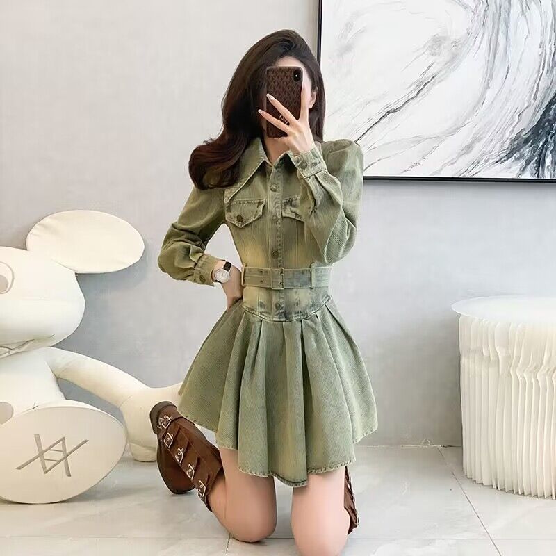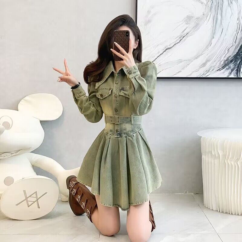 달콤하고 뜨거운 새로운 홍콩 스타일 빈티지 옷깃 패션 타이트 허리 거품 소매 짧은 데님 세탁 원피스 여성 원피스