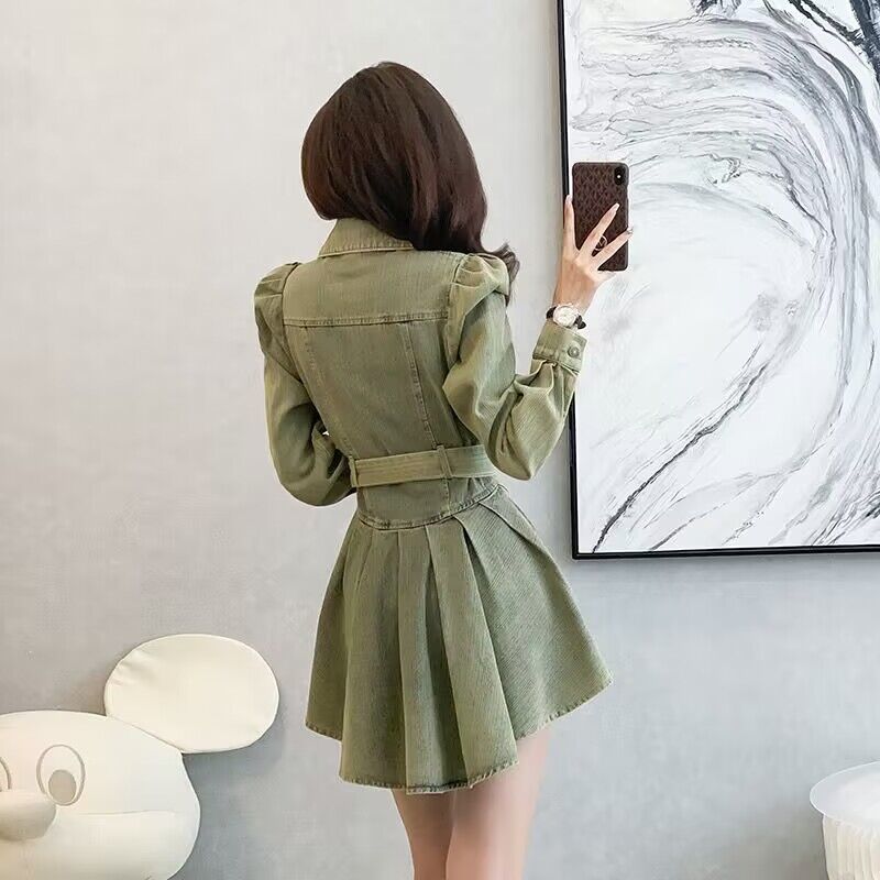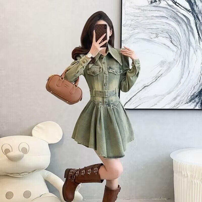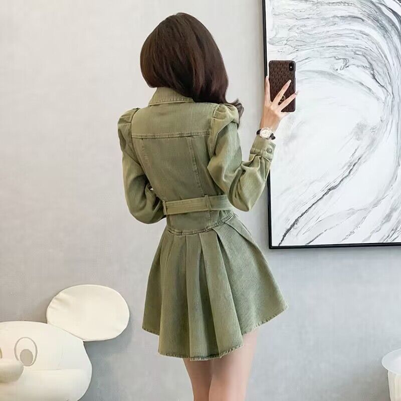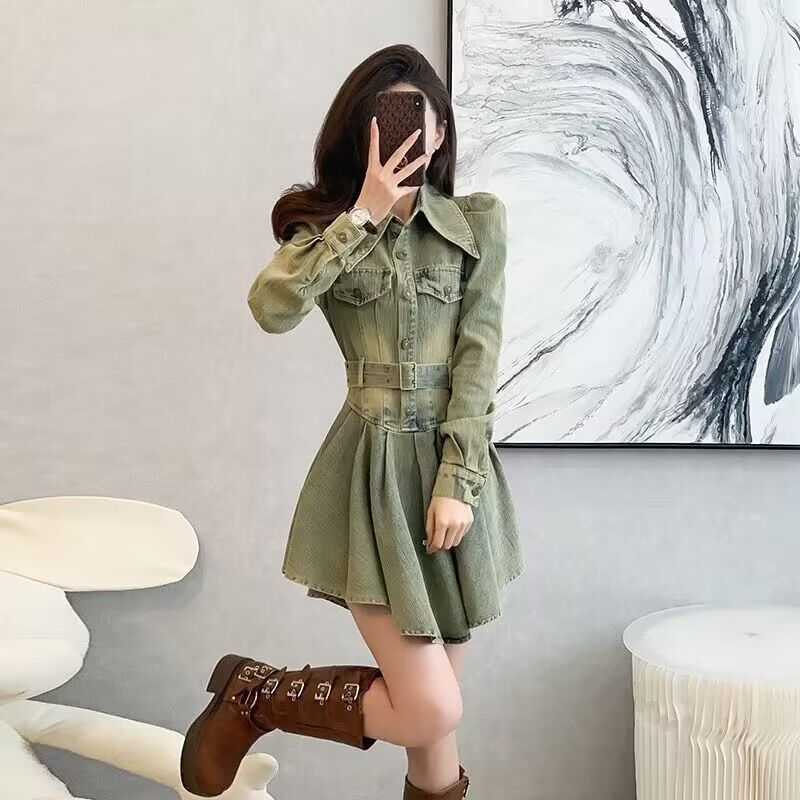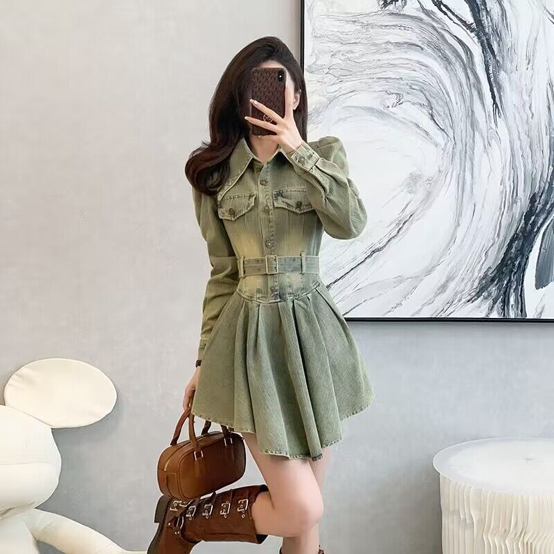 달콤하고 뜨거운 새로운 홍콩 스타일 빈티지 옷깃 패션 타이트 허리 거품 소매 짧은 데님 세탁 원피스 여성 원피스