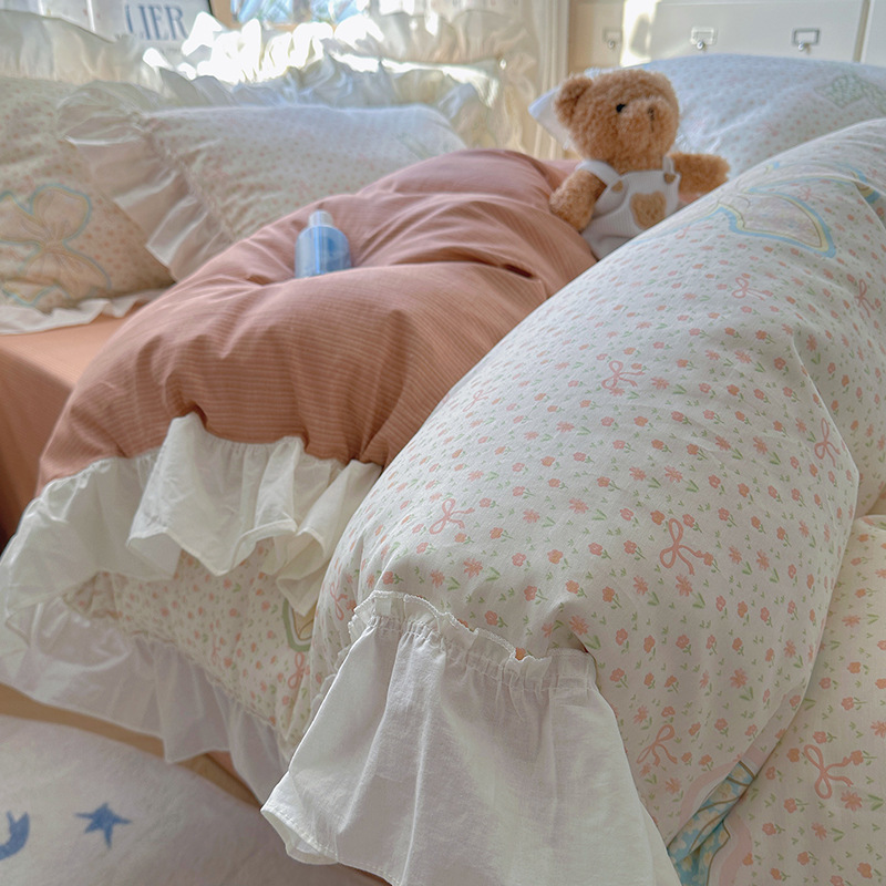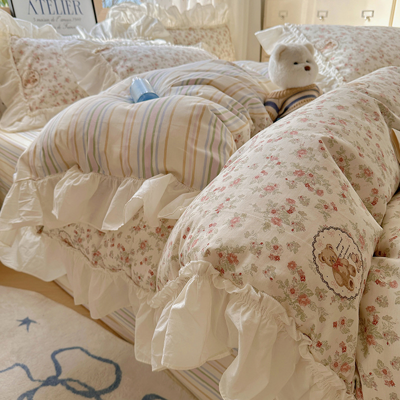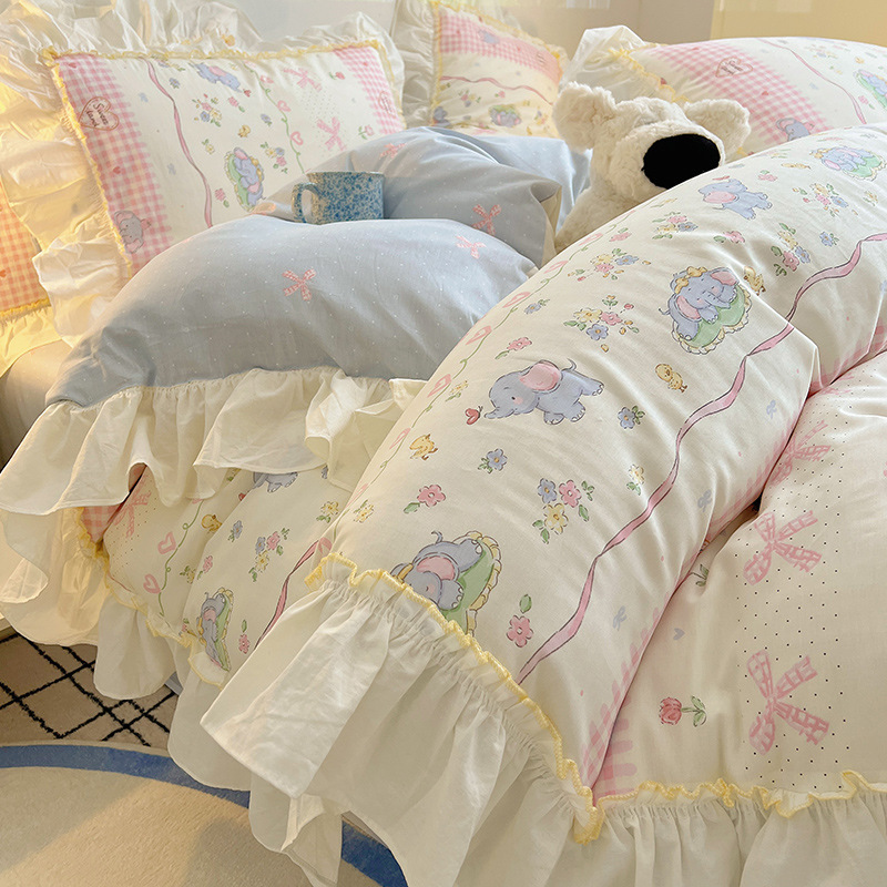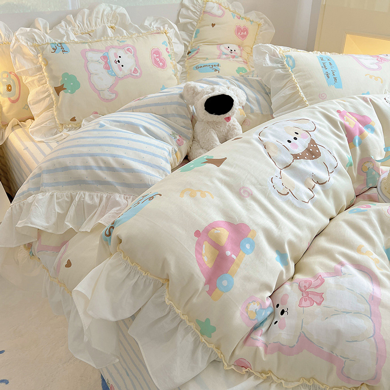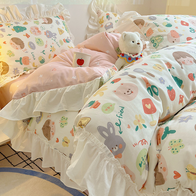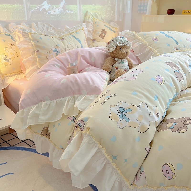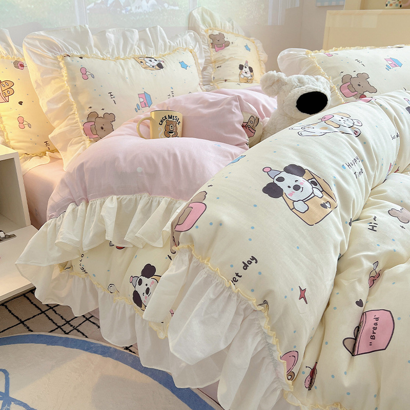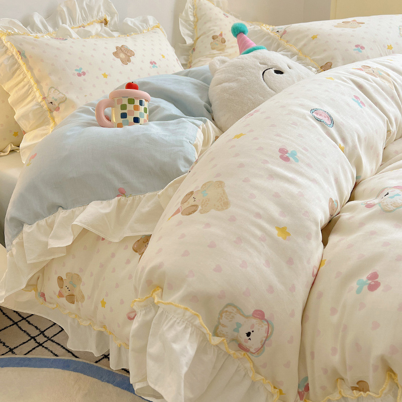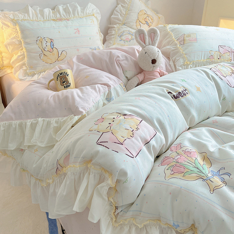 봄 만화 면화 4 피스 세트 Nantong 침구 레이스 코튼 침대 시트 퀼트 커버 3 피스 기숙사 이불 커버
