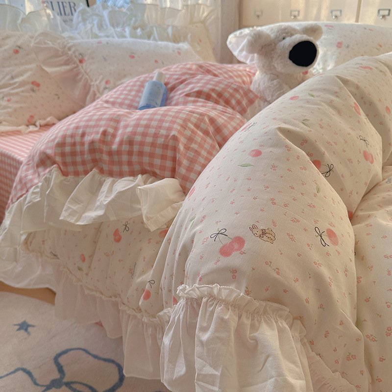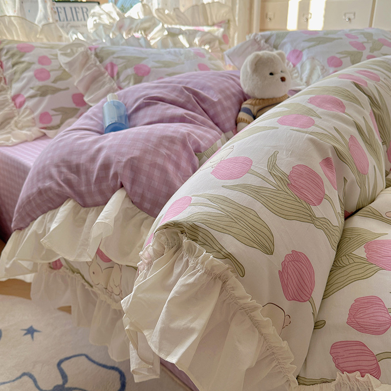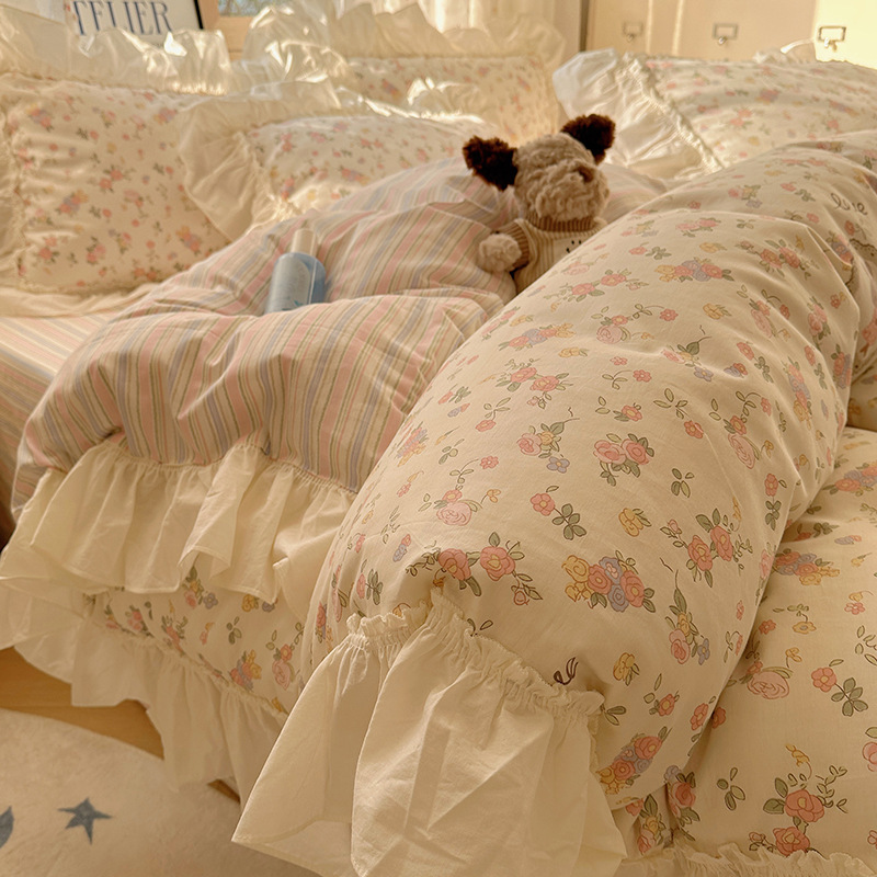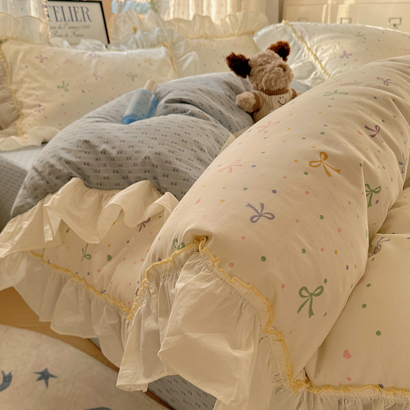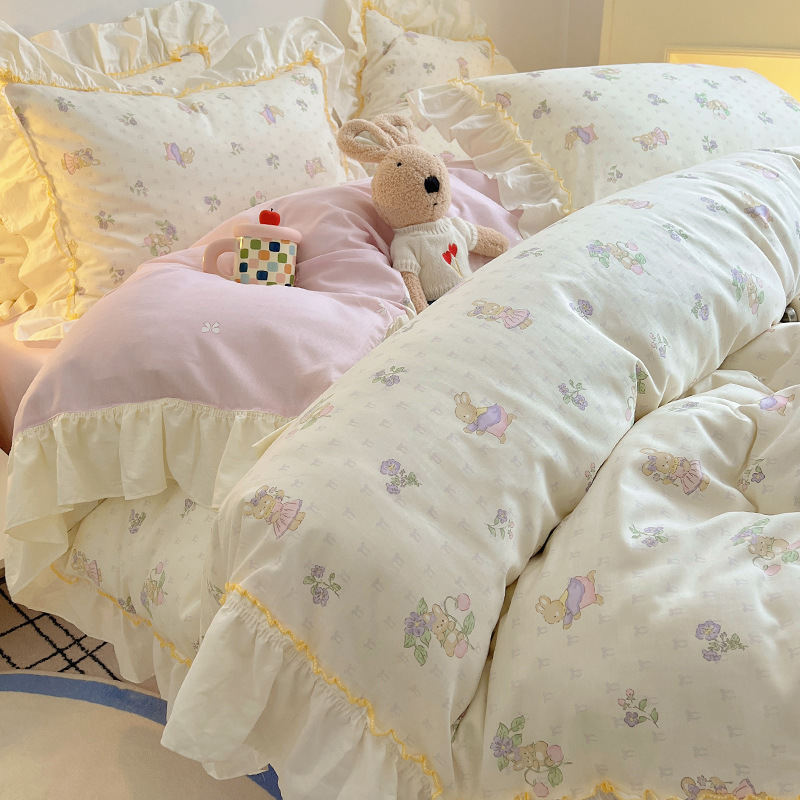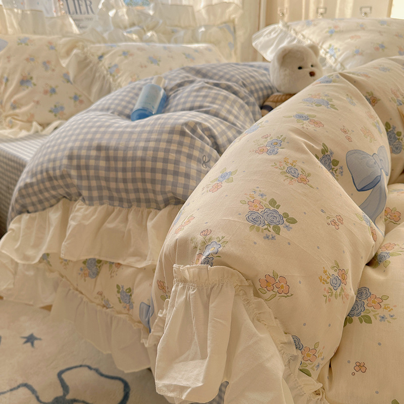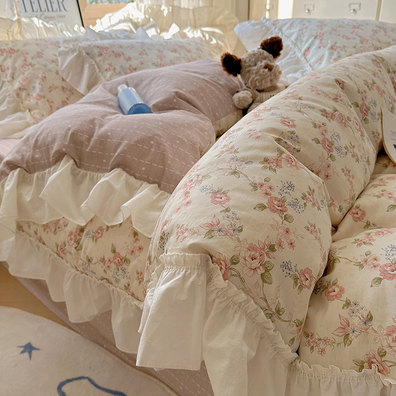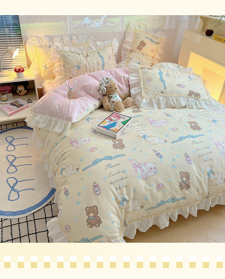 봄 만화 면화 4 피스 세트 Nantong 침구 레이스 코튼 침대 시트 퀼트 커버 3 피스 기숙사 이불 커버