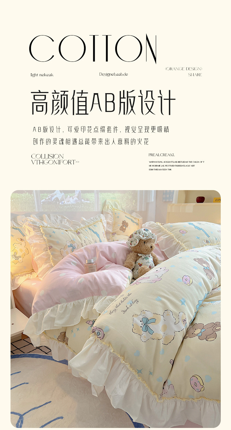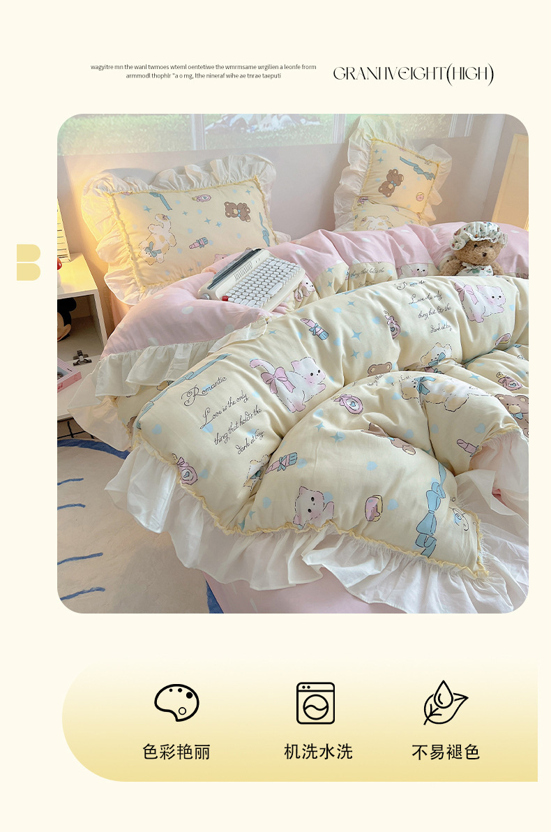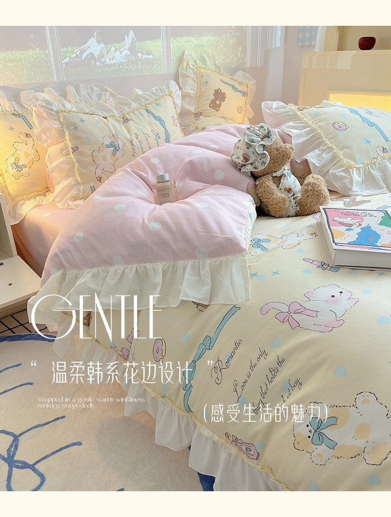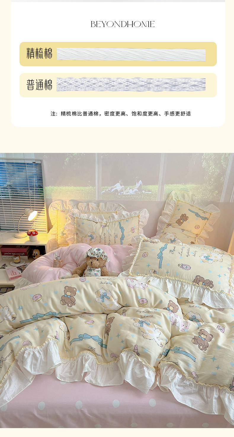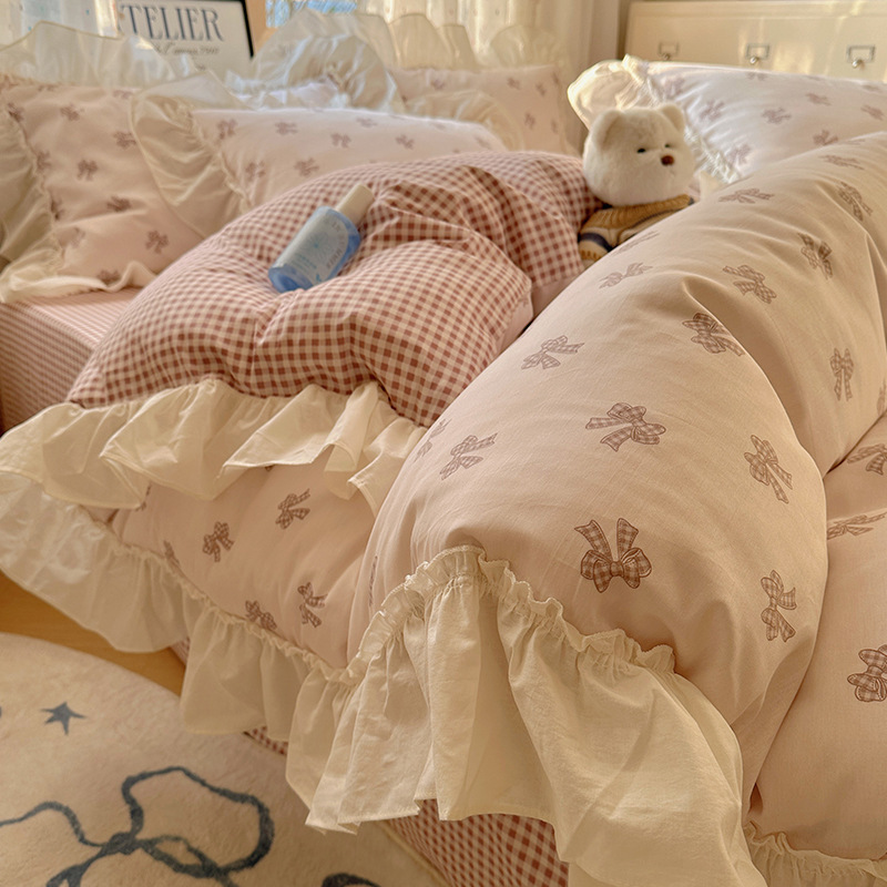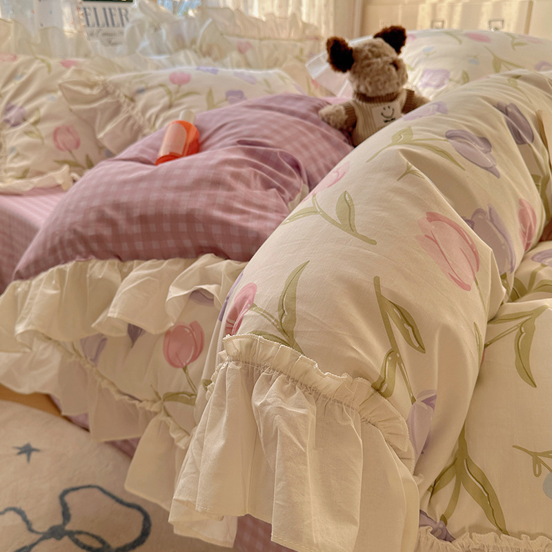 봄 만화 면화 4 피스 세트 Nantong 침구 레이스 코튼 침대 시트 퀼트 커버 3 피스 기숙사 이불 커버