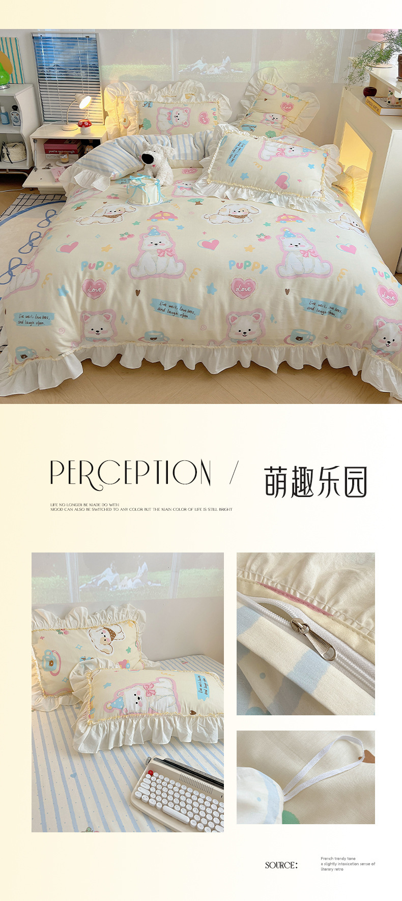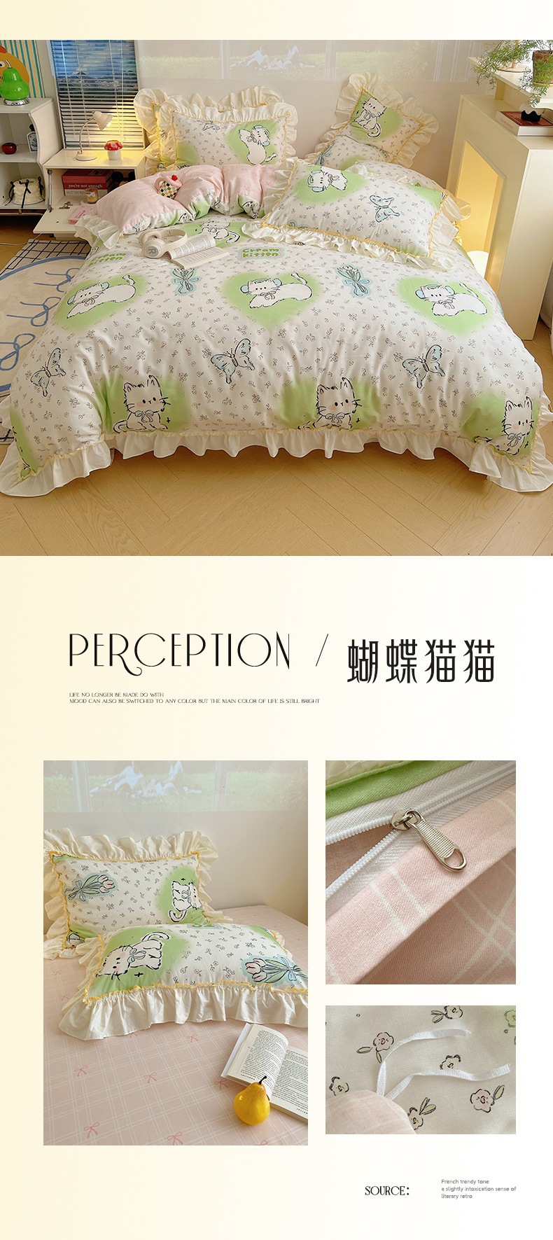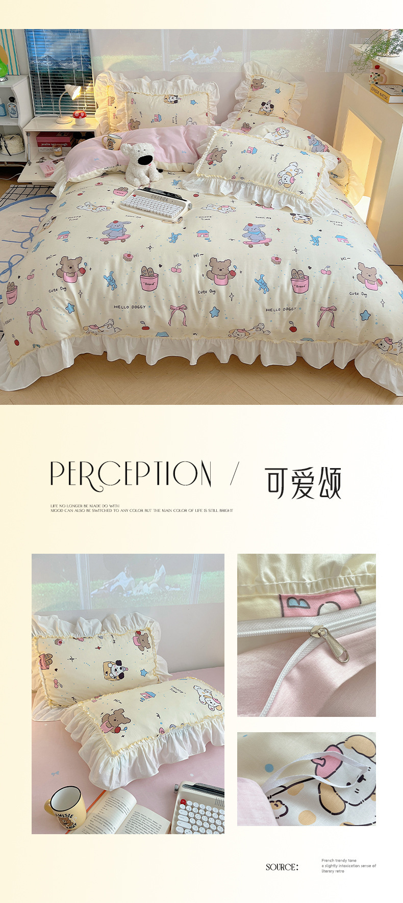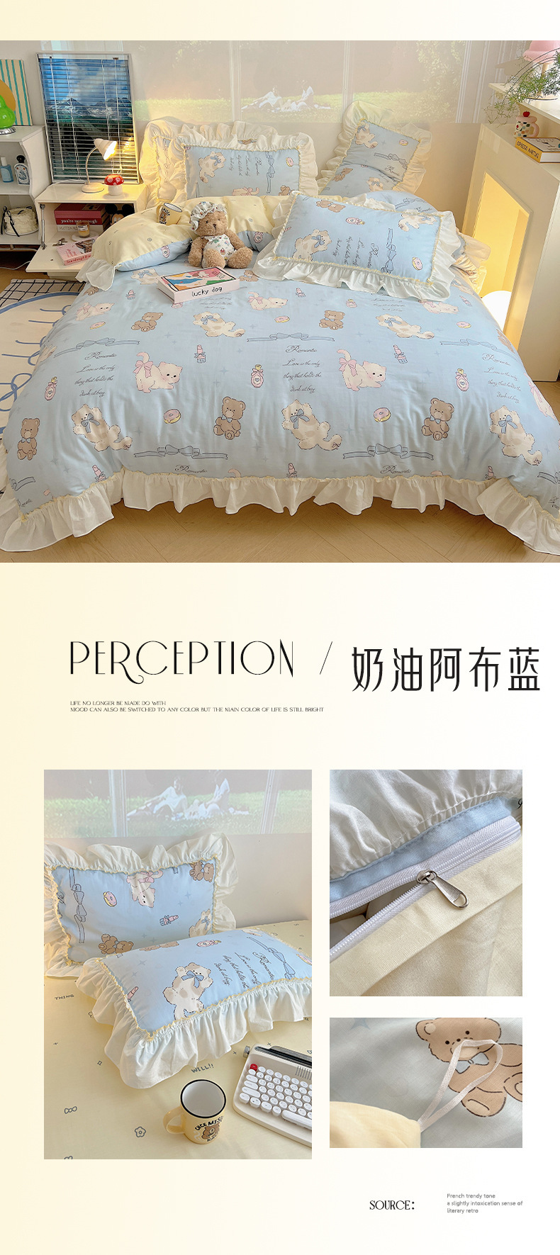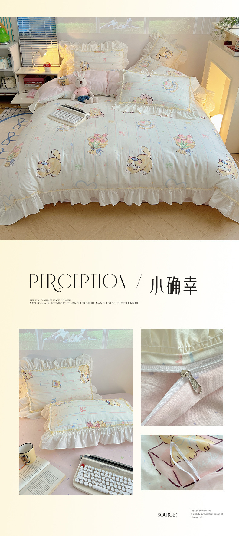 봄 만화 면화 4 피스 세트 Nantong 침구 레이스 코튼 침대 시트 퀼트 커버 3 피스 기숙사 이불 커버