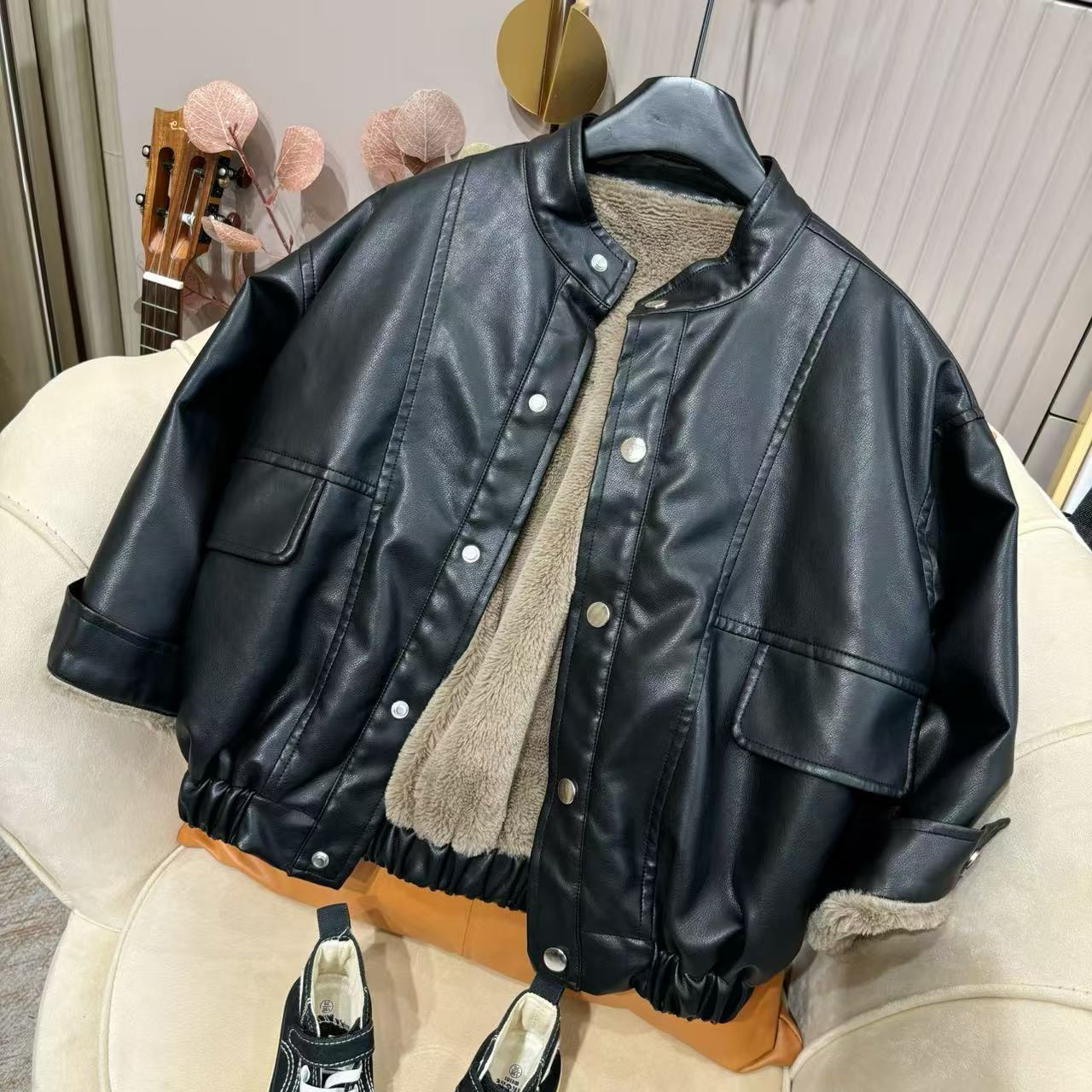 소년 가죽 의류 가을 겨울 2025 새로운 중대형 어린이 튀김 거리 더피 잘 생긴 소년 가을 옷 어린이 기모 재킷 코트