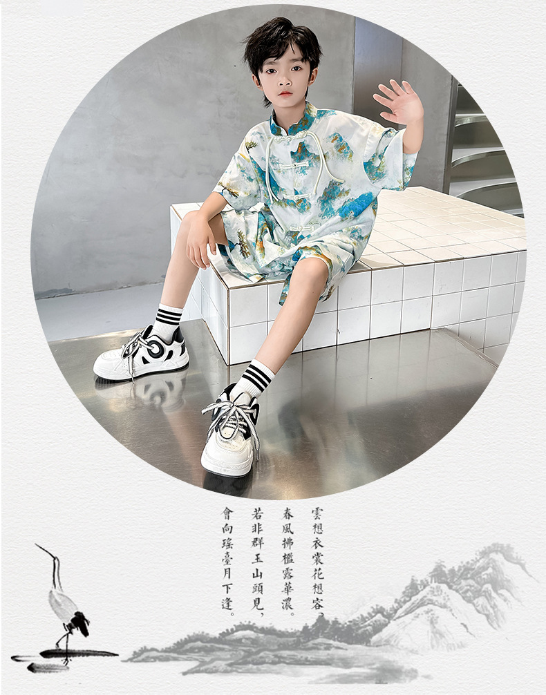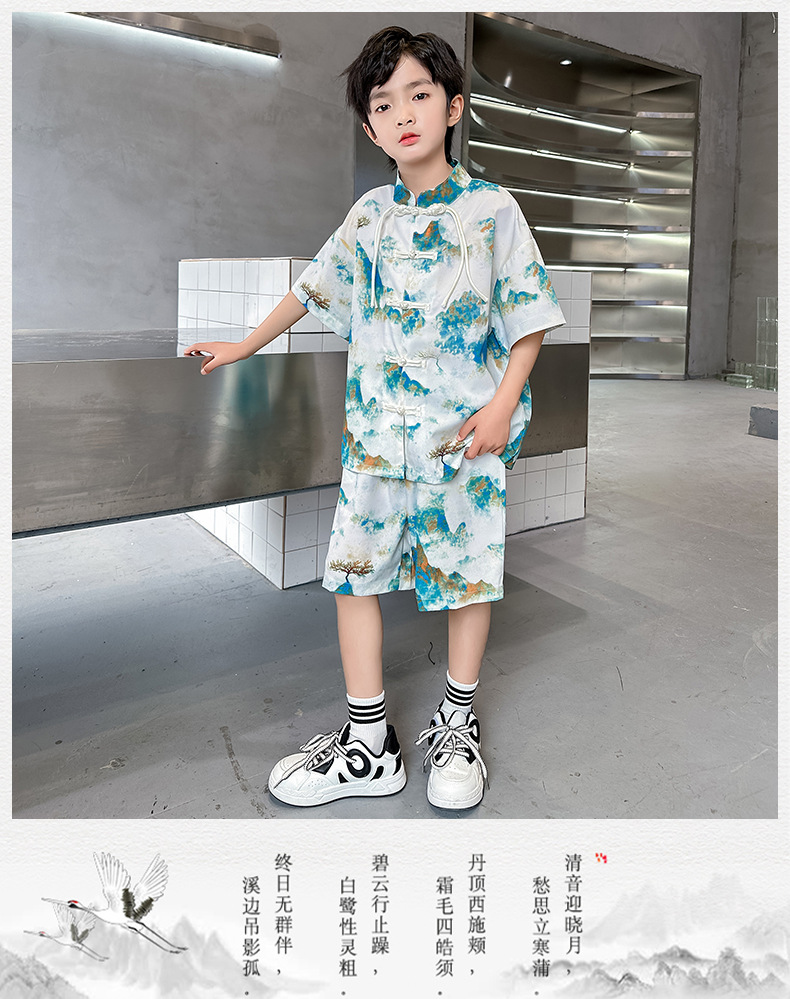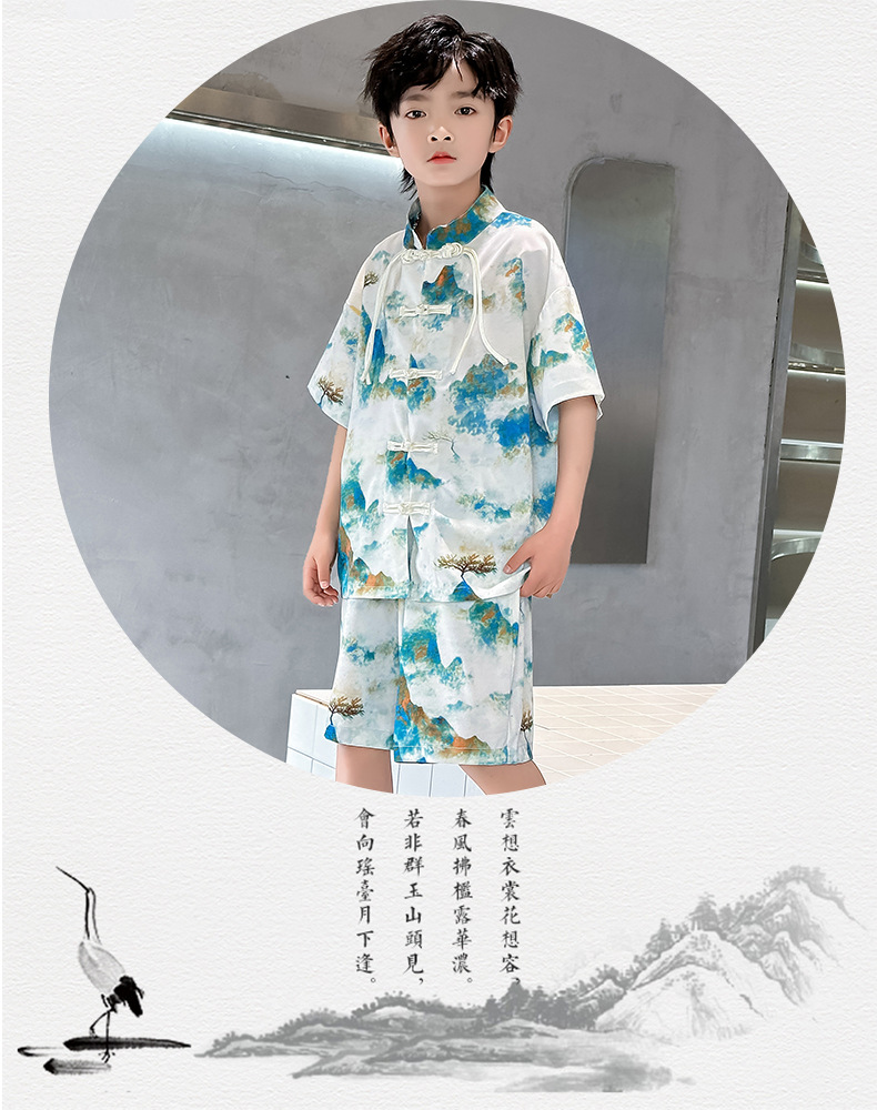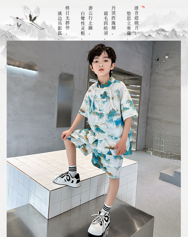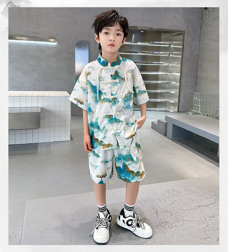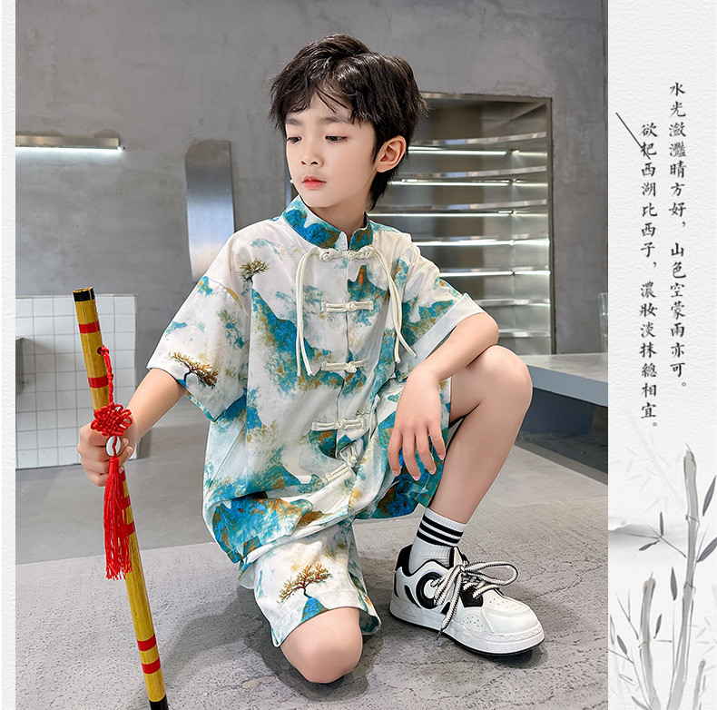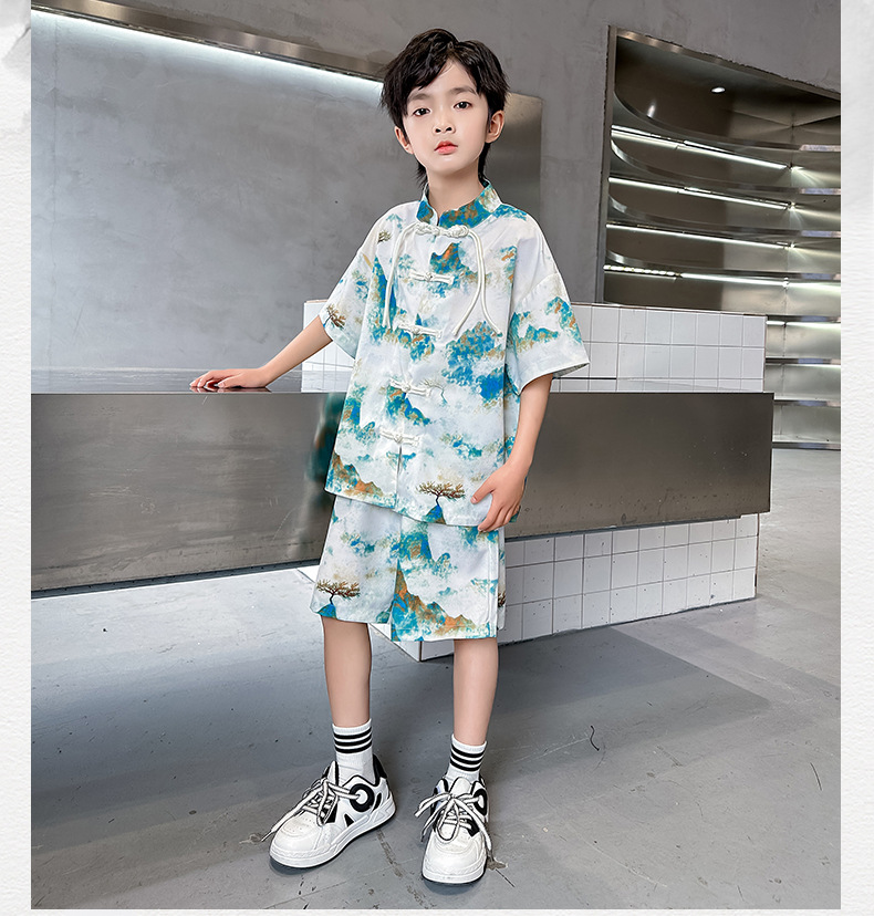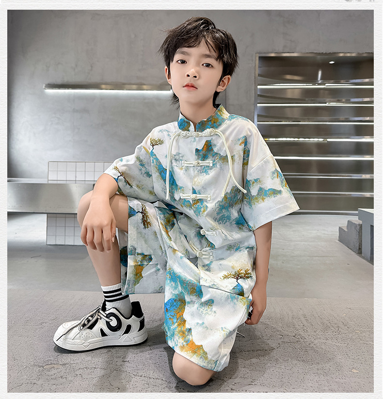 중국 스타일 소년 중국 2025 한푸 반팔 세트 탕 세트 소년을위한 어린이 새 여름 투피스 유행 세트