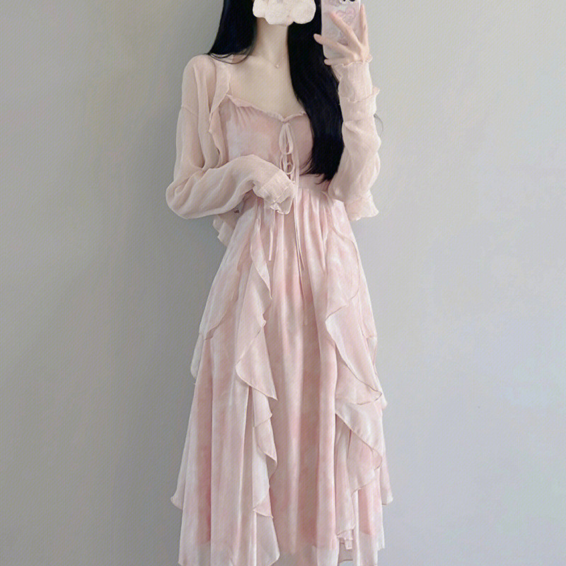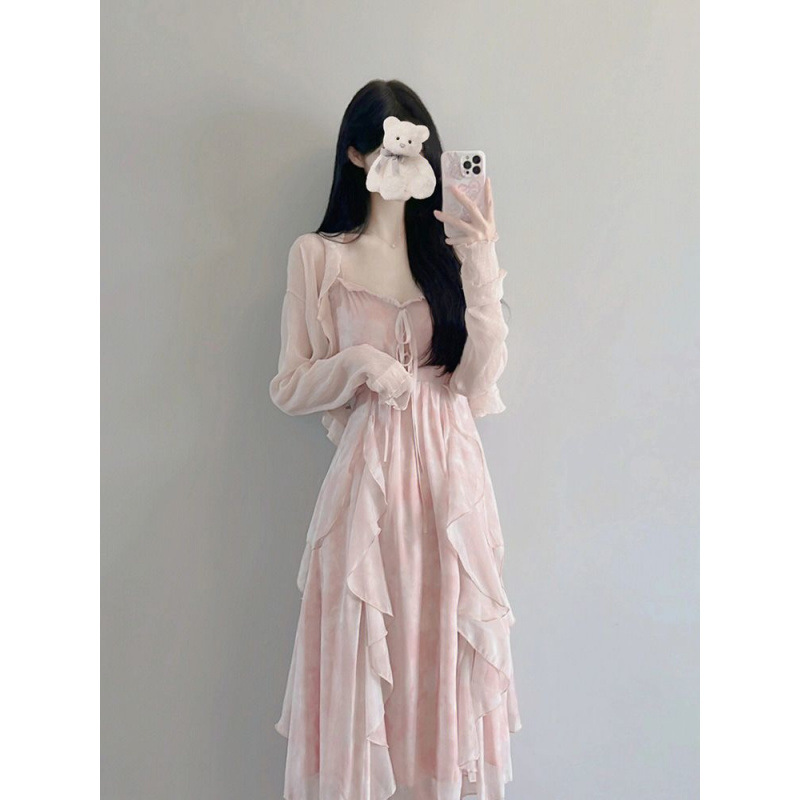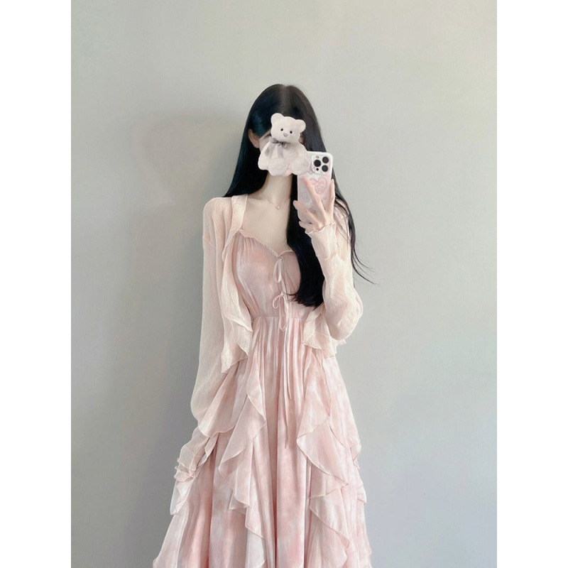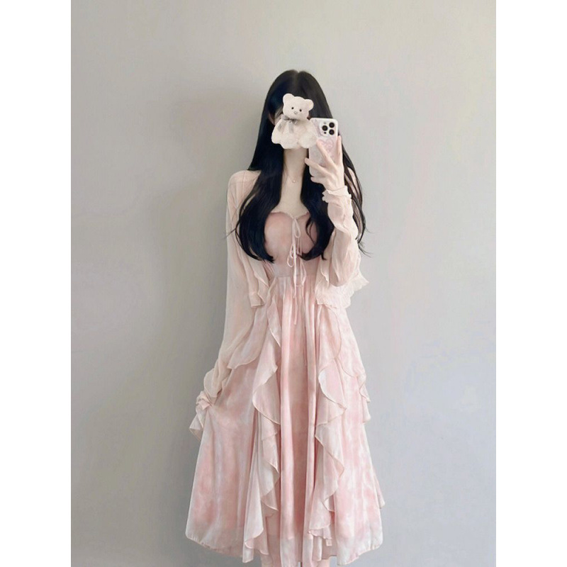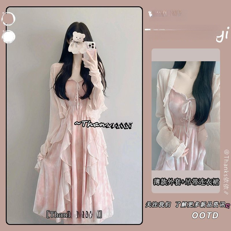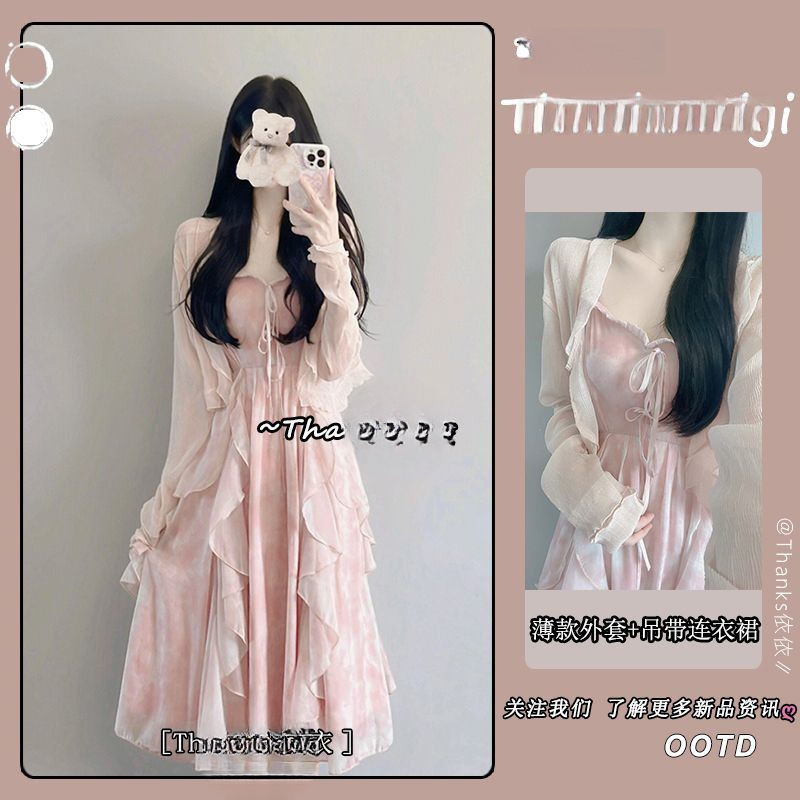 슈퍼 요정 원피스 이른 봄 새 2025 여자 얇은 재킷 달콤한 허리 슬링 긴 원피스 세트