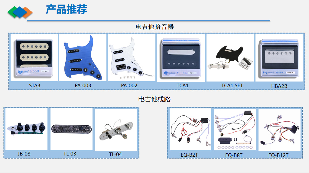 辉隽科技有限公司是一家专业生产销售各种乐器及配件等周边产品的公司。公司集研发、生产、销售为一体,拥有完整科学的质量管理体系。我们的产品包括各种乐器、电吉他拾音器、木吉他拾音器、小提琴拾音器、大提琴拾音器、尤克里里拾音器、各种民族乐器拾音器、箱鼓非洲鼓卡洪鼓拾音器、木吉他拾音棒、吉他无线发射接收器、吉他效果器、吉他音箱、吉他琴颈-琴弦-琴桥-弦钮等各种电声乐器周边产品。