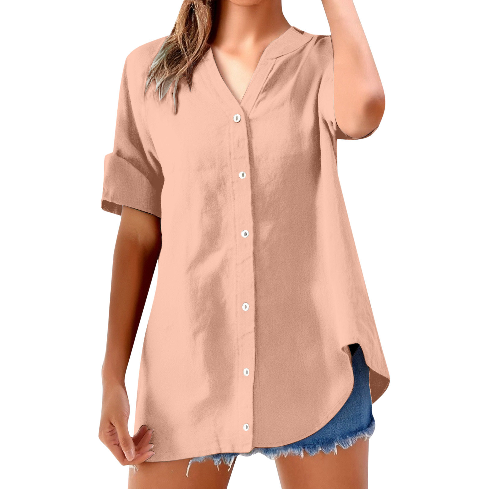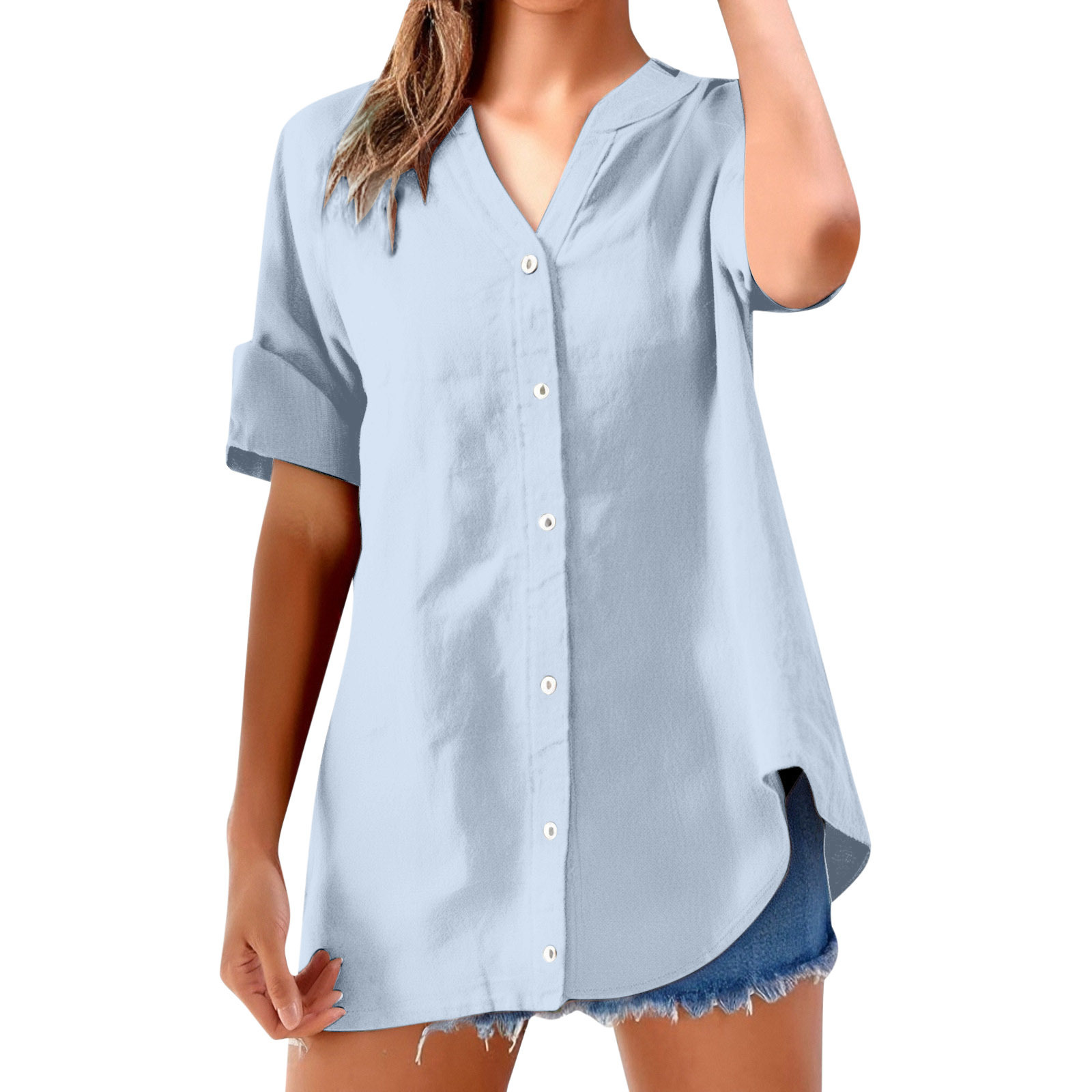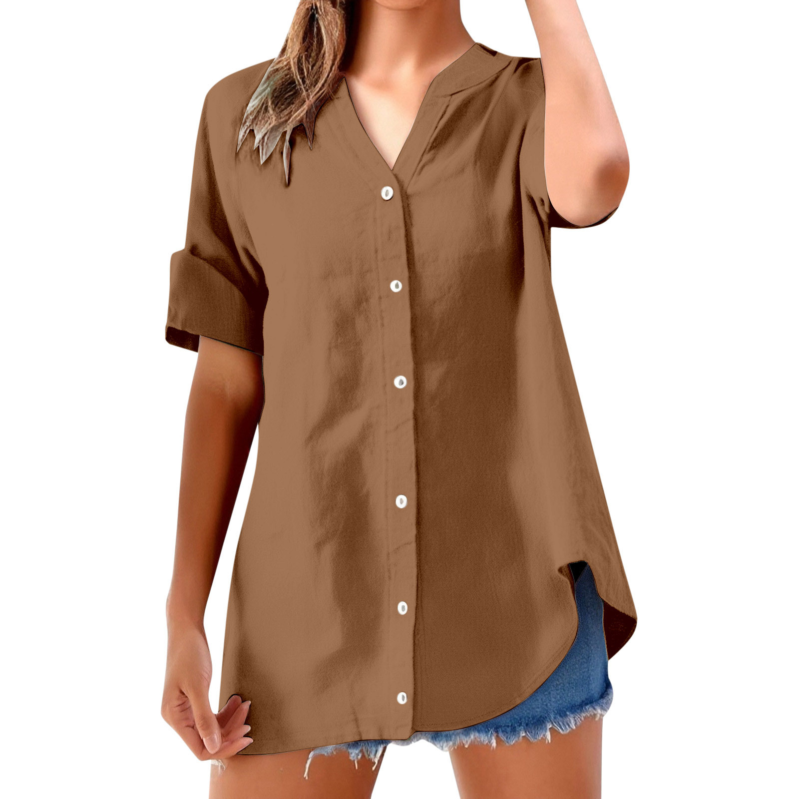 2025 아마존 국경 여성 캐주얼 솔리드 컬러 칼라 버튼 짧은 소매 셔츠 탑 여성스토어 가기