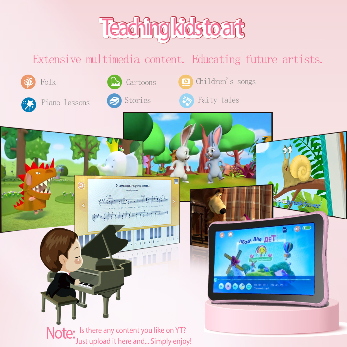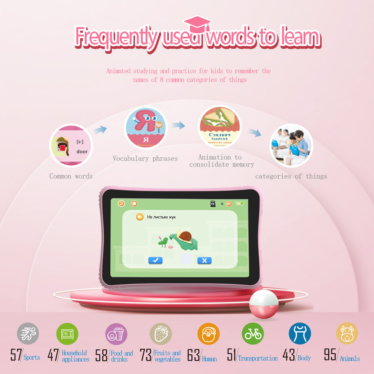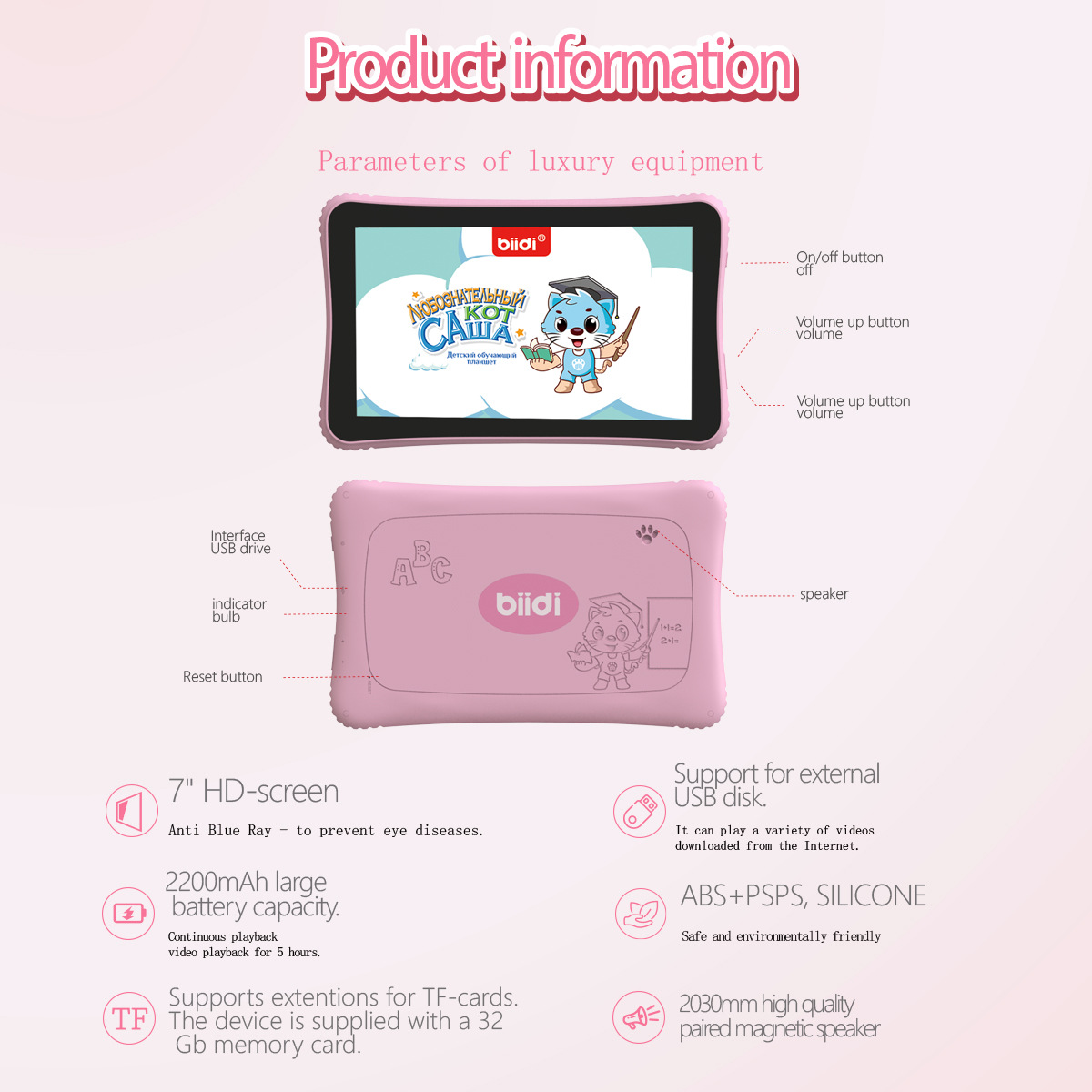 儿童平板电脑早教机玩具“猫萨沙”-最好的礼物给未来的明星。这款儿童平板电脑早教机是为3至8岁的儿童设计和设计的。早教机已经下载了内容,家长可以在收到后立即使用所有功能,而无需下载任何软件。萨沙猫到底在做什么?1-玩具发展音乐听力,创造力和表演技巧,使其成为家庭聚会的绝佳帮手。2、丰富的多媒体内容。猫萨沙预先加载了大量的资源。包括:故事,儿童歌曲,故事,卡通等等。家长还可以下载自己喜欢的歌曲、故事和卡通。3-你的孩子将能够学习英语字母、单词、数字、颜色等4-培养孩子的观察力,思维,比较分析和空间感知。猫萨沙可以教你的孩子识别每一个字母的书面和手写形式,并教他们以正确的顺序写作。萨沙猫使用蒙台梭利方法在15个类别中学习单词和语法:动物、交通、蔬菜和水果、运动等。与传统的卡片学习不同,卡片需要父母阅读单词,萨沙猫可以发音单词,孩子可以重复单词并自学。购买早教机相当于购买20多套包含1000多个主题的学习卡。猫萨沙是一个视频播放器,互动电子钢琴。猫萨沙有许多其他功能,这个儿童发育玩具会给孩子和父母带来很多快乐!送给男孩和女孩新年、生日、儿童节的好礼物