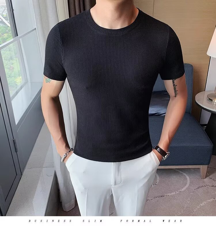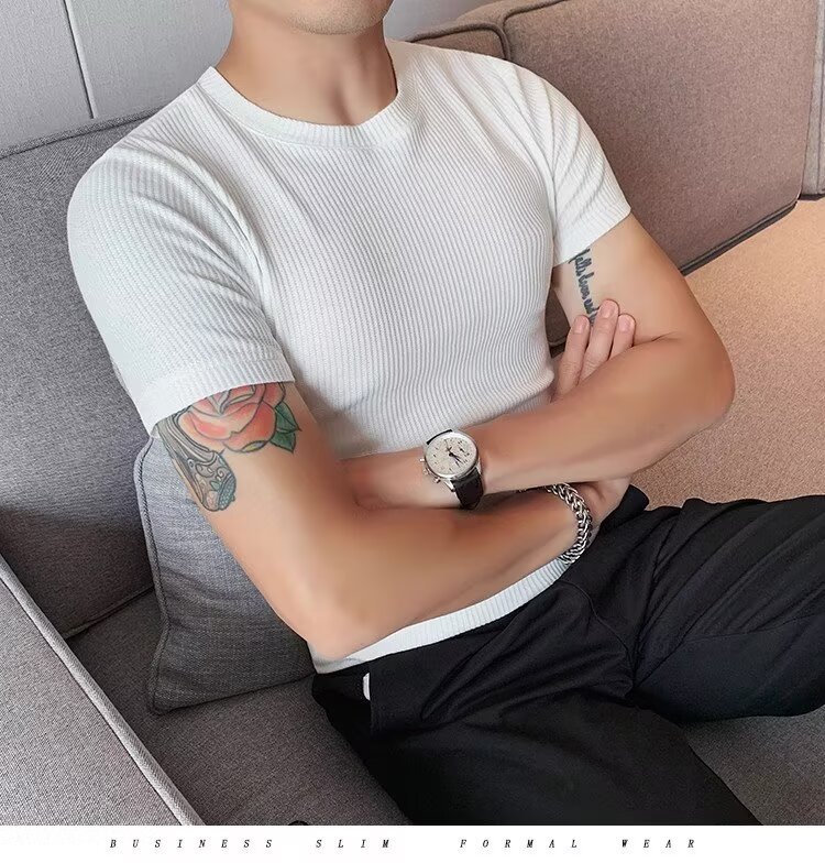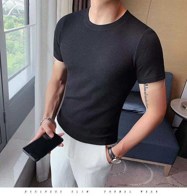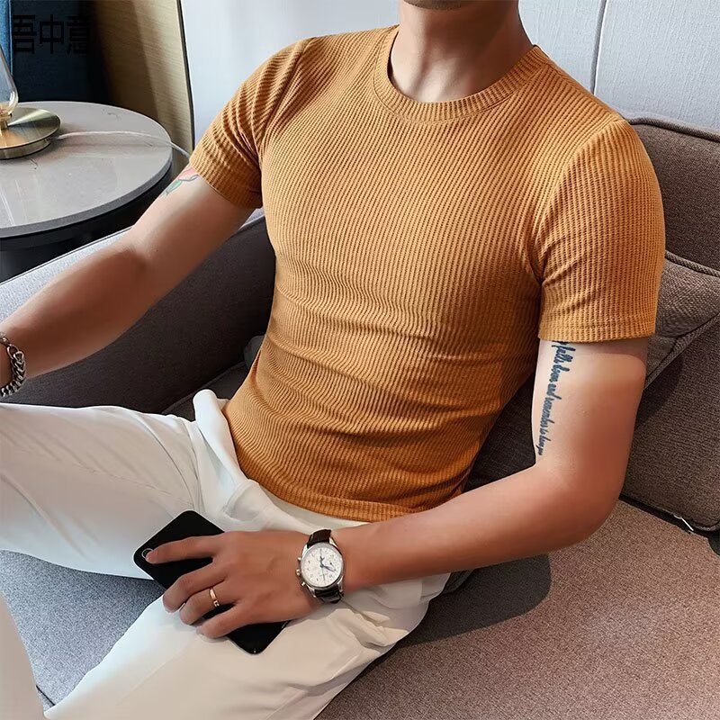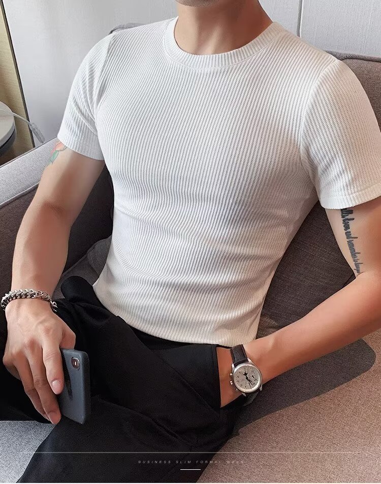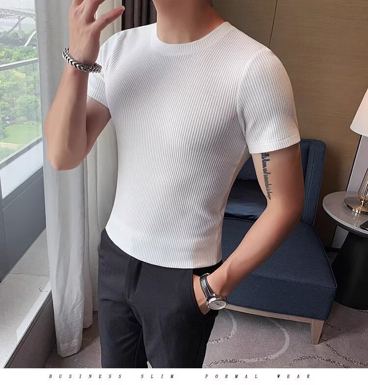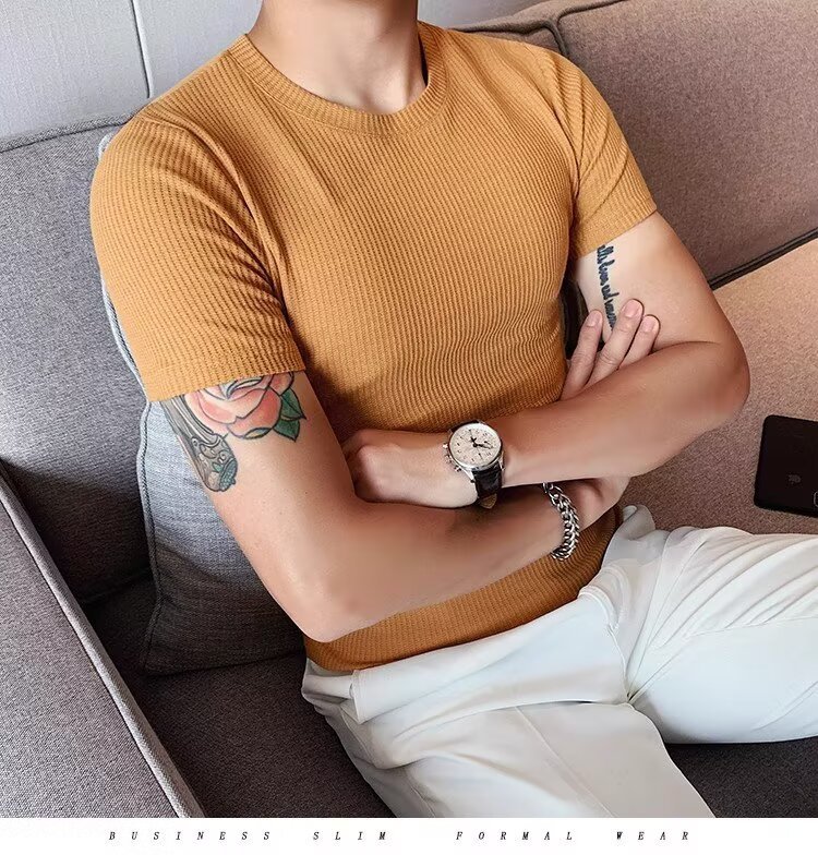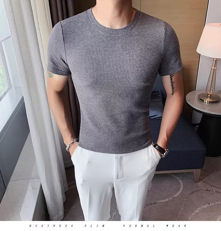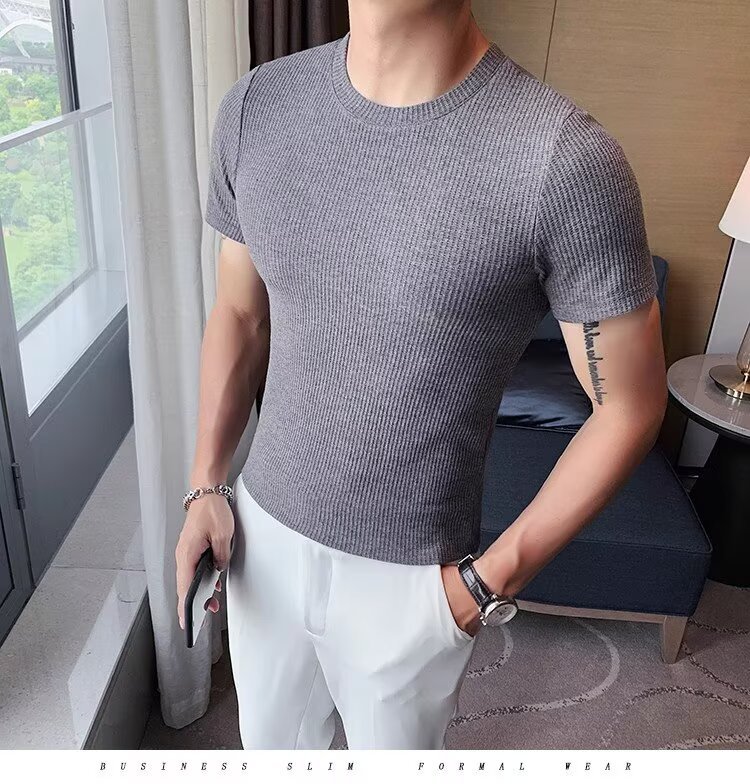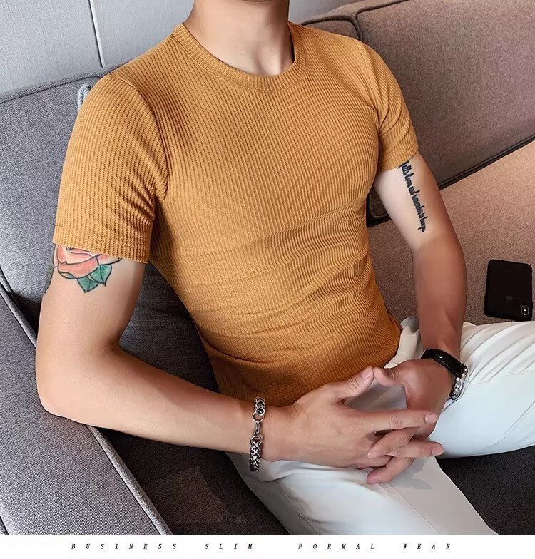 국경 간 반팔 티셔츠 남자 둥근 목 여름 새로운 슬림 핏 한국 유행 근육 줄무늬 단색 캐주얼 니트스토어 가기