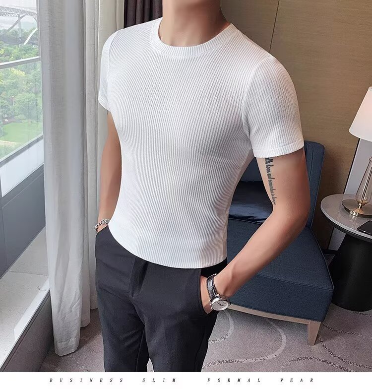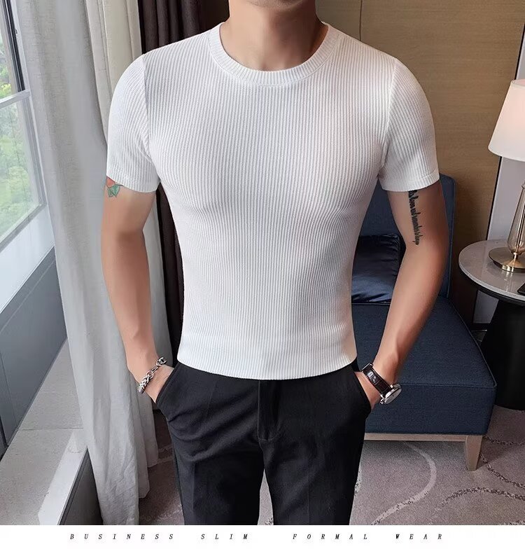 국경 간 반팔 티셔츠 남자 둥근 목 여름 새로운 슬림 핏 한국 유행 근육 줄무늬 단색 캐주얼 니트