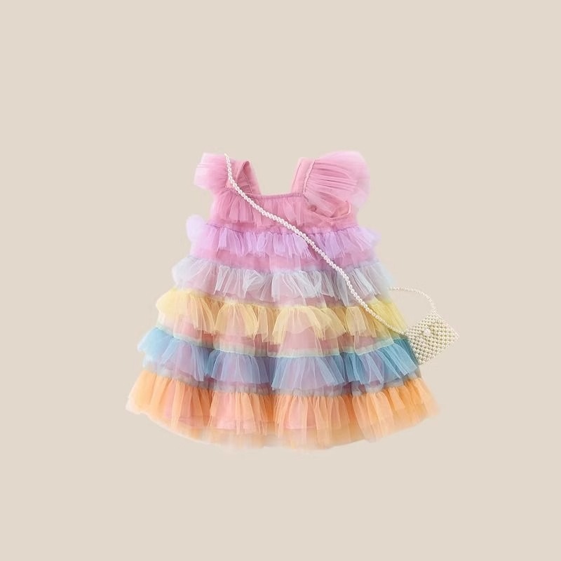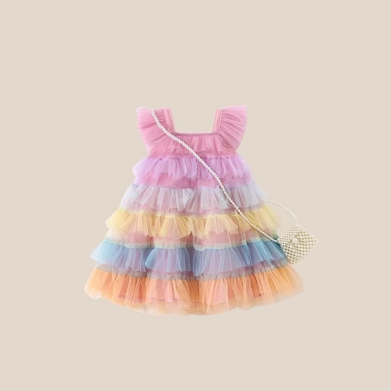 소녀 여름 새로운 어린이 서양 스타일 2025 무지개 민소매 메쉬 여름 원피스 아기 케이크 공주 원피스
