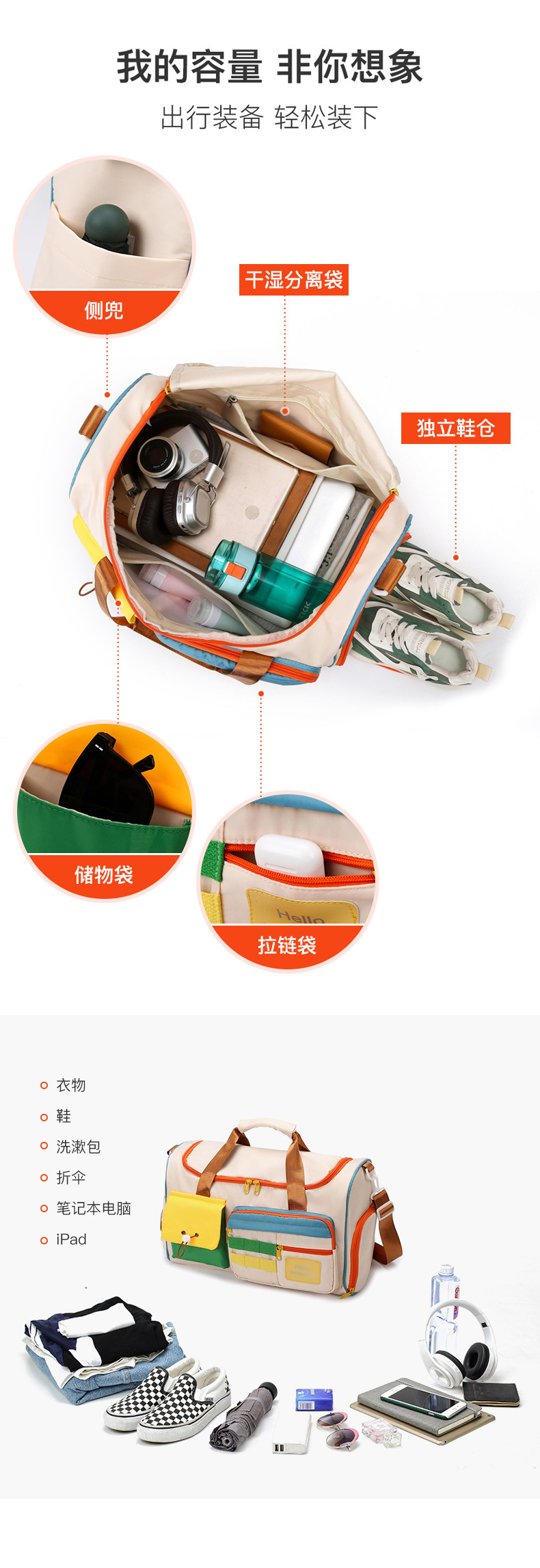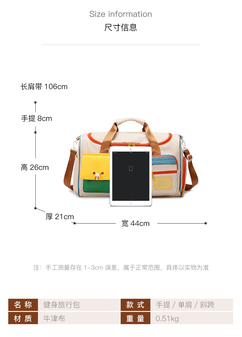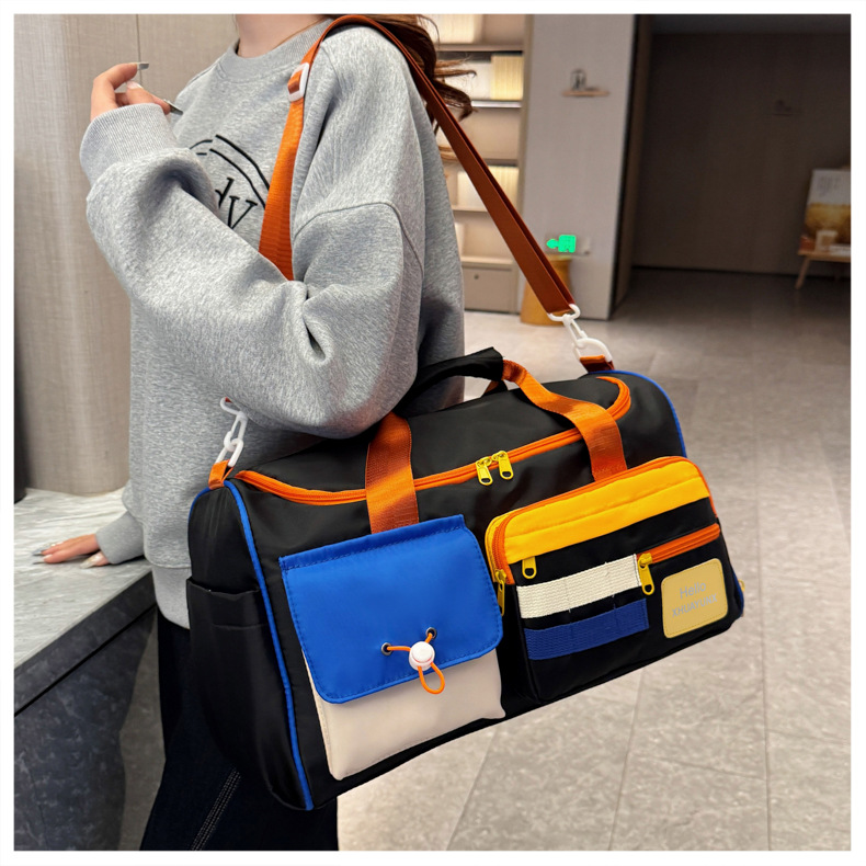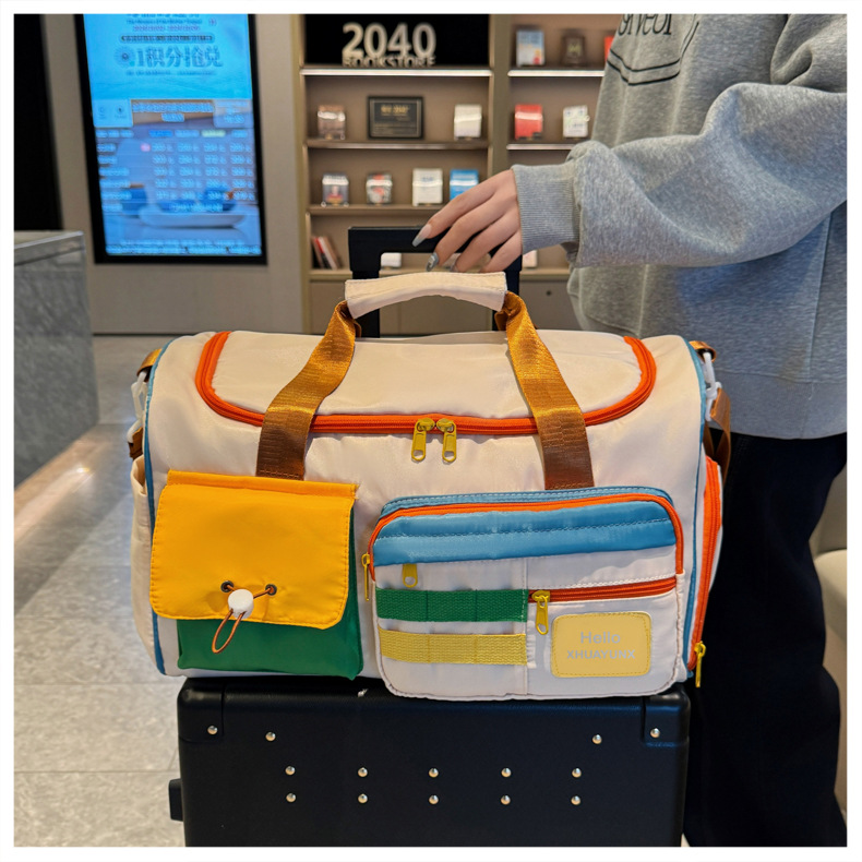 귀여운 대비 색상 단거리 여행 가방 내마모성 서양식 피트니스 가방 여성용 건조하고 젖은 별도의 대용량 핸드 수하물 가방스토어 가기
