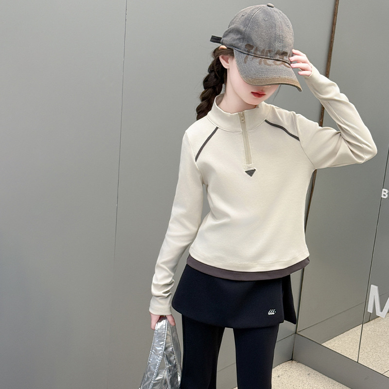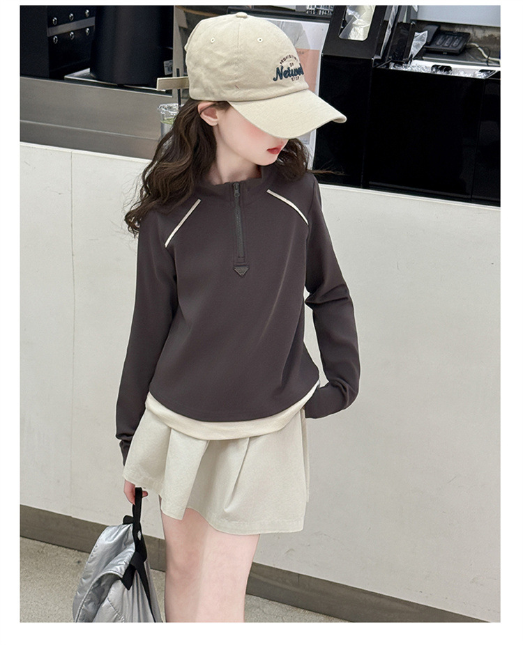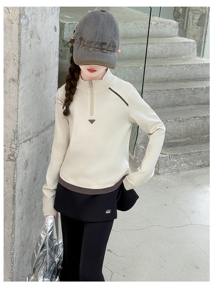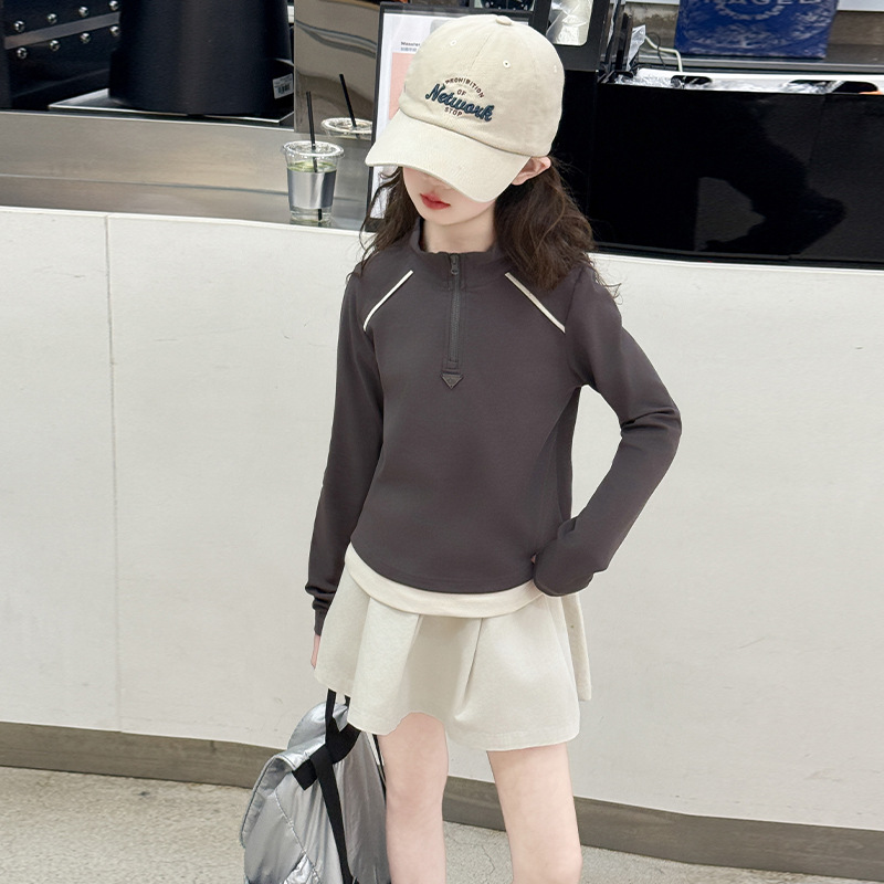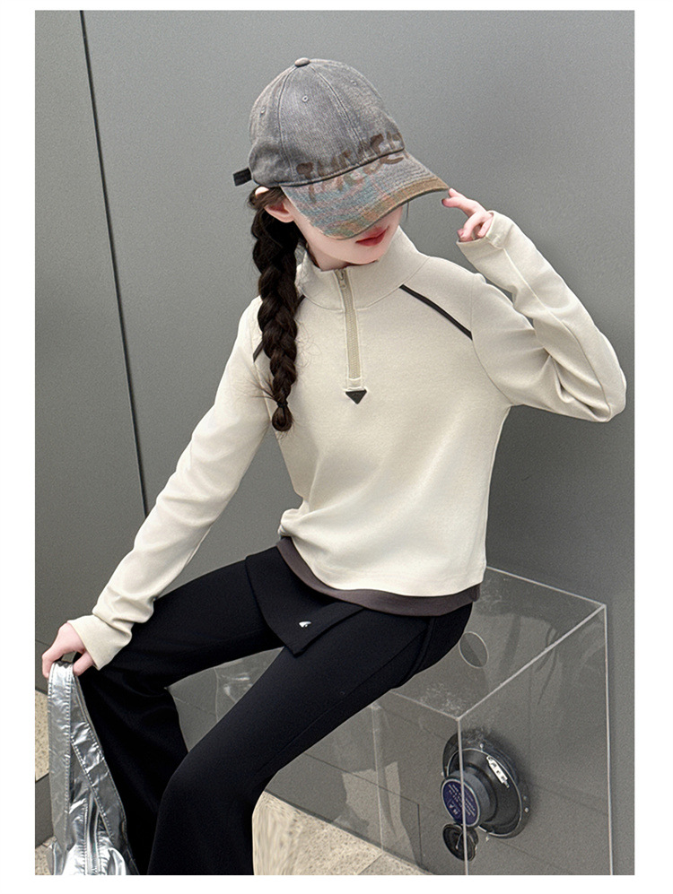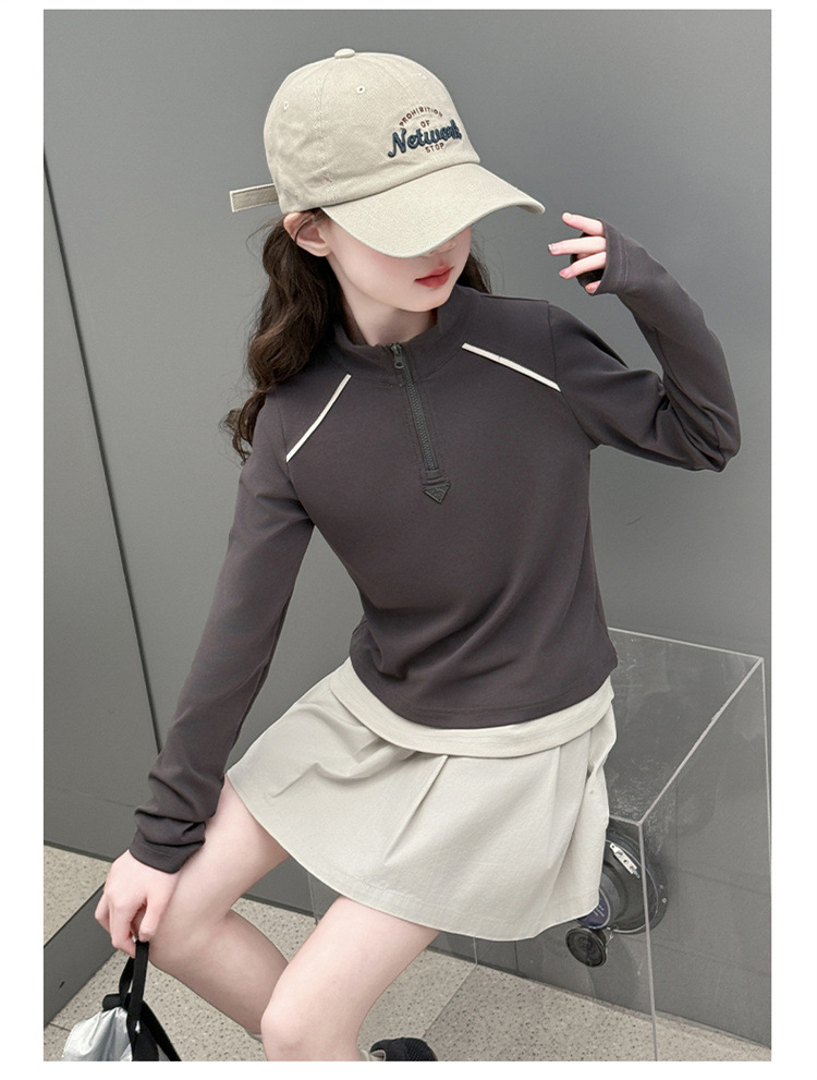 여자 반 지퍼 수직 칼라 풀오버 긴 소매 티셔츠 2025 봄 새로운 스타일 소녀 짧은 슬림 탑 베이스 레이어 셔츠