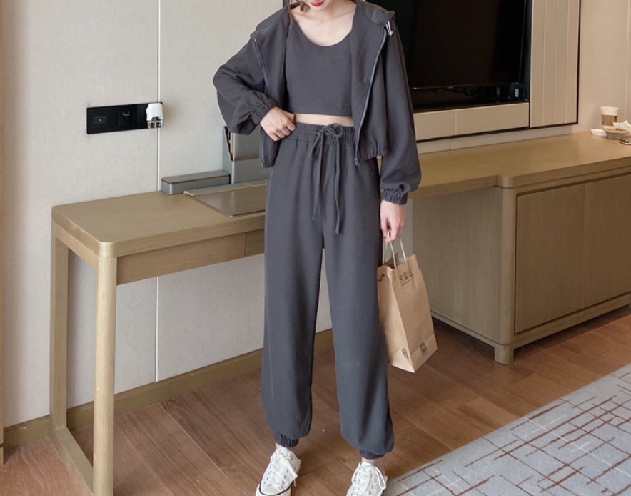 스포츠 캐주얼 세트 여성용 루즈 인 트렌디 한 봄과 가을 2025 짧은 지퍼 스웨트 재킷 3 피스 세트스토어 가기