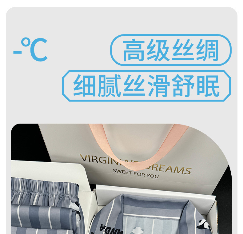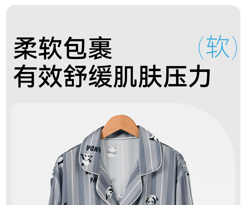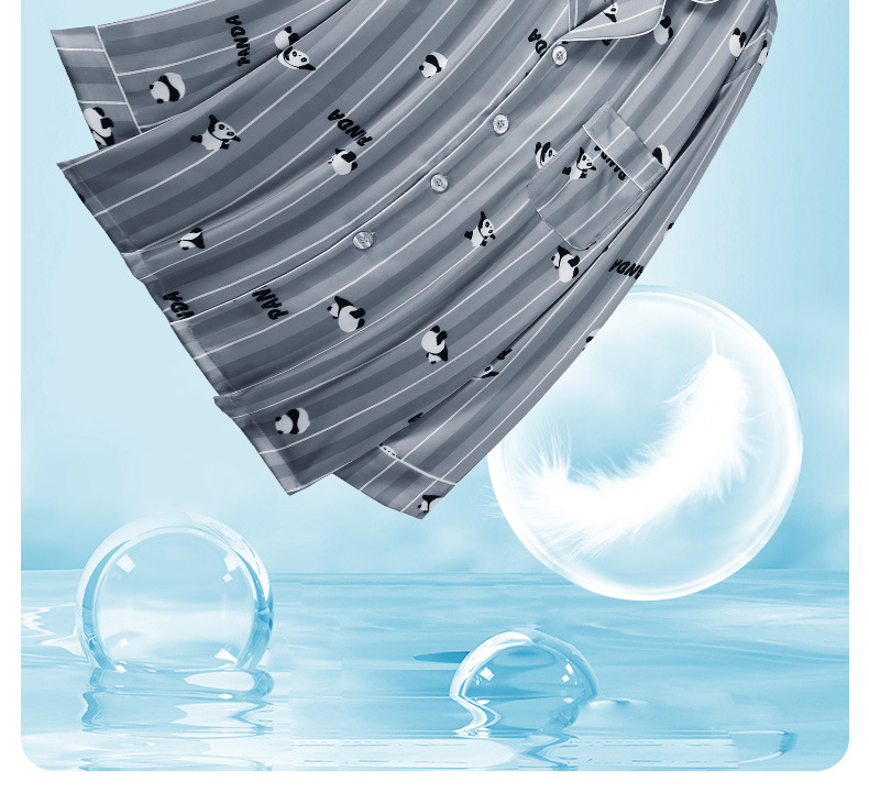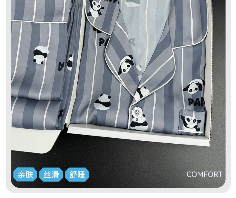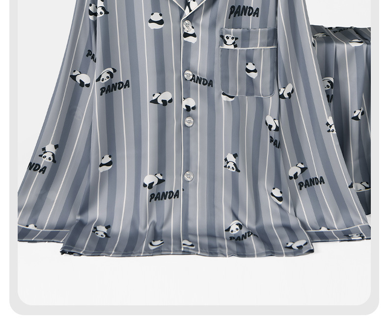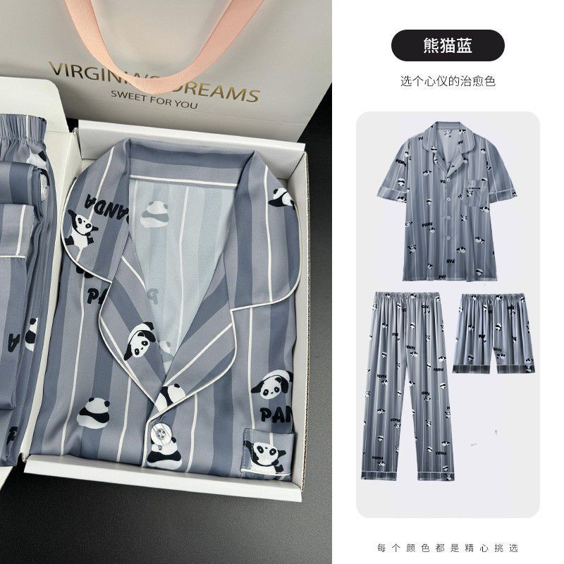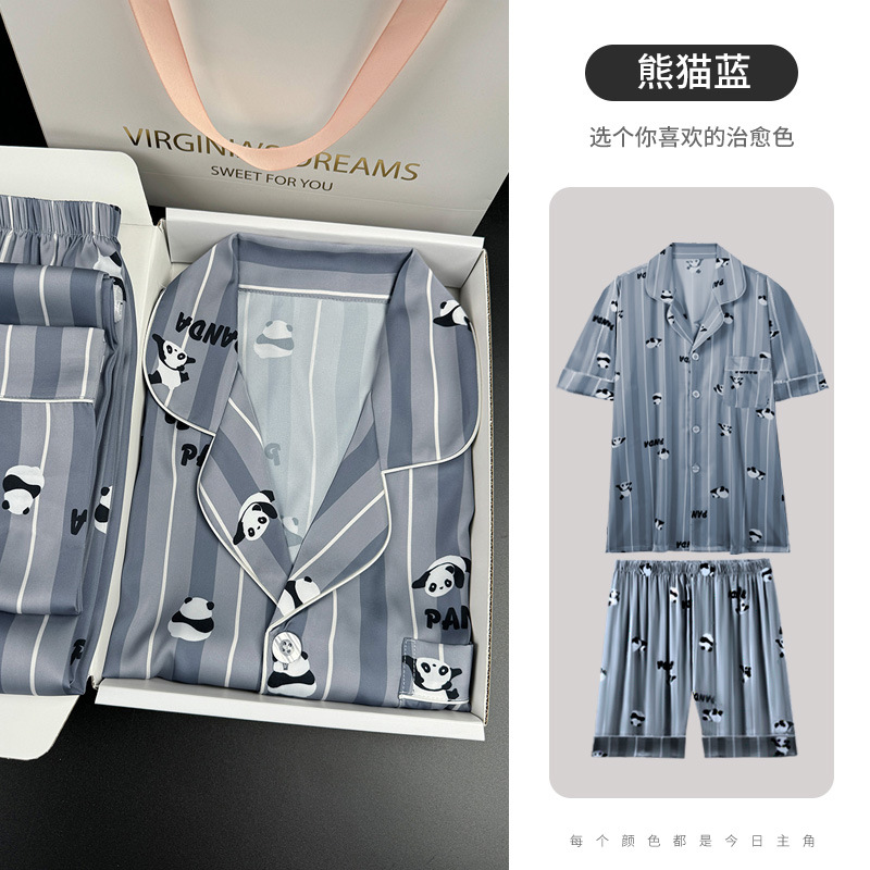 [귀여운~ 남자친구에게 선물] 남성용 신상 팬더 블루 아이스 실크 잠옷 여름 시원하고 실키한 라펠 남성용 홈웨어