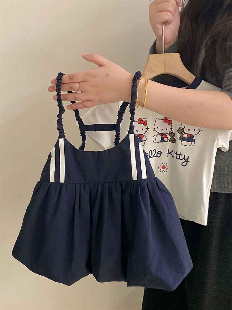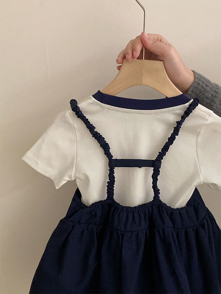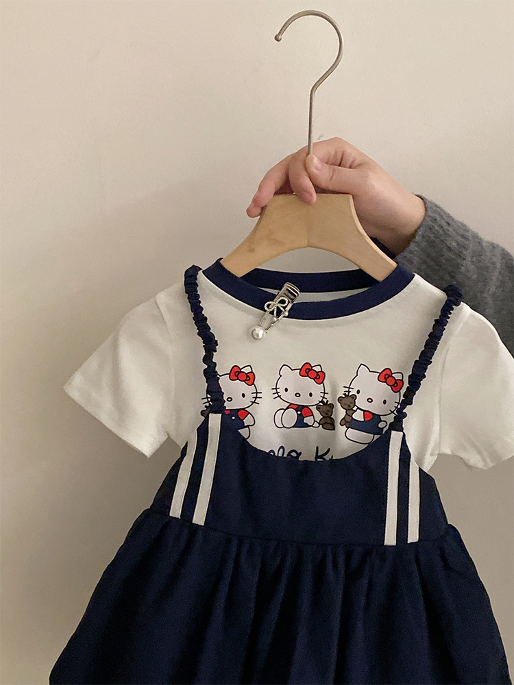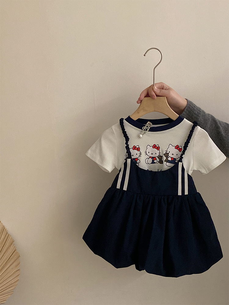 소녀 한국식 여름 새 귀여운 고양이 반팔 2025 올매치 스트랩 스트라이프 푹신한 스트랩 스커트 투피스 세트