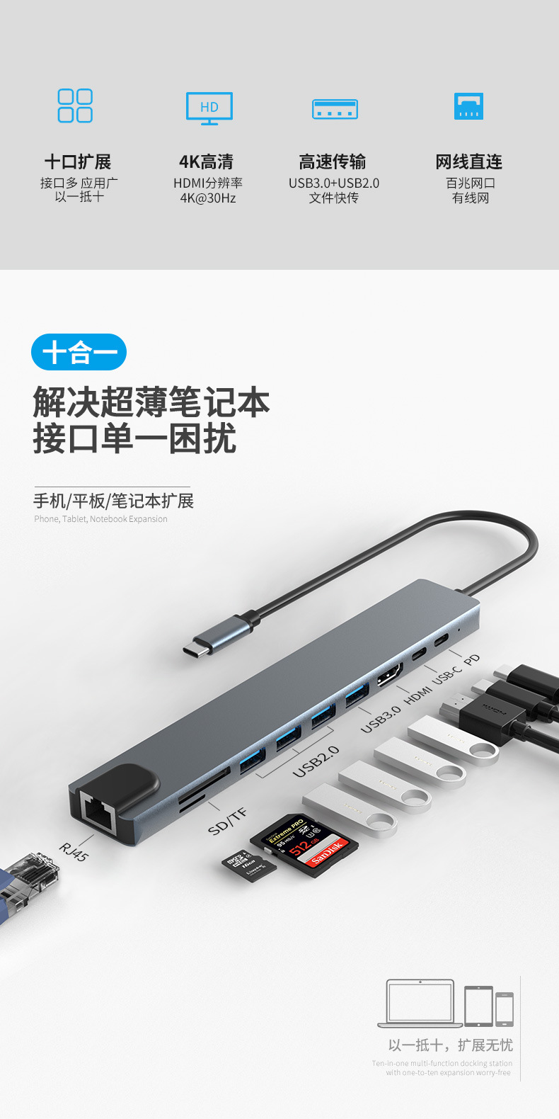 유형 c-hdmi 확장 도크 usb-c 3.0hub 노트북 컨버터 10 in -1 허브 pd 전원 공급 장치