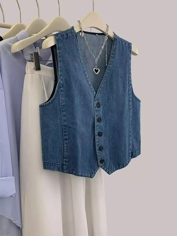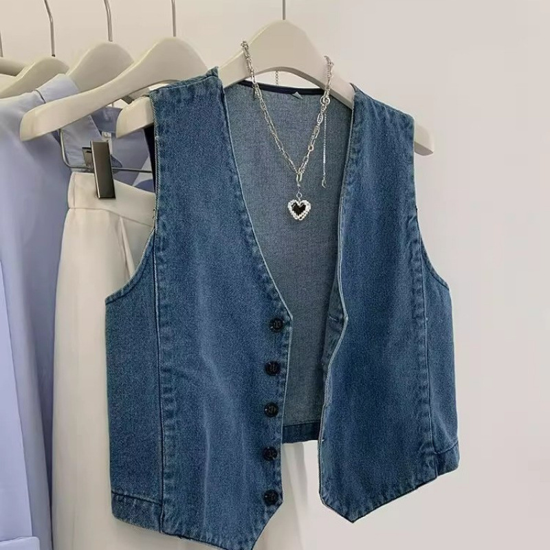 여름 2025 새로운 빈티지 데님 조끼 여성 작은 외부 짧은 소매 탑 여름 착용스토어 가기
