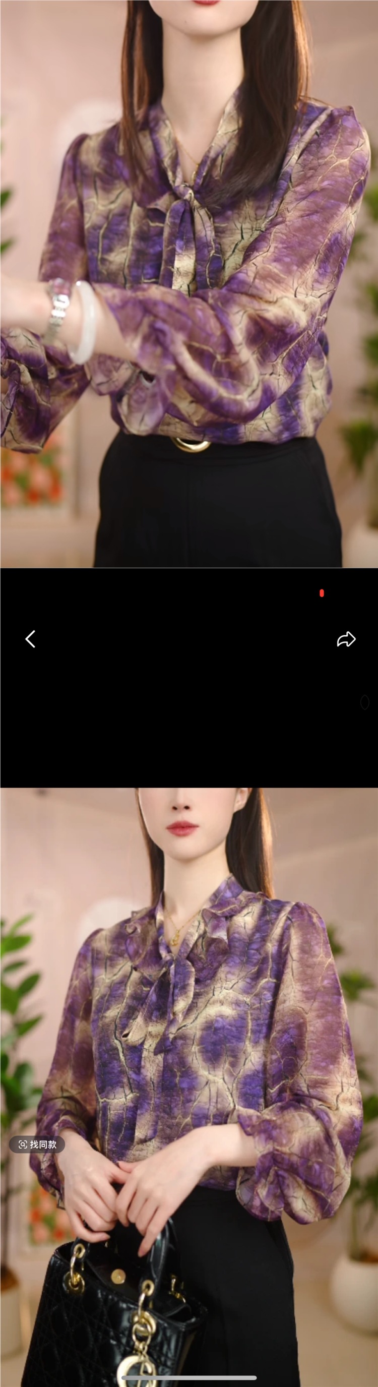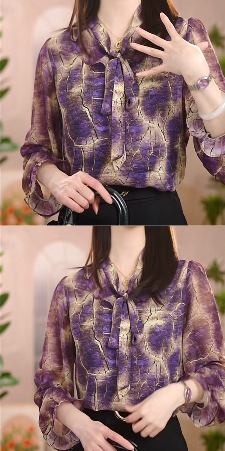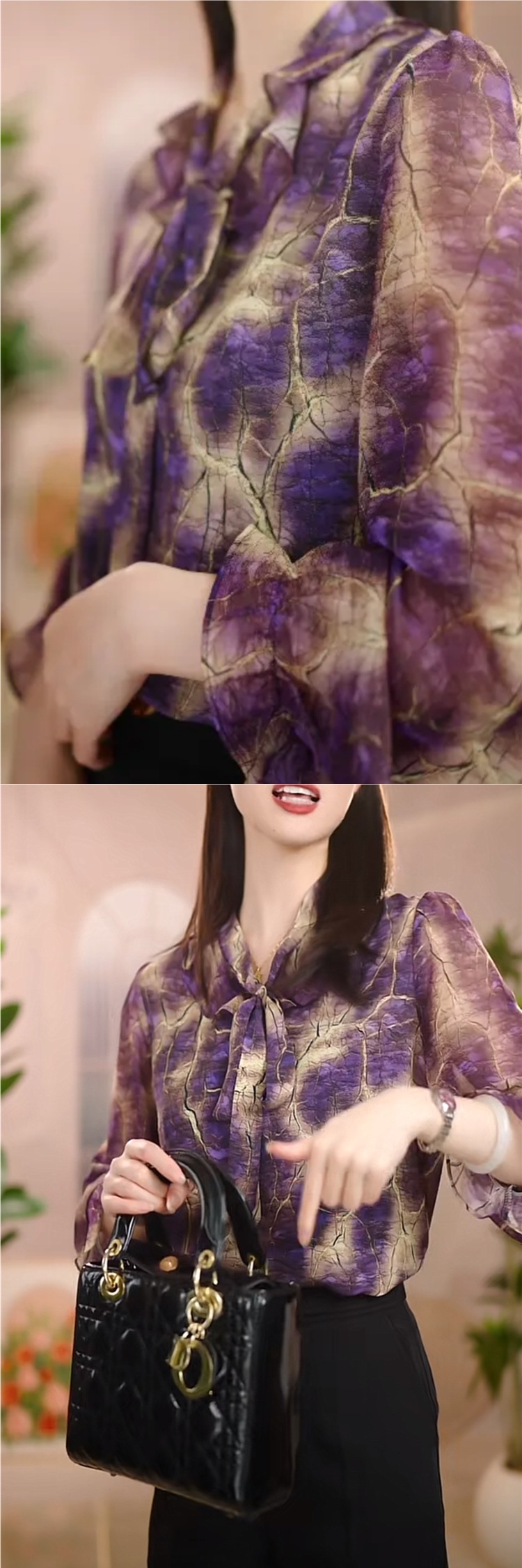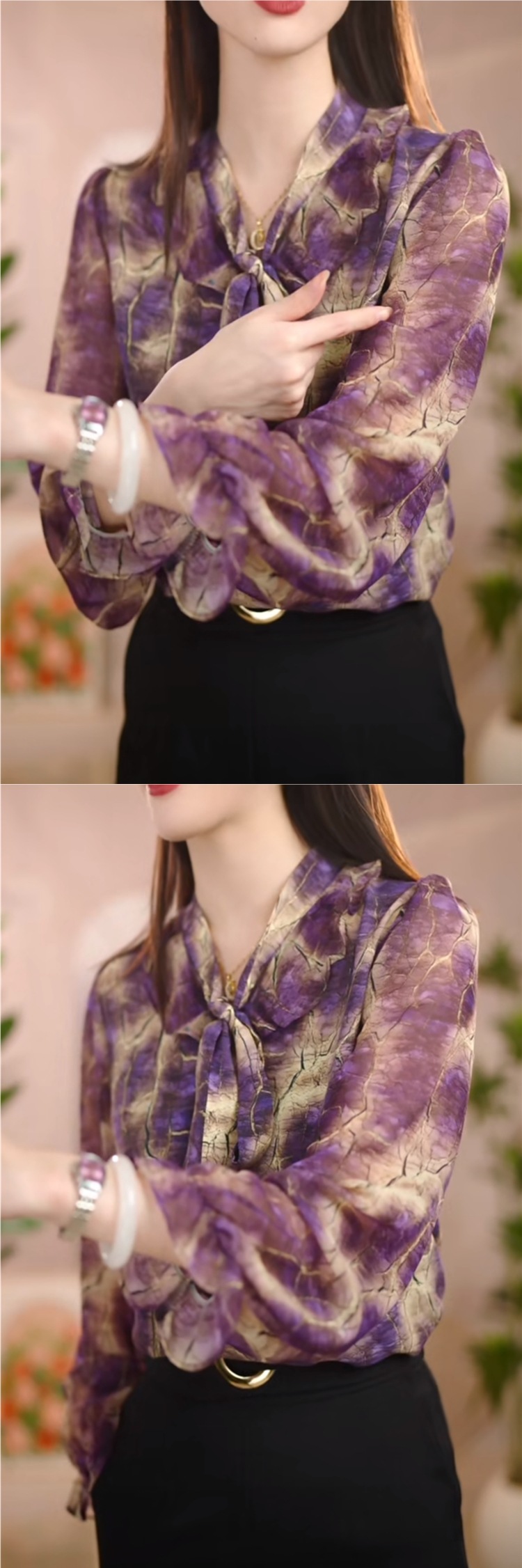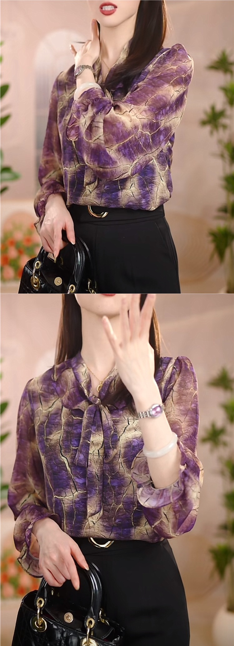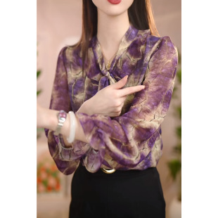 보라색 탑 여성의 긴 소매 봄과 가을 새로운 도착 프랑스 스타일 아름다운 활 작은 셔츠 어머니의 서양식 인쇄 쉬폰 셔츠스토어 가기