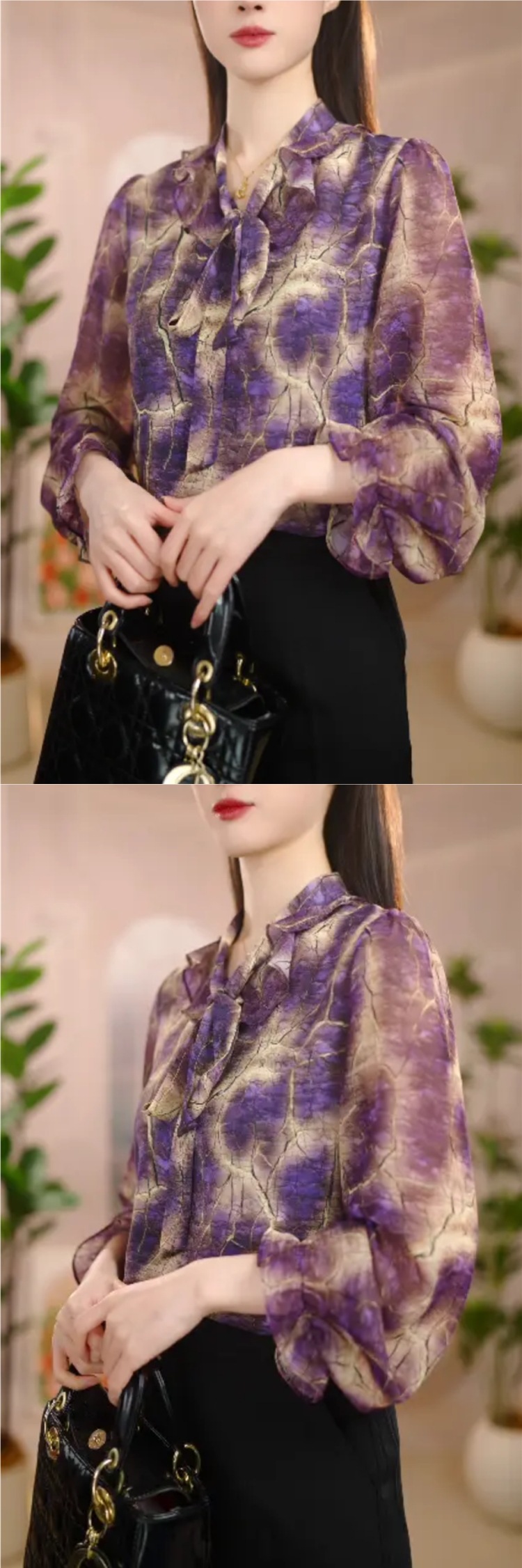 보라색 탑 여성의 긴 소매 봄과 가을 새로운 도착 프랑스 스타일 아름다운 활 작은 셔츠 어머니의 서양식 인쇄 쉬폰 셔츠