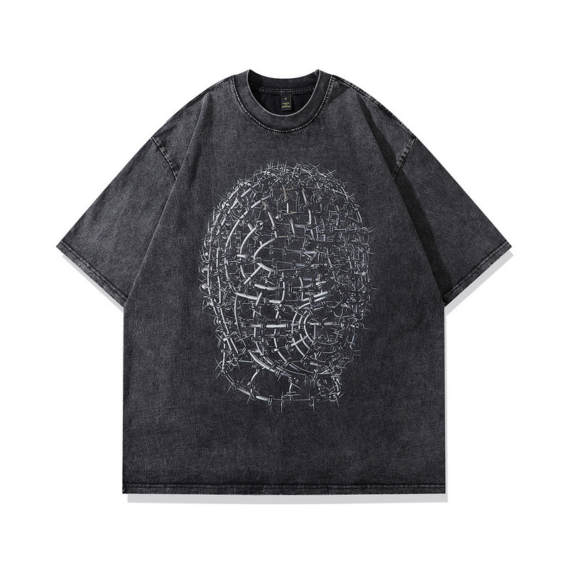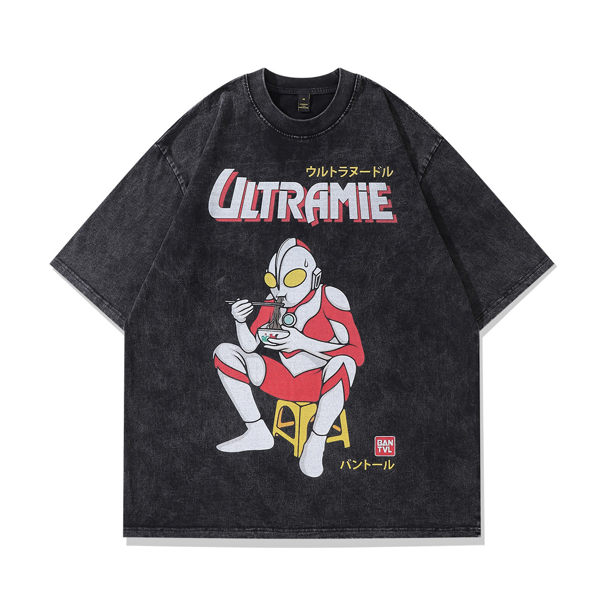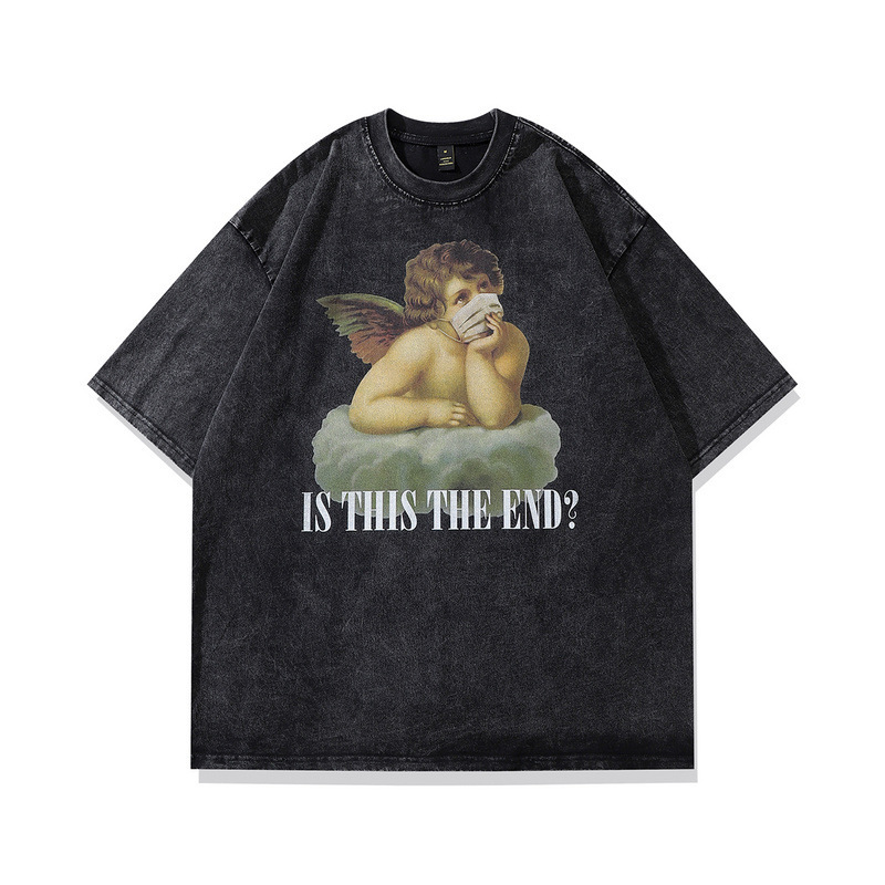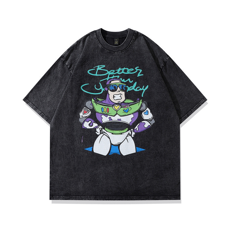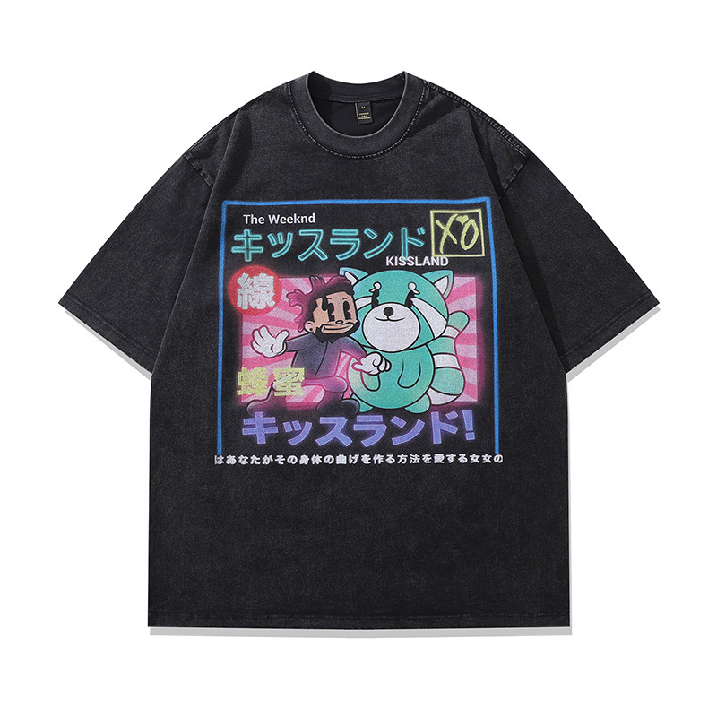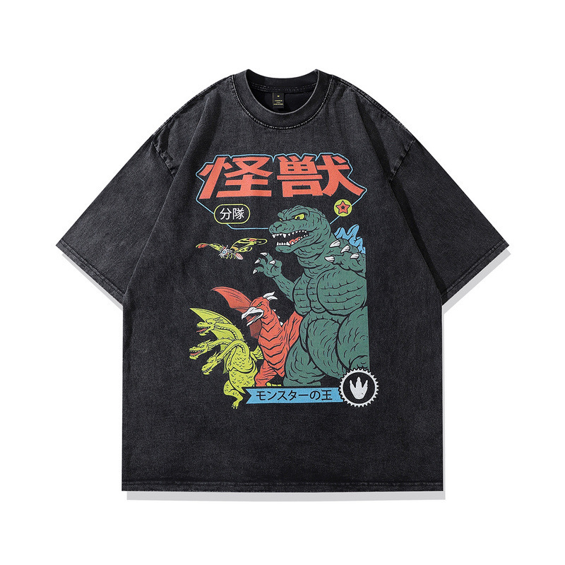 하라주쿠 일본 거리 만화 인쇄 오래 된 반팔 티셔츠 남성용 트렌디 브랜드 힙합 느슨한 세탁 가능한 반팔 티셔츠