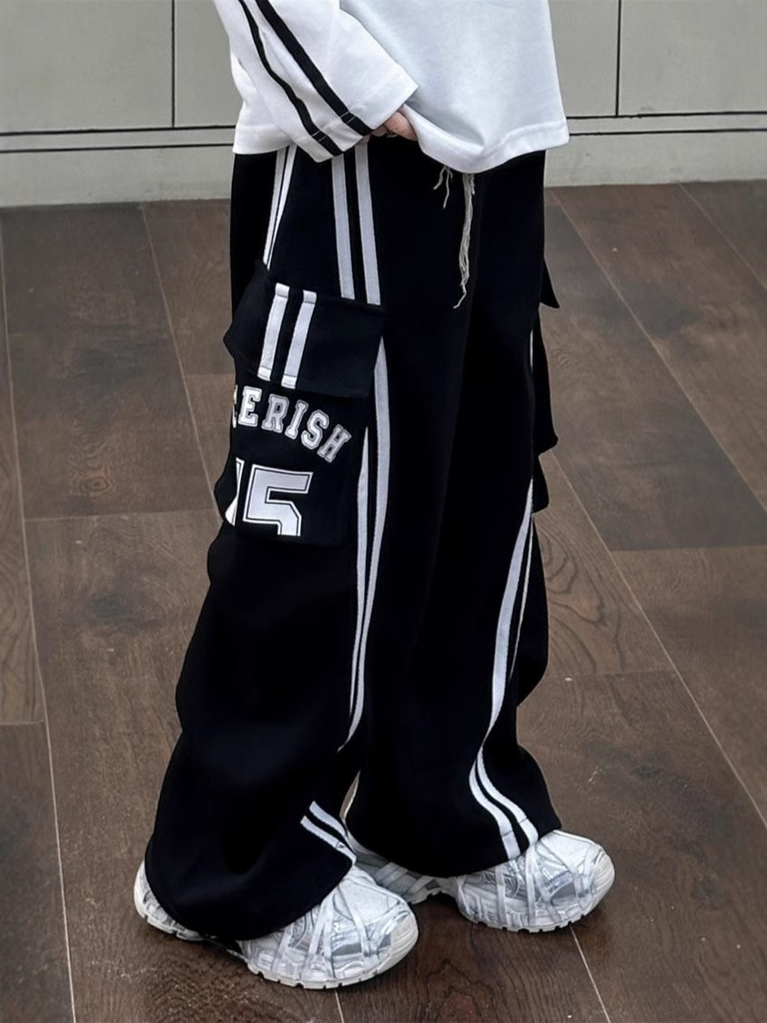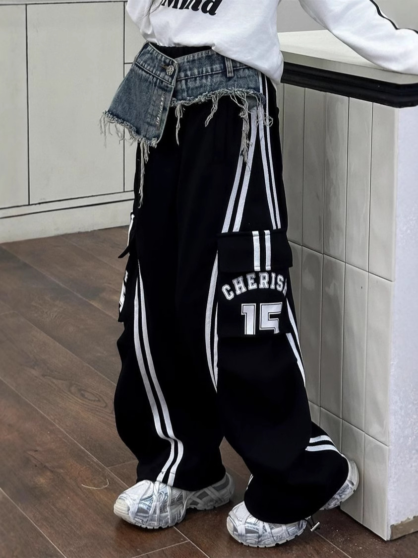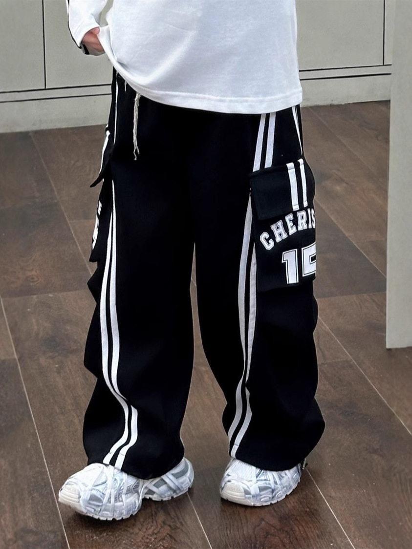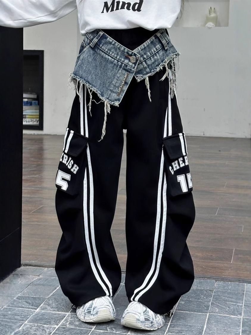 소녀 아메리칸 스타일 스티칭 데님 스트라이프 오버롤 스포츠 바지 봄과 가을 유행 캐주얼 와이드 레그 바지 트렌디 한 바지