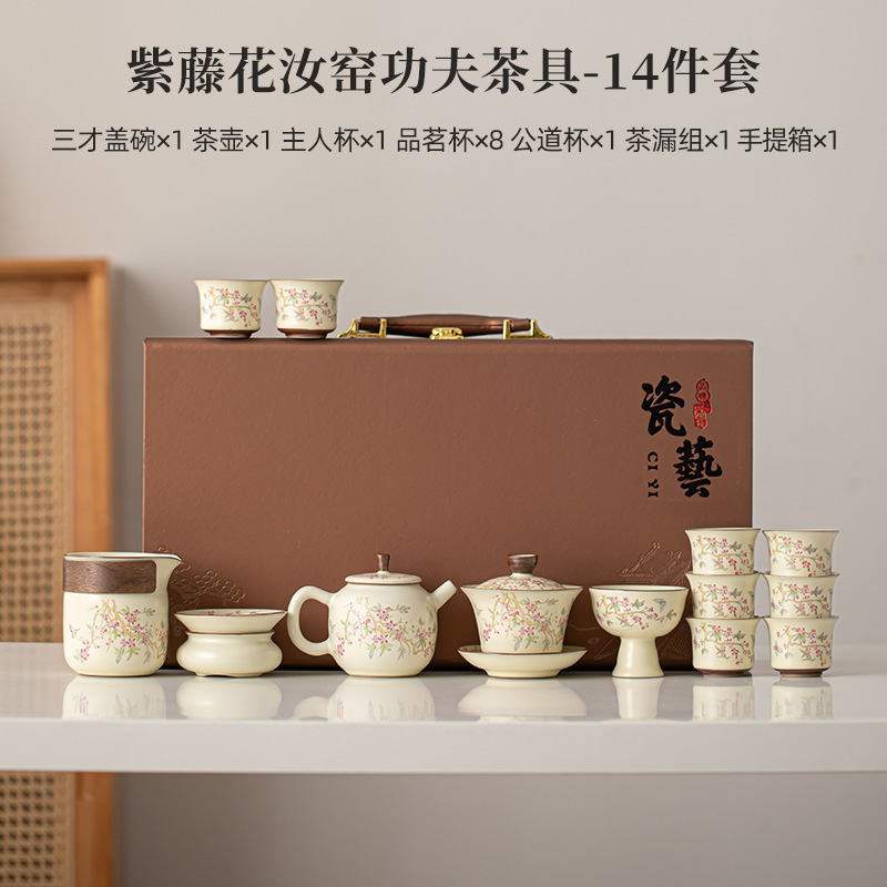 등나무 꽃 ru 가마 쿵푸 차 세트 중국 세라믹 가정용 거실 사무실 그릇 주전자 선물 상자 세트