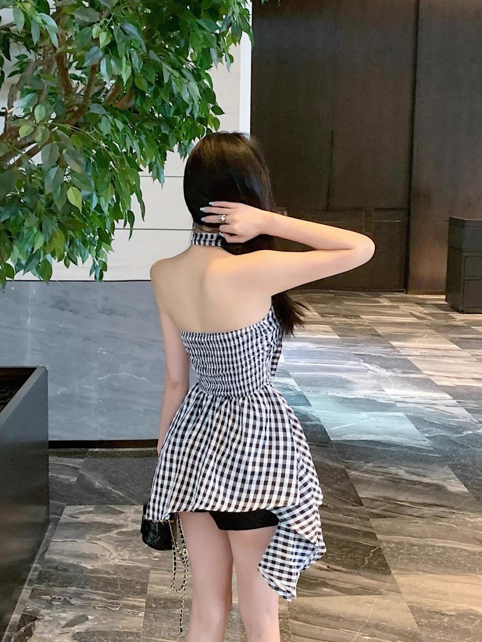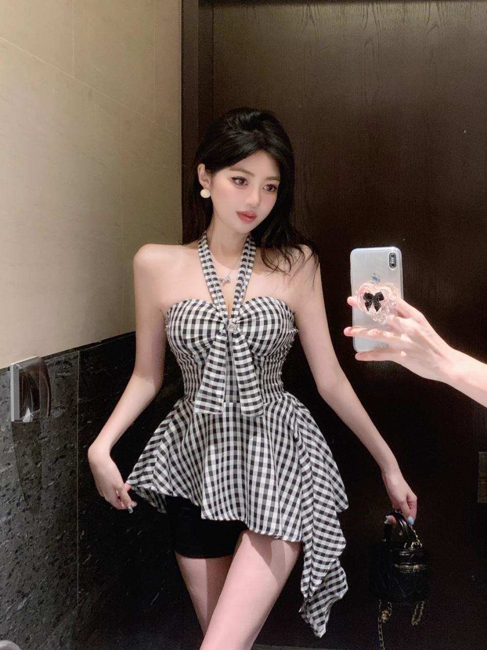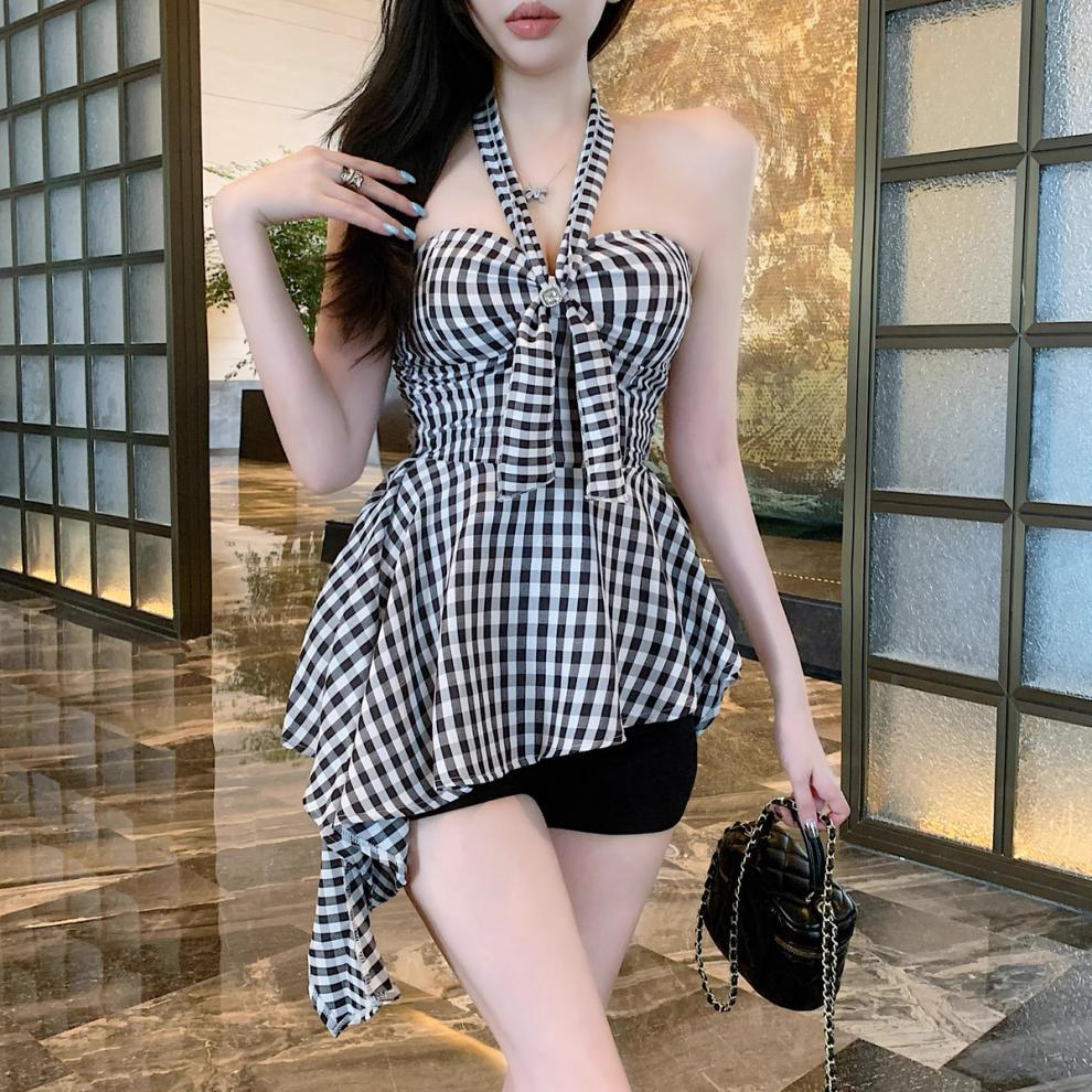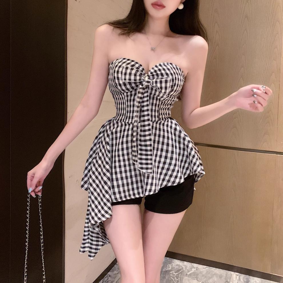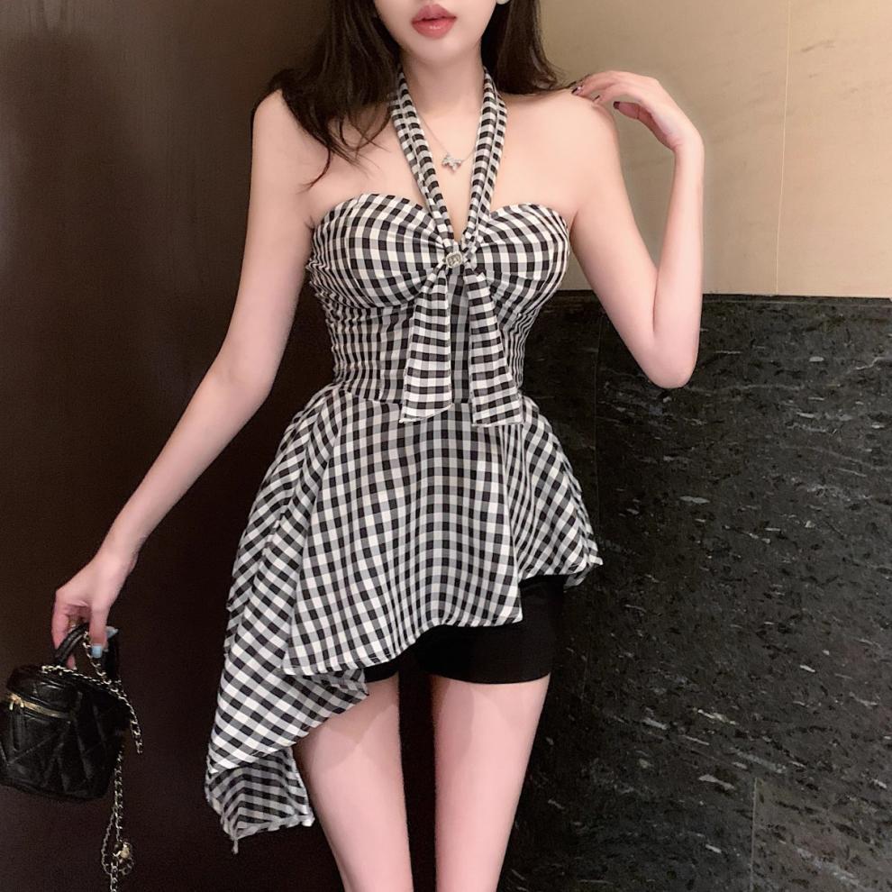불규칙한 끈이없는 조끼 슬림 핏 스파이스 걸 의상 중간 길이의 백리스 민소매 최고 신선한 체크