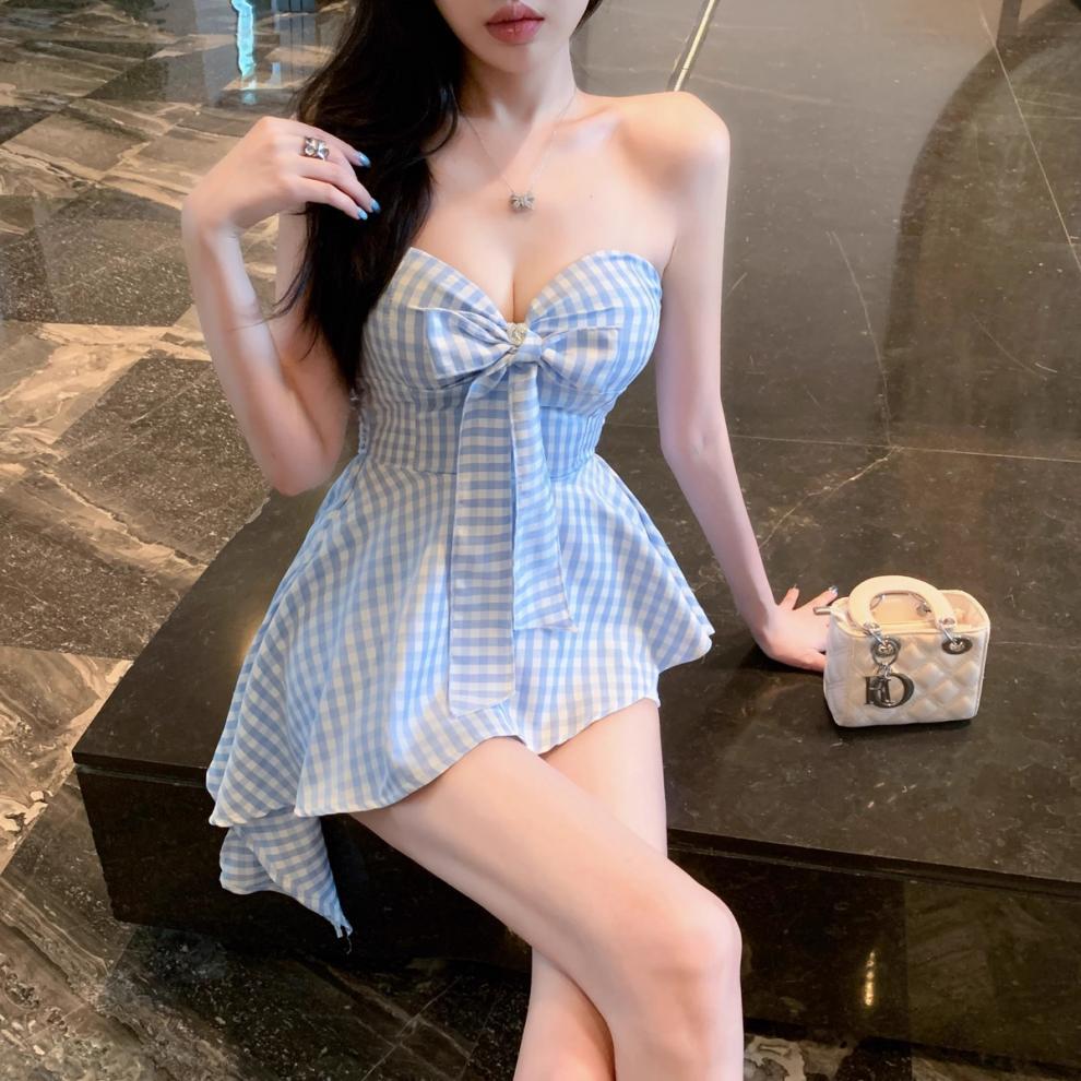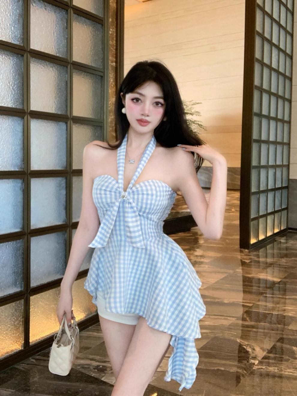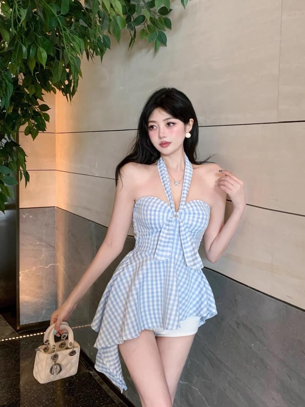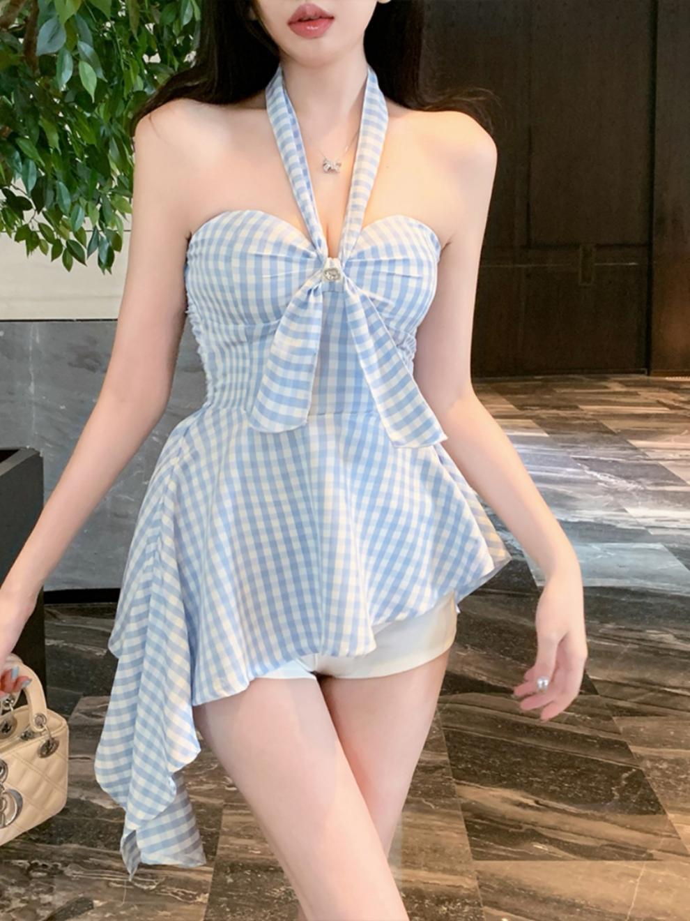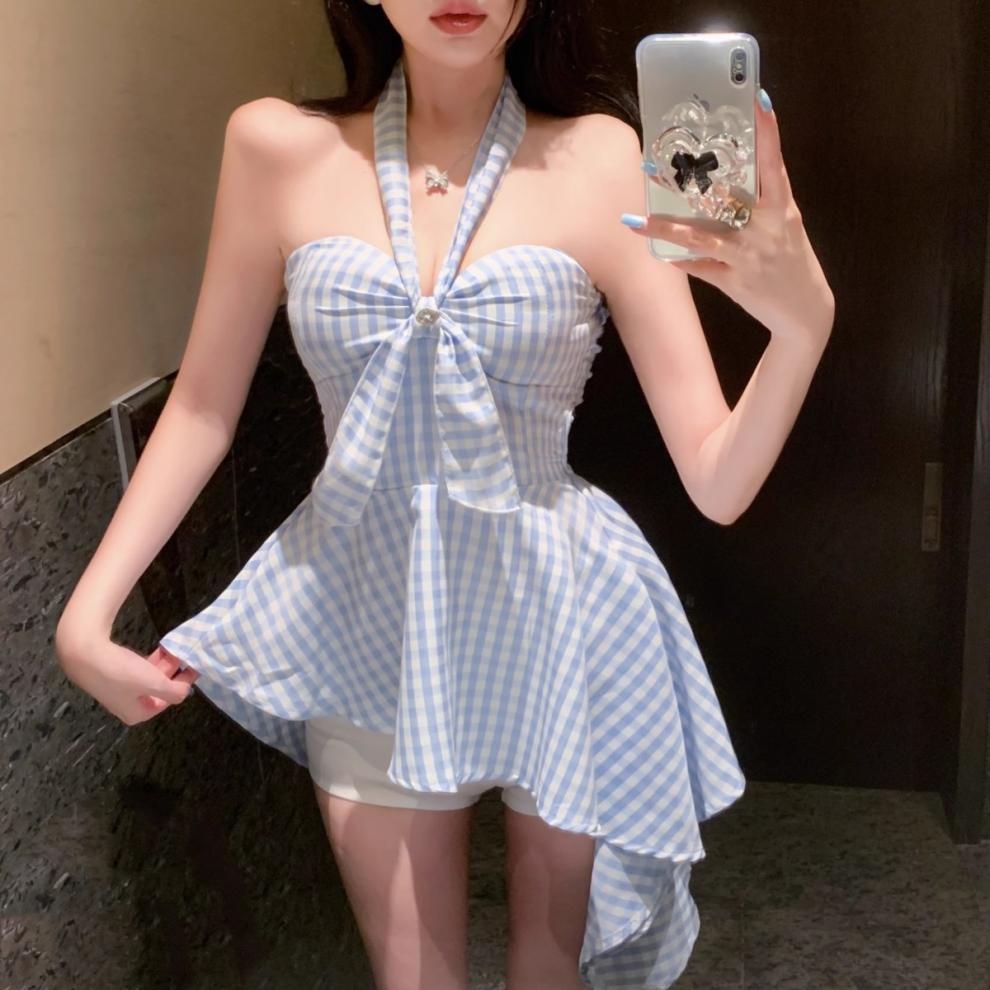 불규칙한 끈이없는 조끼 슬림 핏 스파이스 걸 의상 중간 길이의 백리스 민소매 최고 신선한 체크