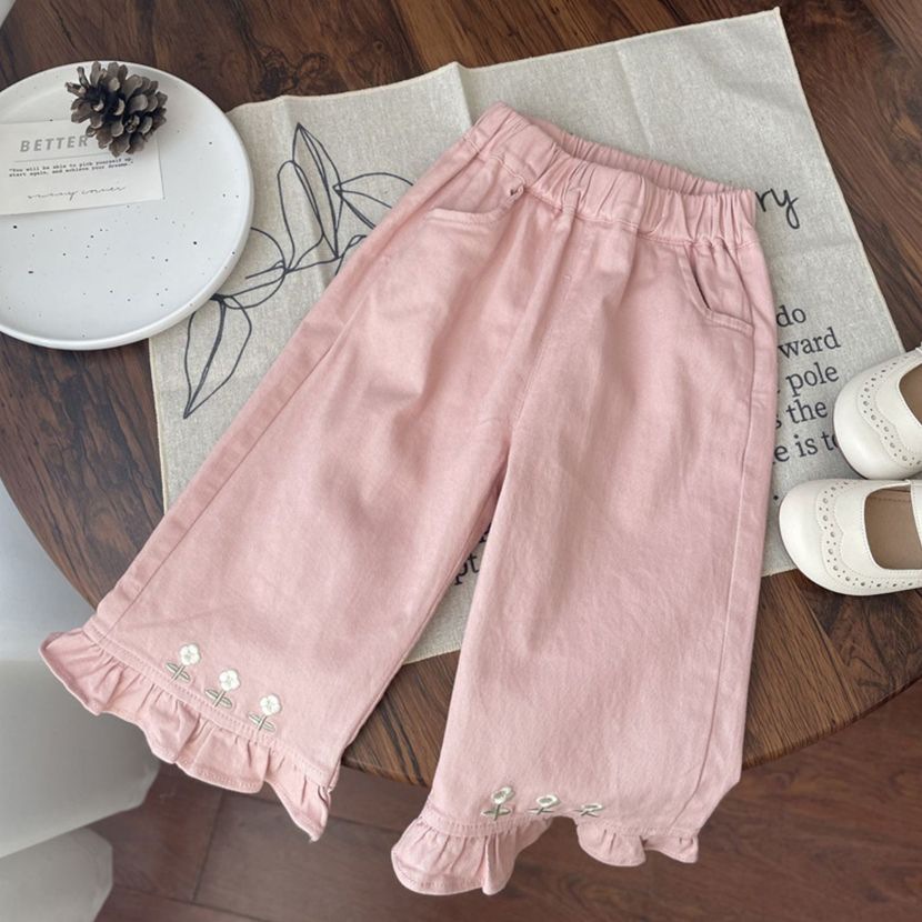 봄과 가을 여성 어린이 착용 캐주얼 바지 아기 서양식 어린이 성격 유행 한국 스타일 꽃 자수 레이스 유행 유행 넓은 다리 바지