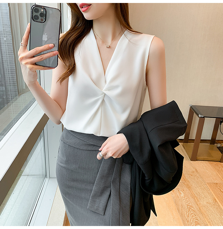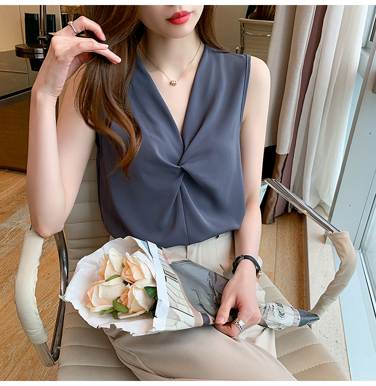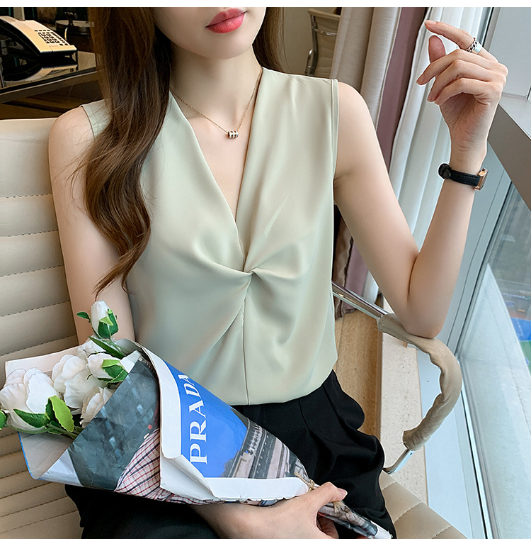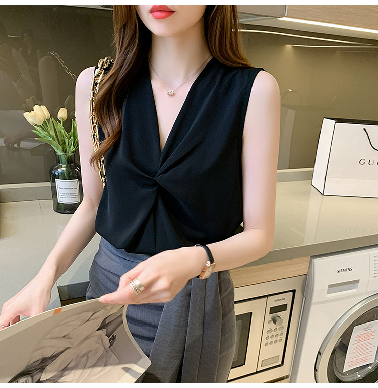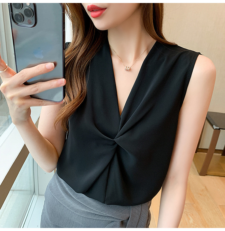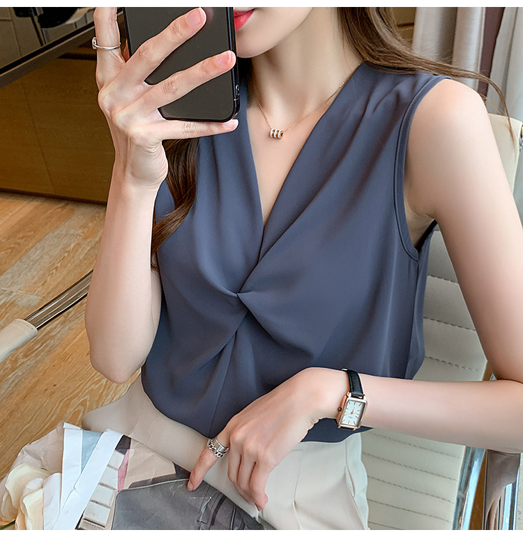 여성을위한 민소매 쉬폰 탑의 실제 사진 2025 여름 새로운 스타일 크로스 v 넥 느슨한 배꼽 덮는 한국 스타일 쉬폰 셔츠 통근