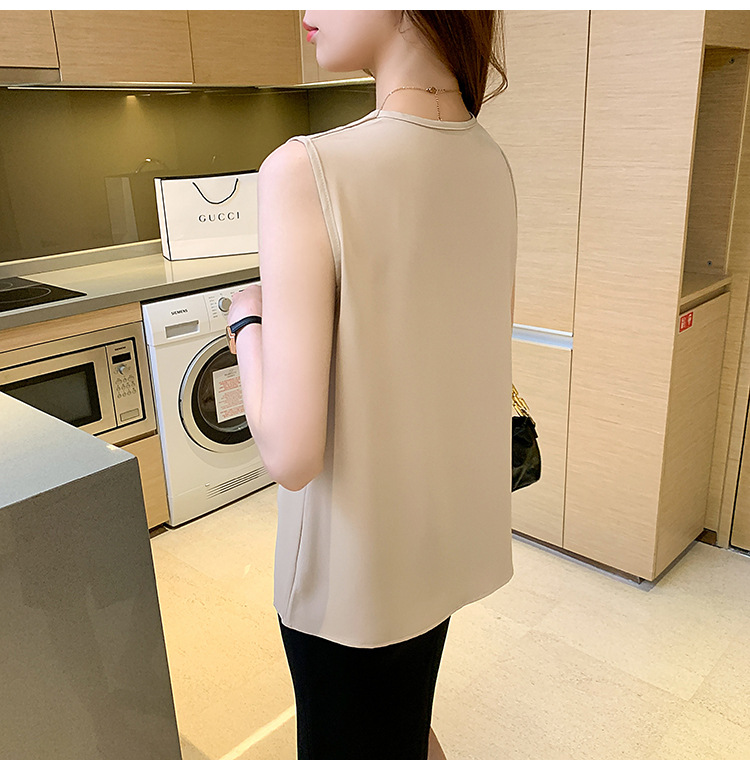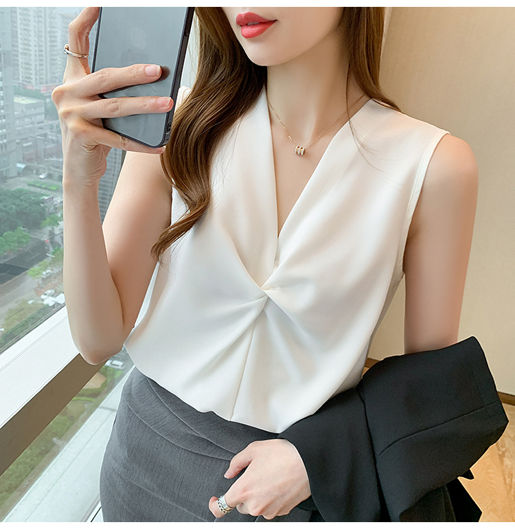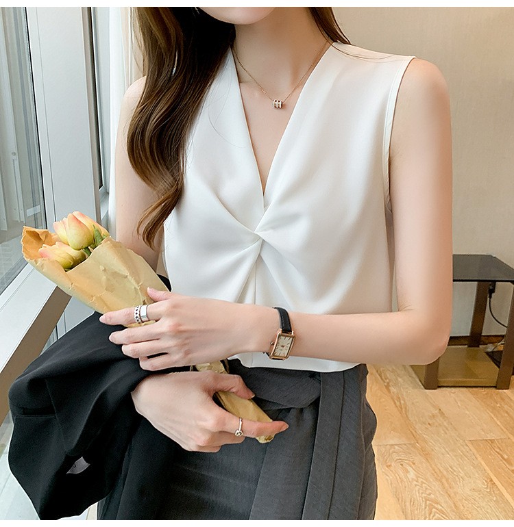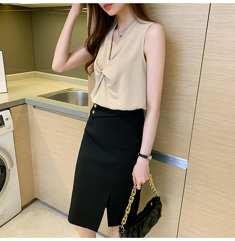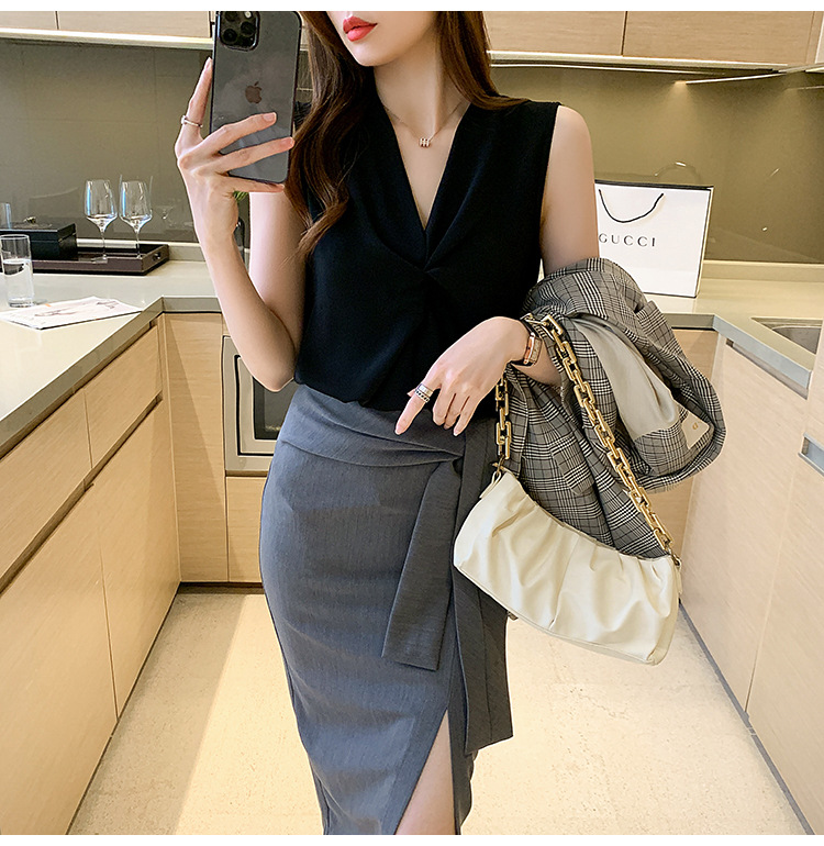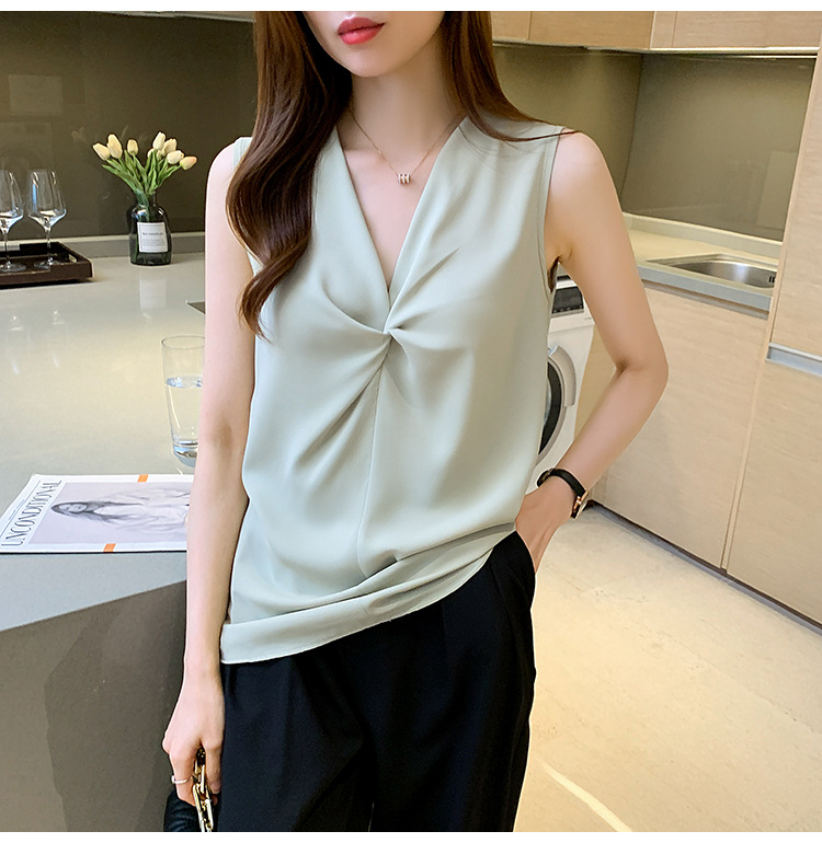 여성을위한 민소매 쉬폰 탑의 실제 사진 2025 여름 새로운 스타일 크로스 v 넥 느슨한 배꼽 덮는 한국 스타일 쉬폰 셔츠 통근