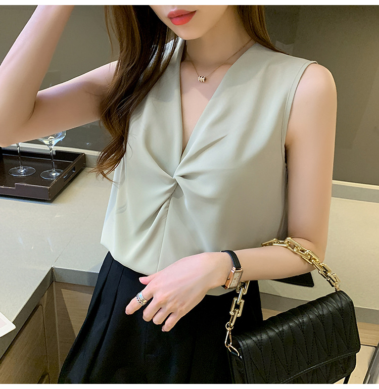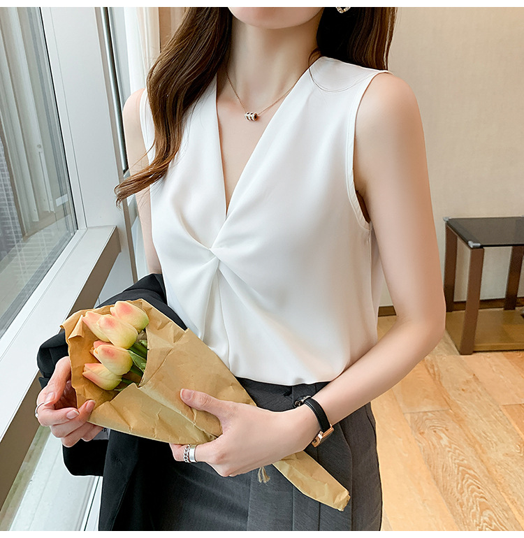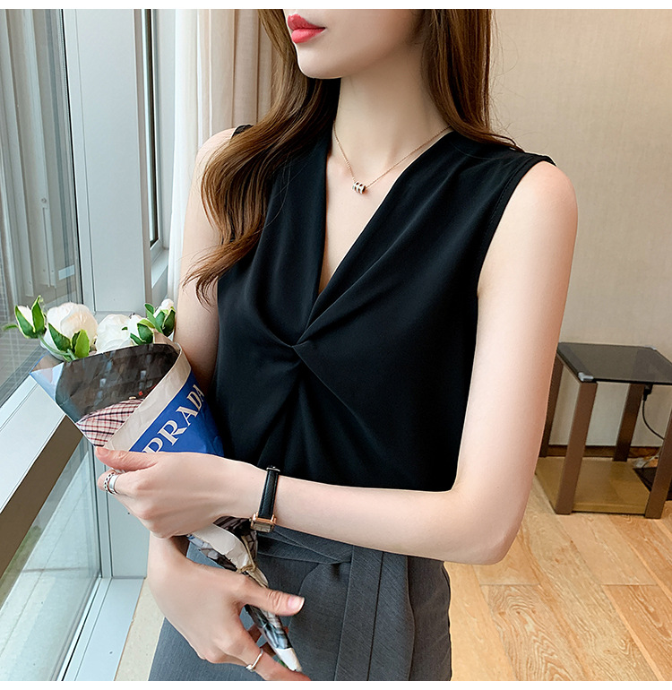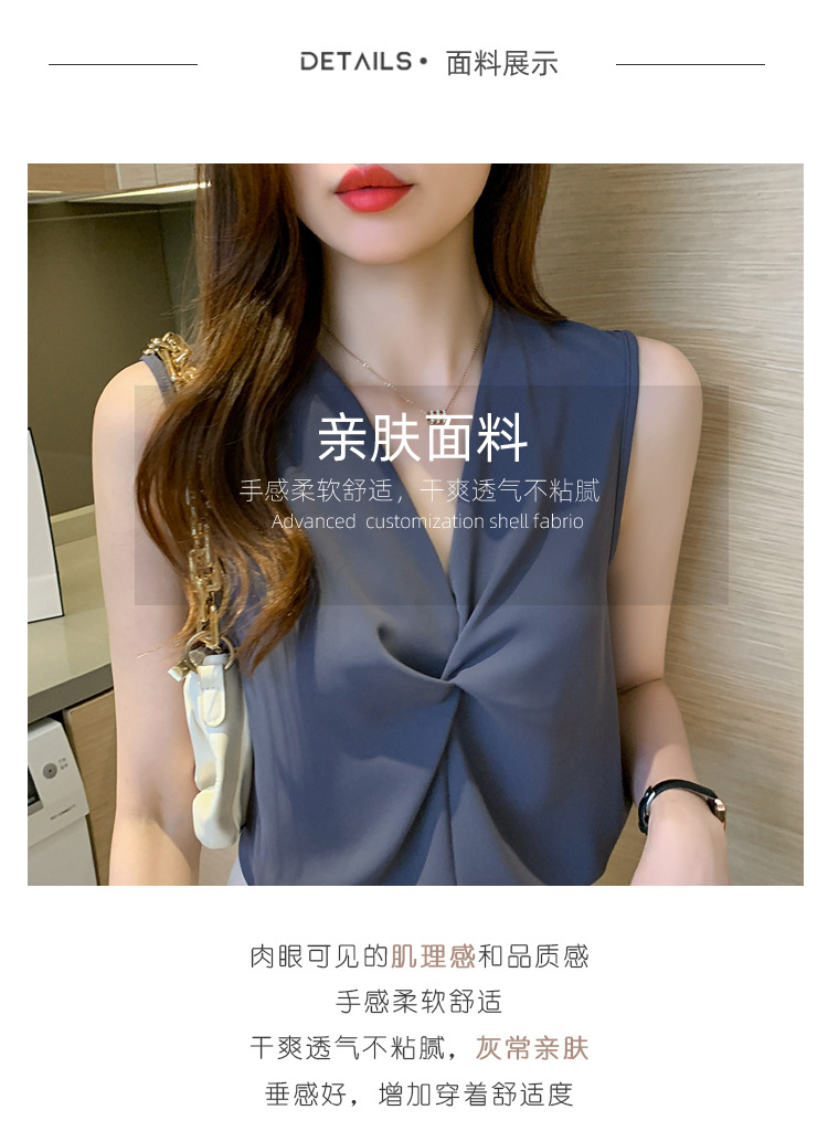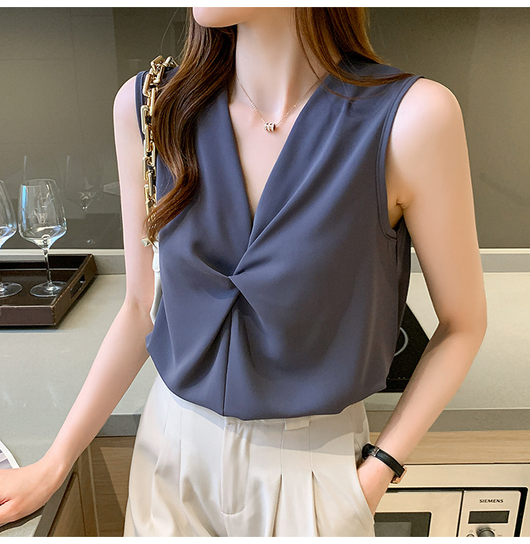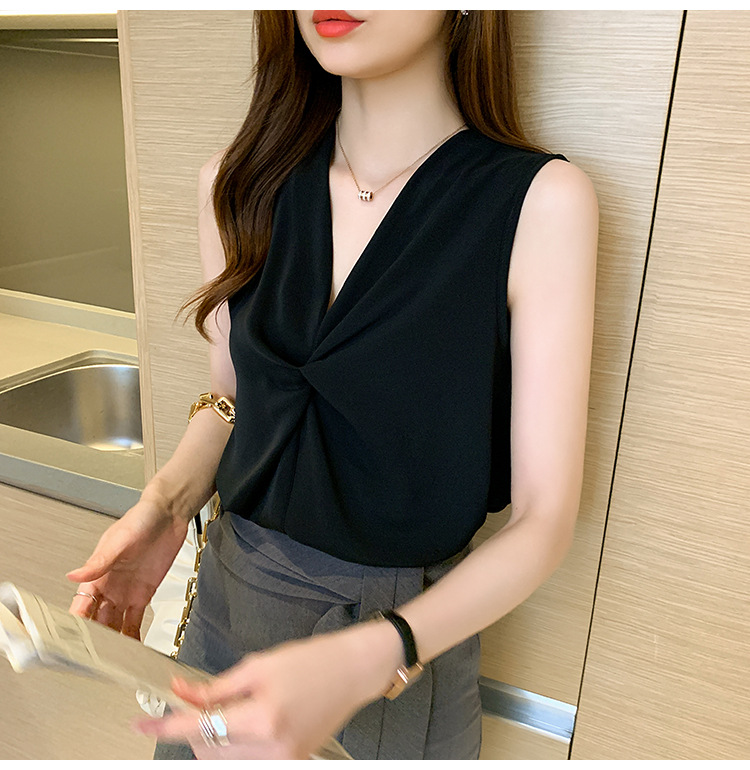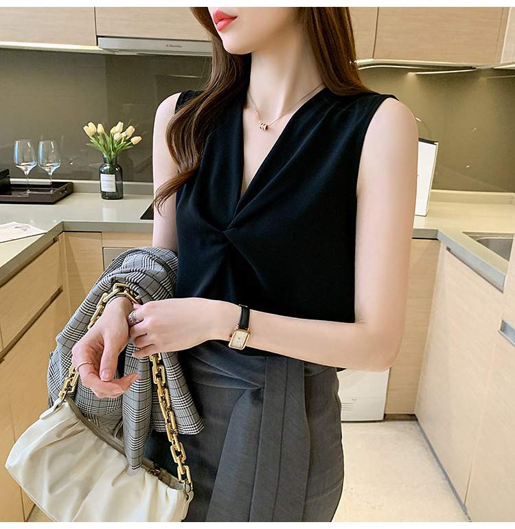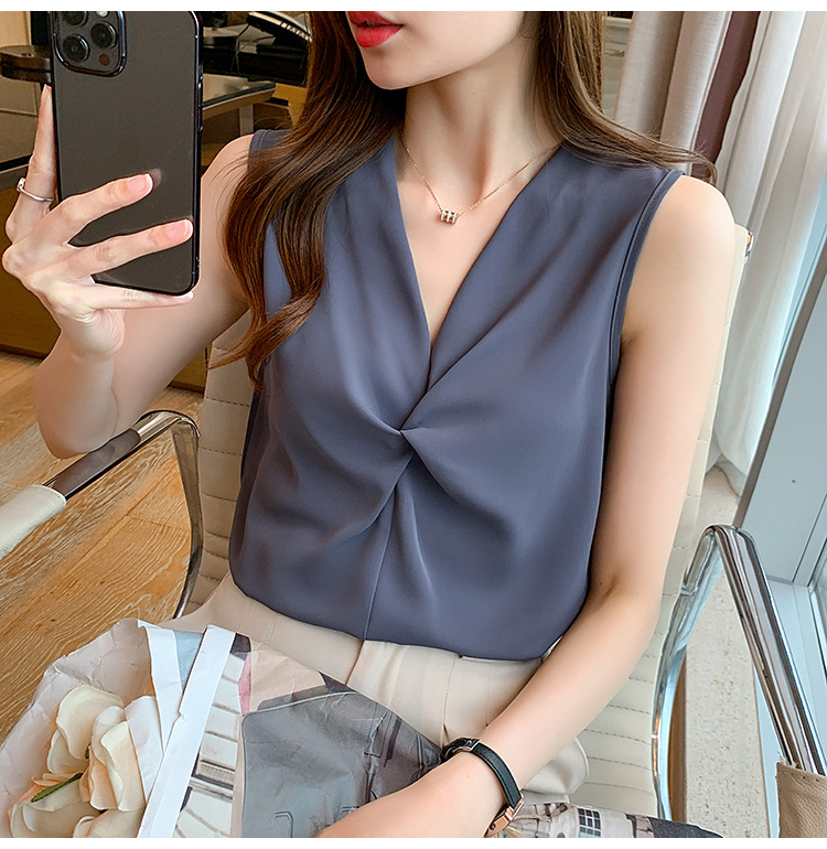 여성을위한 민소매 쉬폰 탑의 실제 사진 2025 여름 새로운 스타일 크로스 v 넥 느슨한 배꼽 덮는 한국 스타일 쉬폰 셔츠 통근스토어 가기