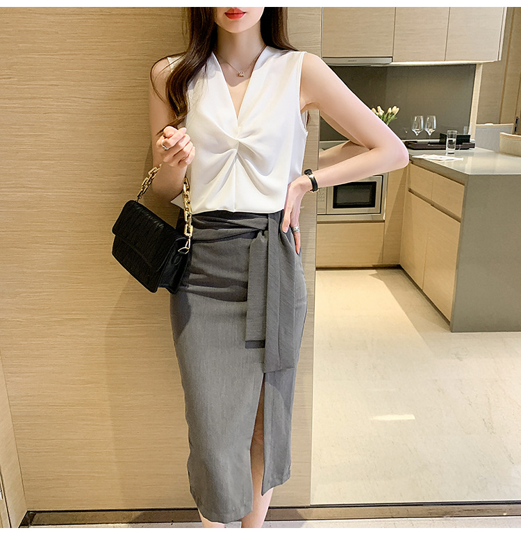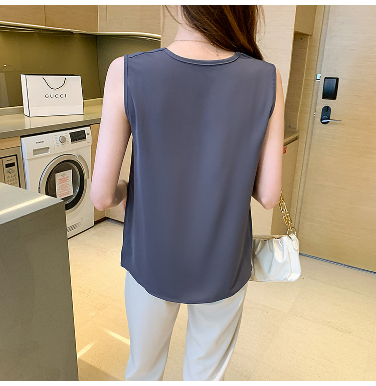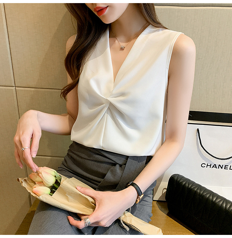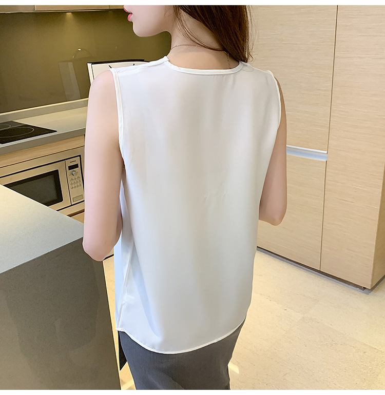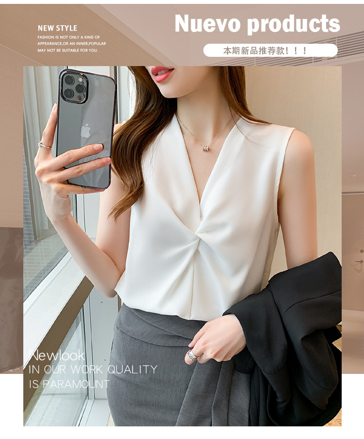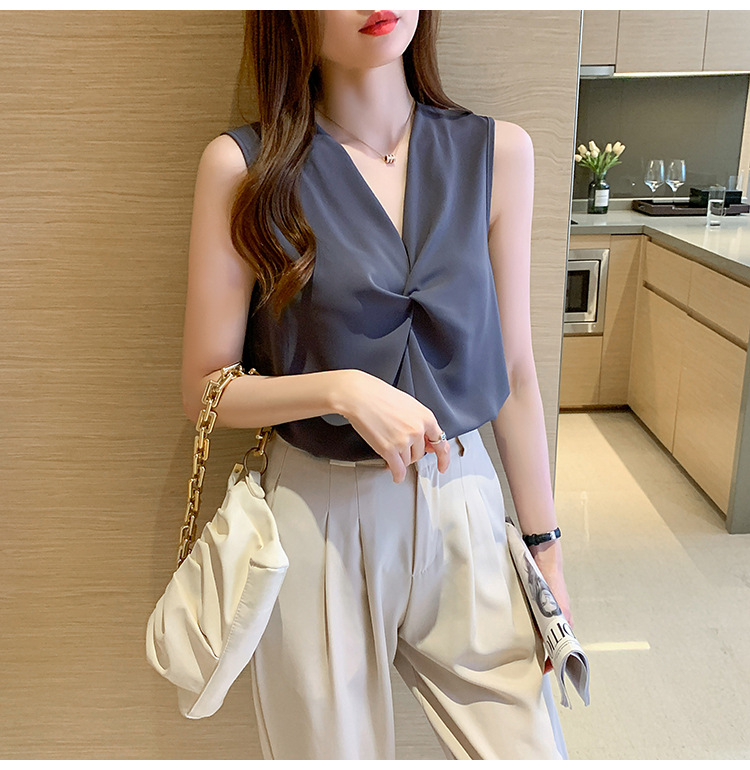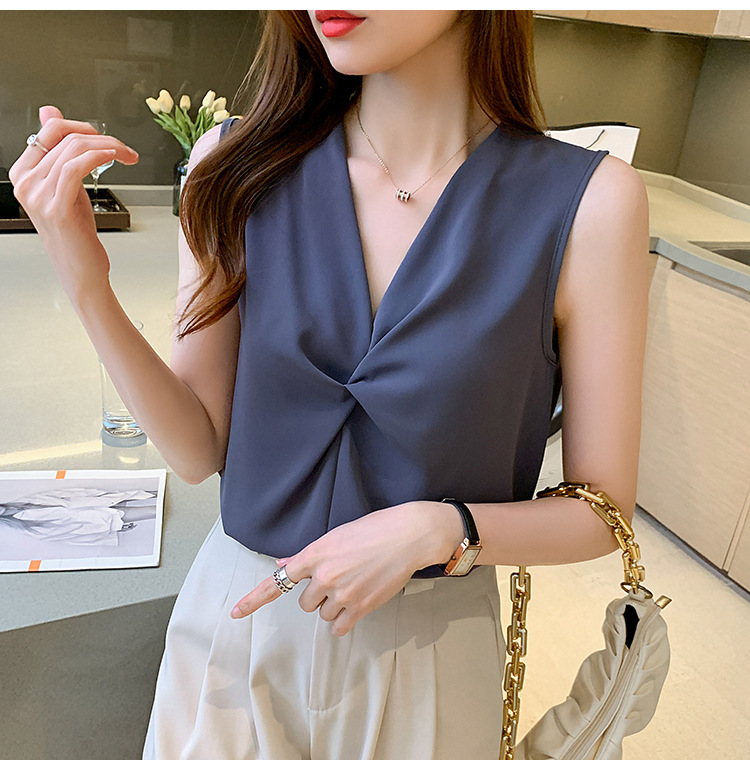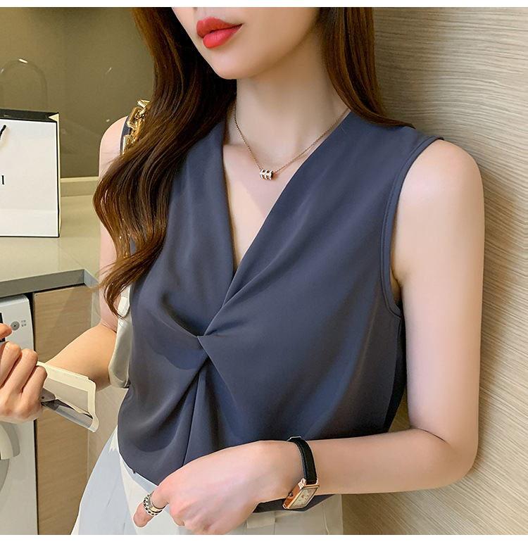 여성을위한 민소매 쉬폰 탑의 실제 사진 2025 여름 새로운 스타일 크로스 v 넥 느슨한 배꼽 덮는 한국 스타일 쉬폰 셔츠 통근스토어 가기