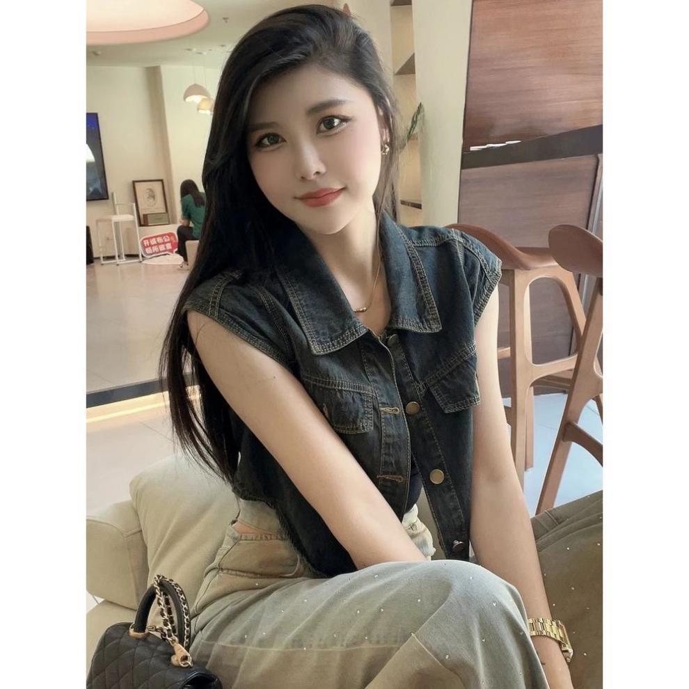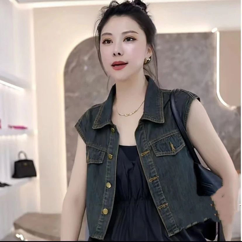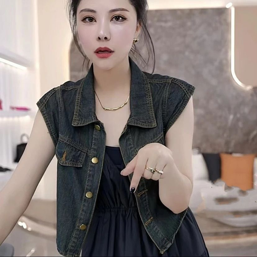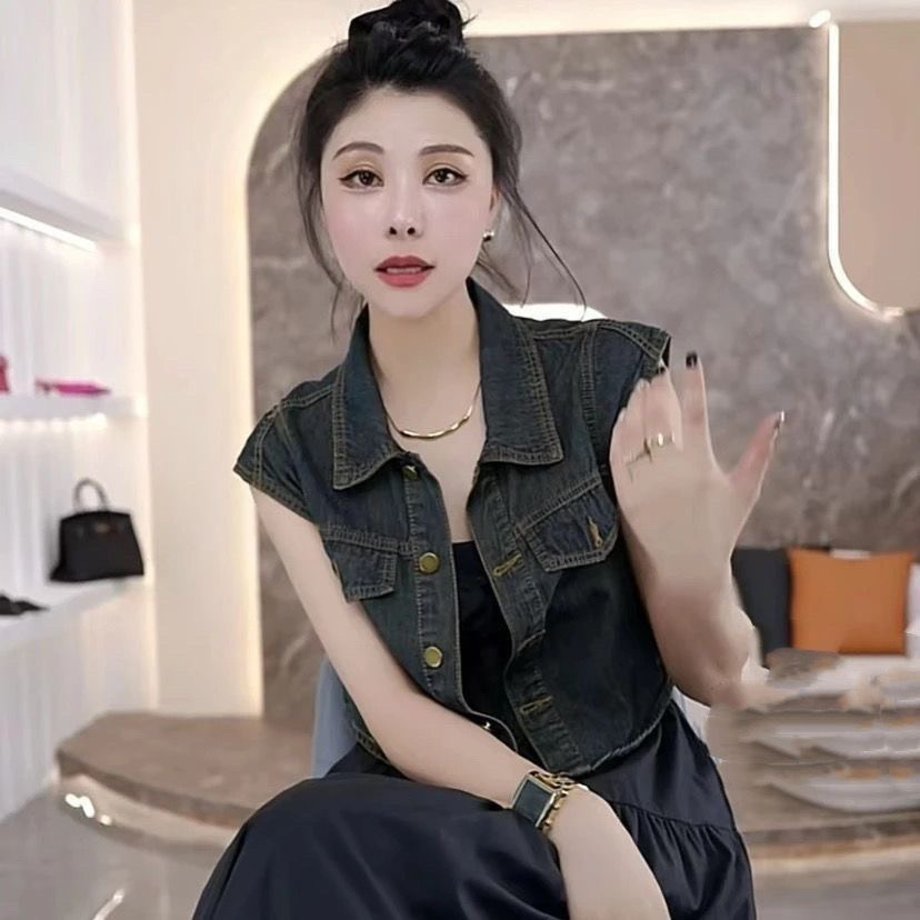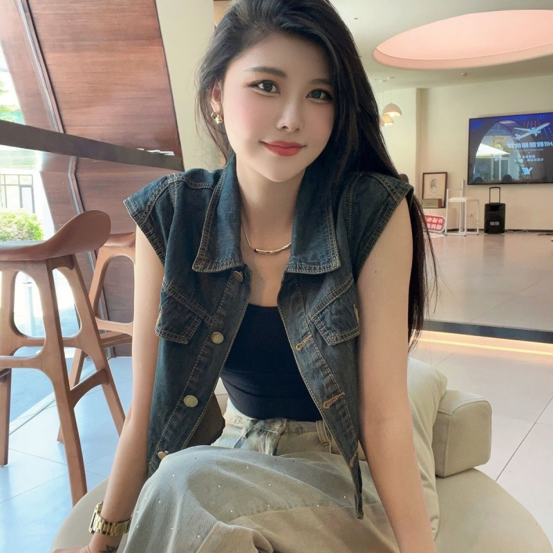 아메리칸 스타일 레트로 우아한 올 매치 민소매 데님 조끼 여자 2024 년 여름 새로운 느슨한 짧은 소매 재킷