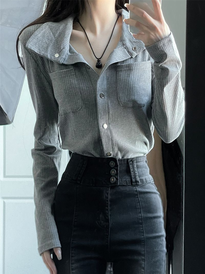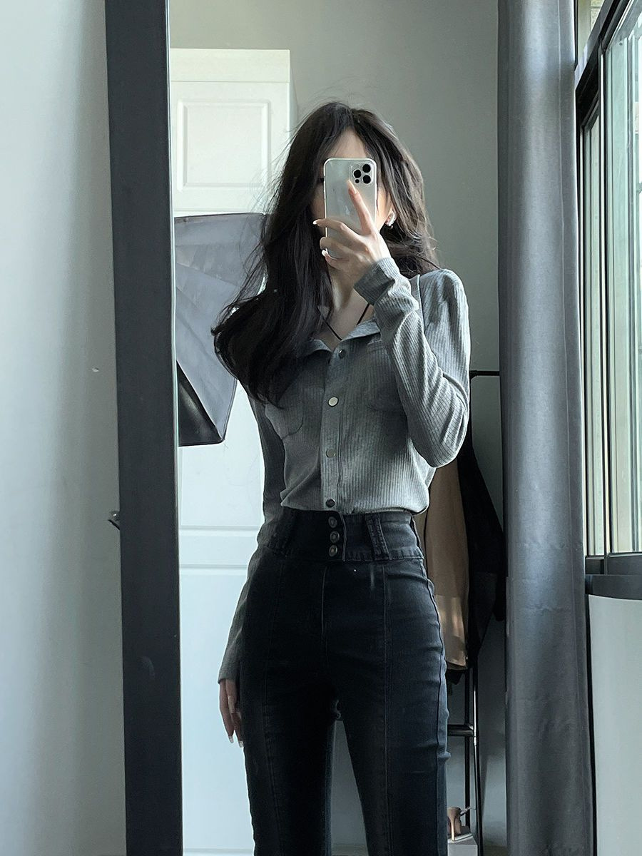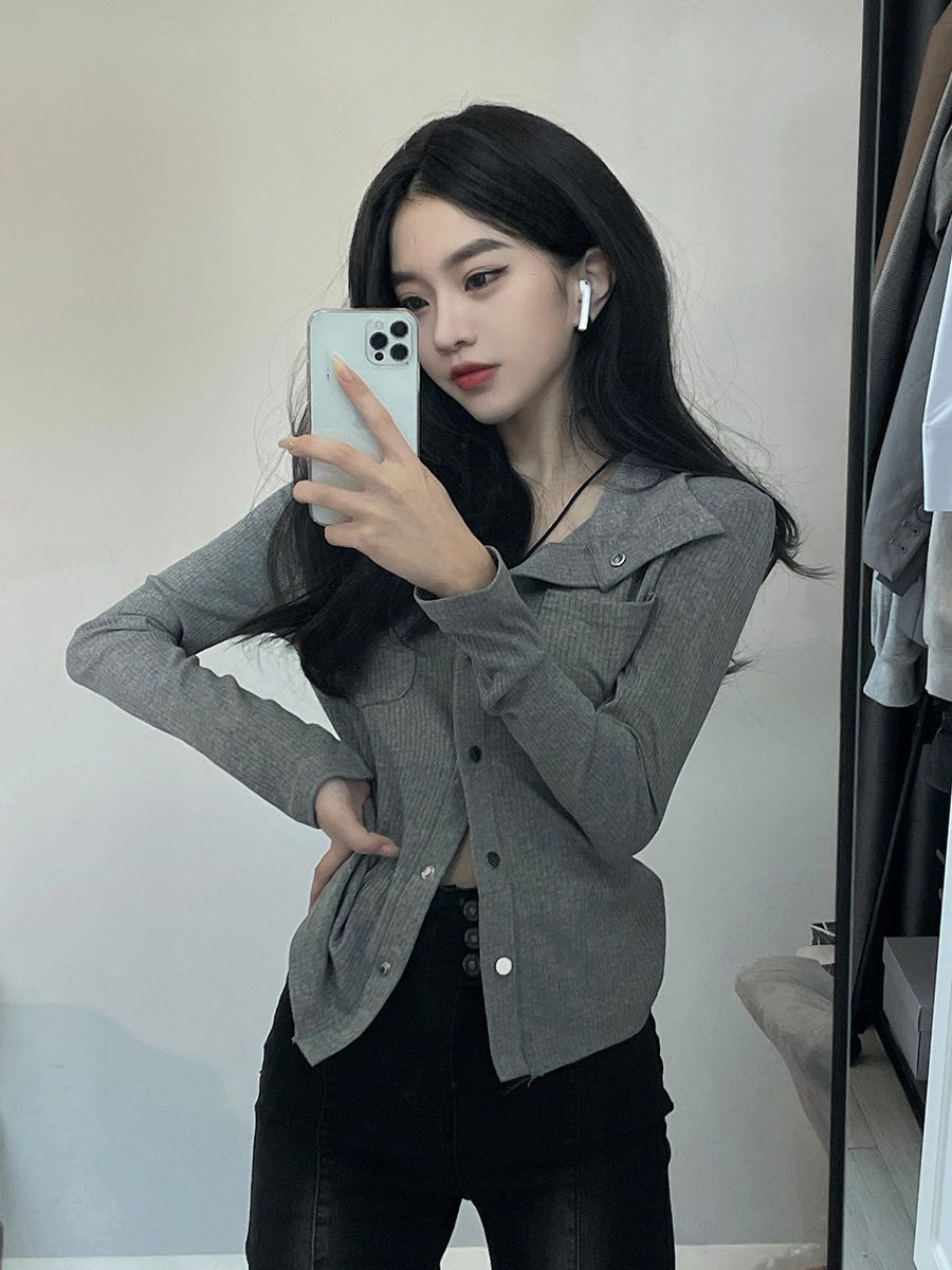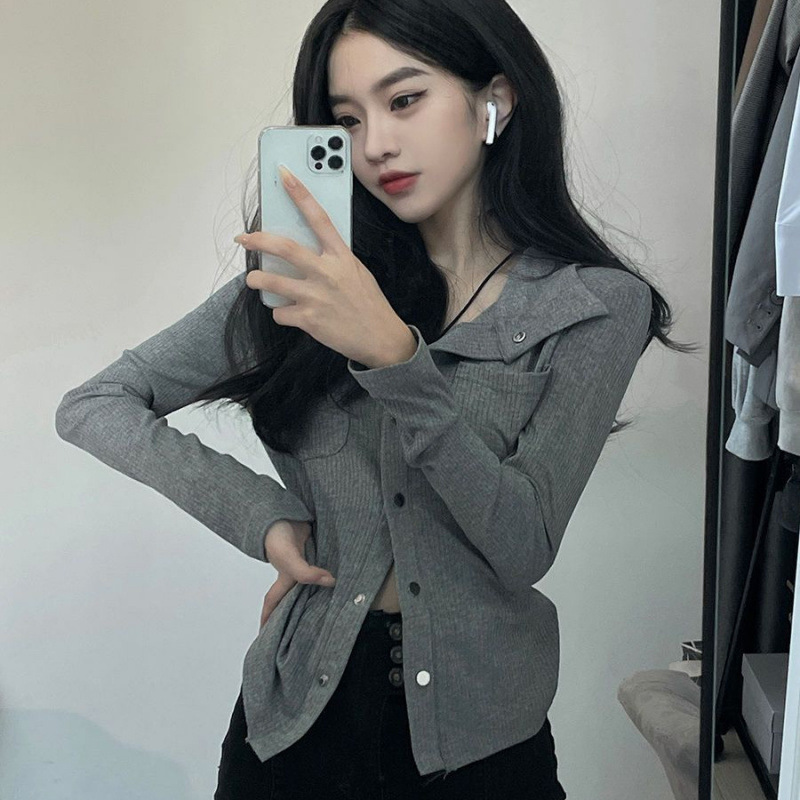 가을 그레이 빈티지 순수한 욕망 스타일 폴로 칼라 긴 소매 탑 여성용 슬림 슬리밍 니트 카디건 디자인 센스 틈새스토어 가기