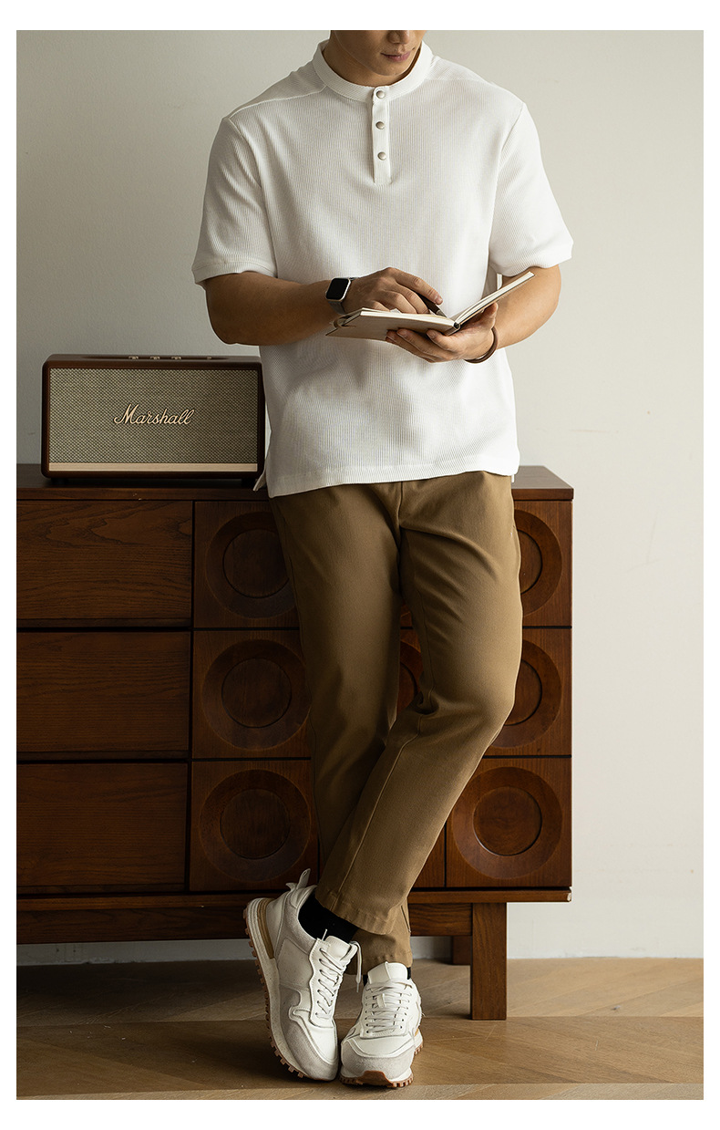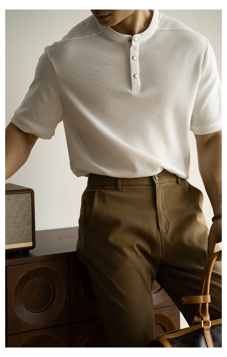 아메리칸 스타일 레트로 헨리 칼라 와플 텍스처 반팔 티셔츠 남자 2025 봄/여름 통근 캐주얼 반소매 탑