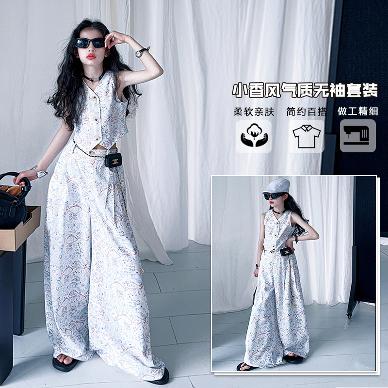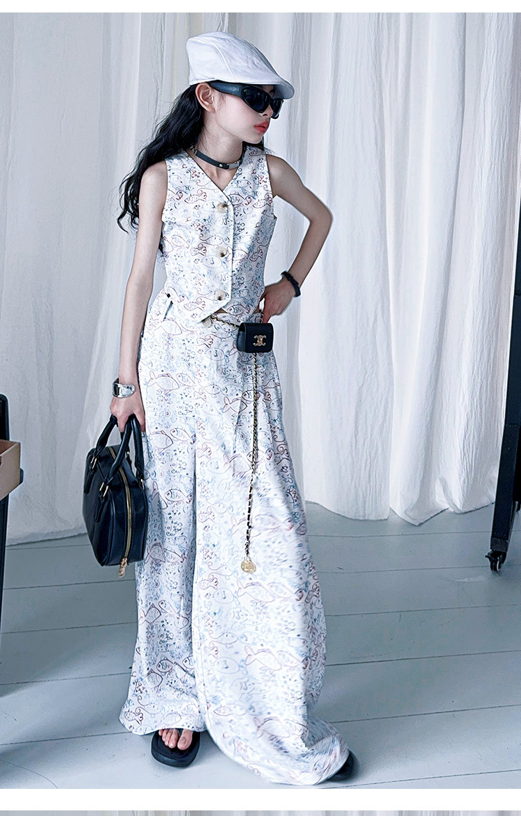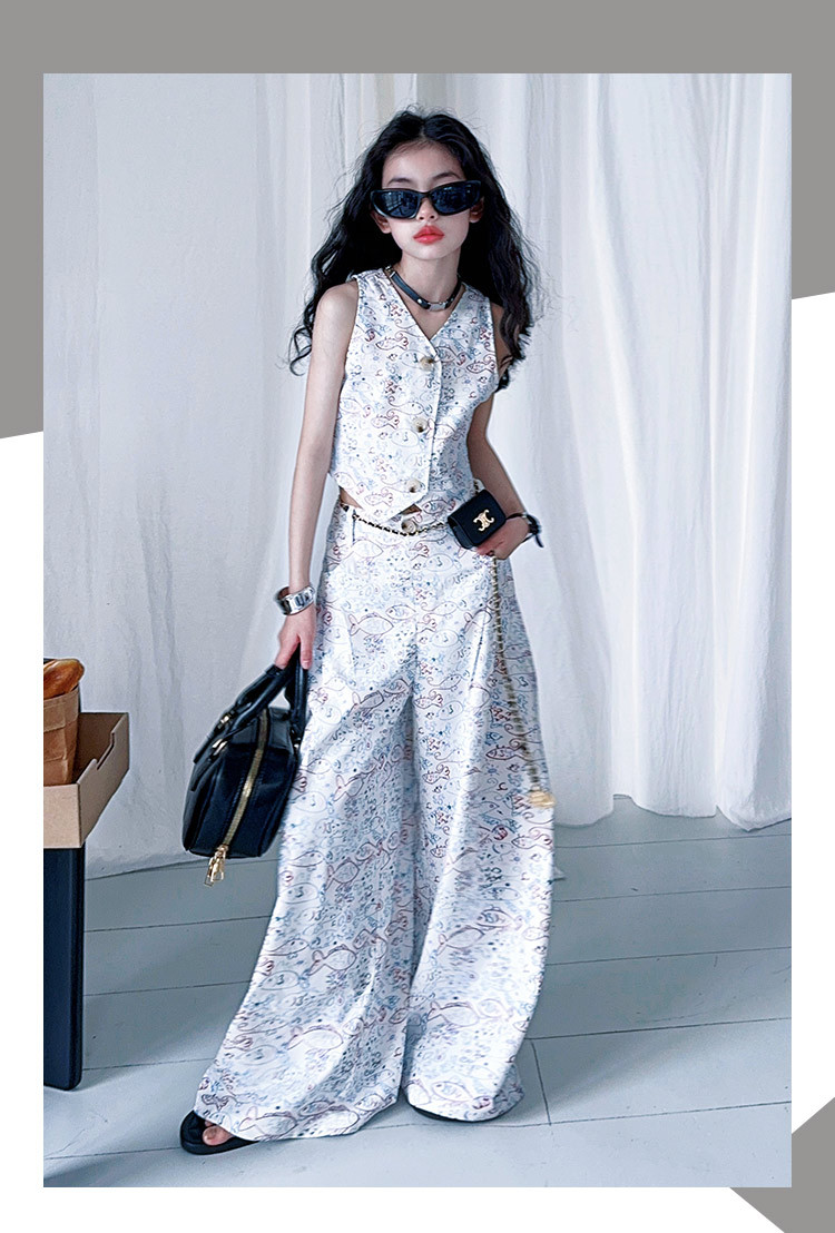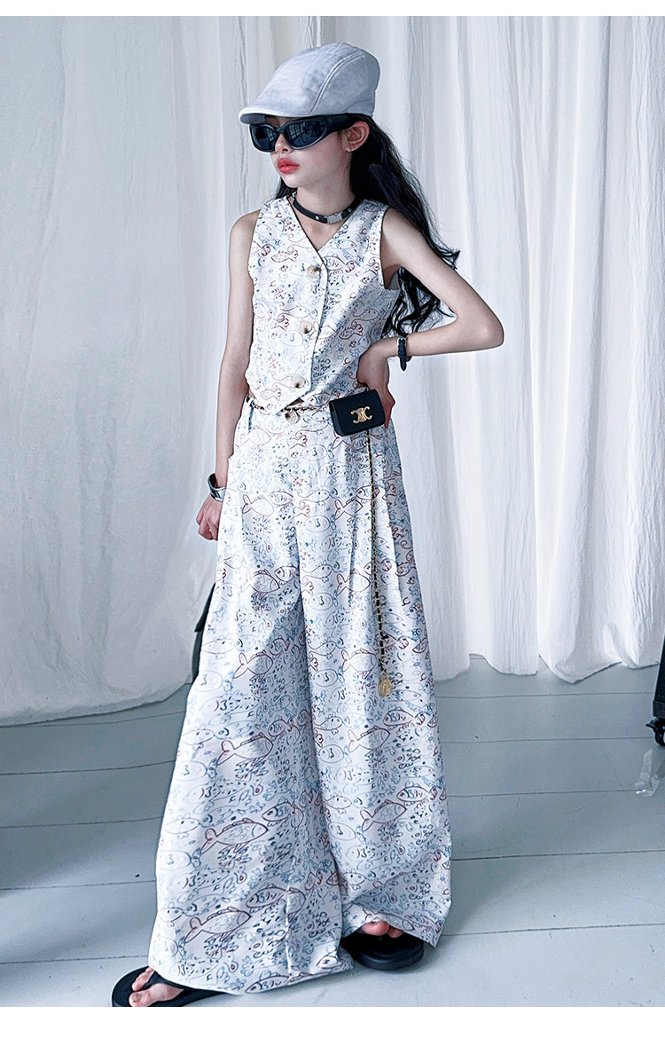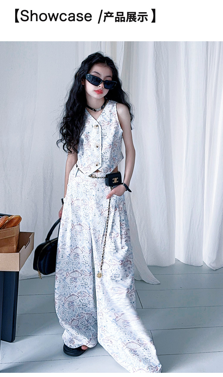 소녀 넓은 다리 바지 세트 봄과 여름 2025 새로운 한국 스타일 외국 스타일 작은 물고기 낙서 조끼 캐주얼 바지