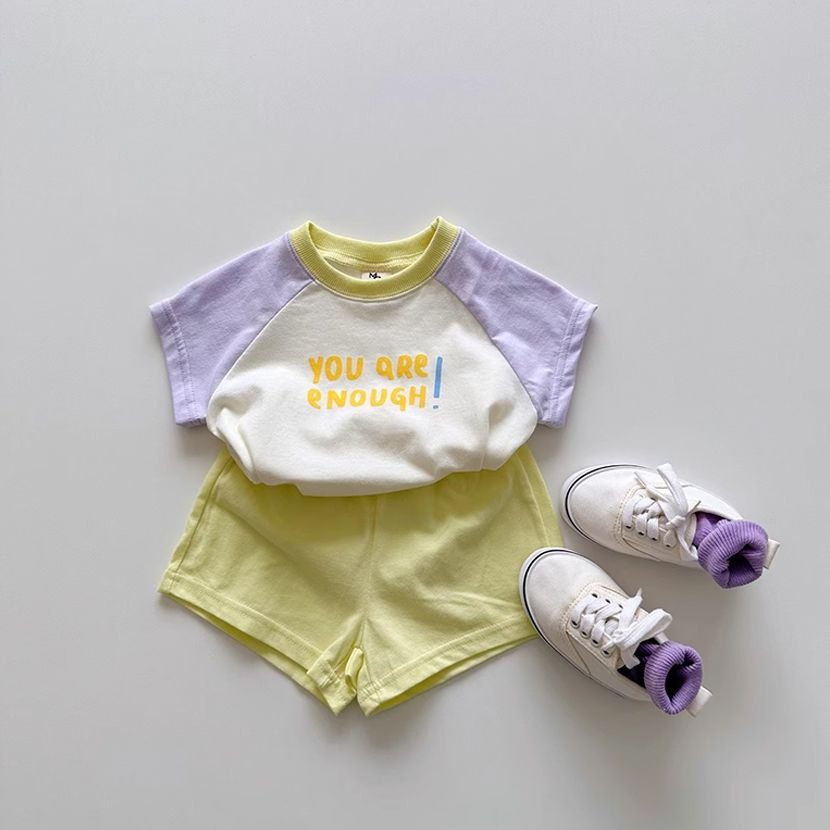 남학생과 여학생 여름 투피스 세트 아기 서양식 어린이 성격 유행 한국 컬러 매칭 숄더 레터 티셔츠 반바지스토어 가기