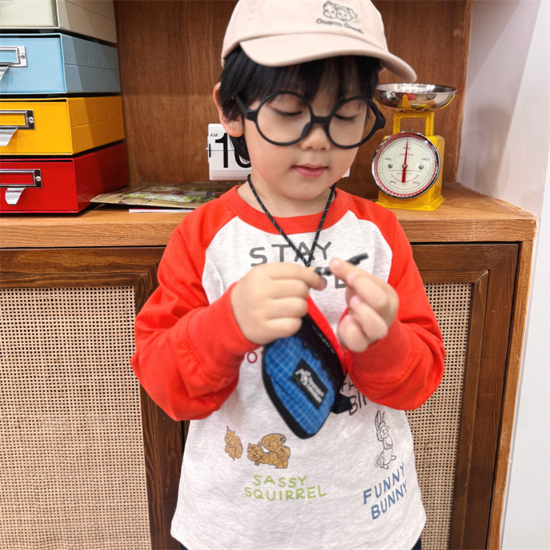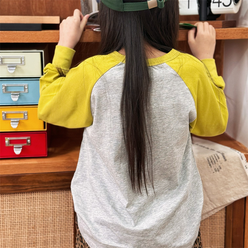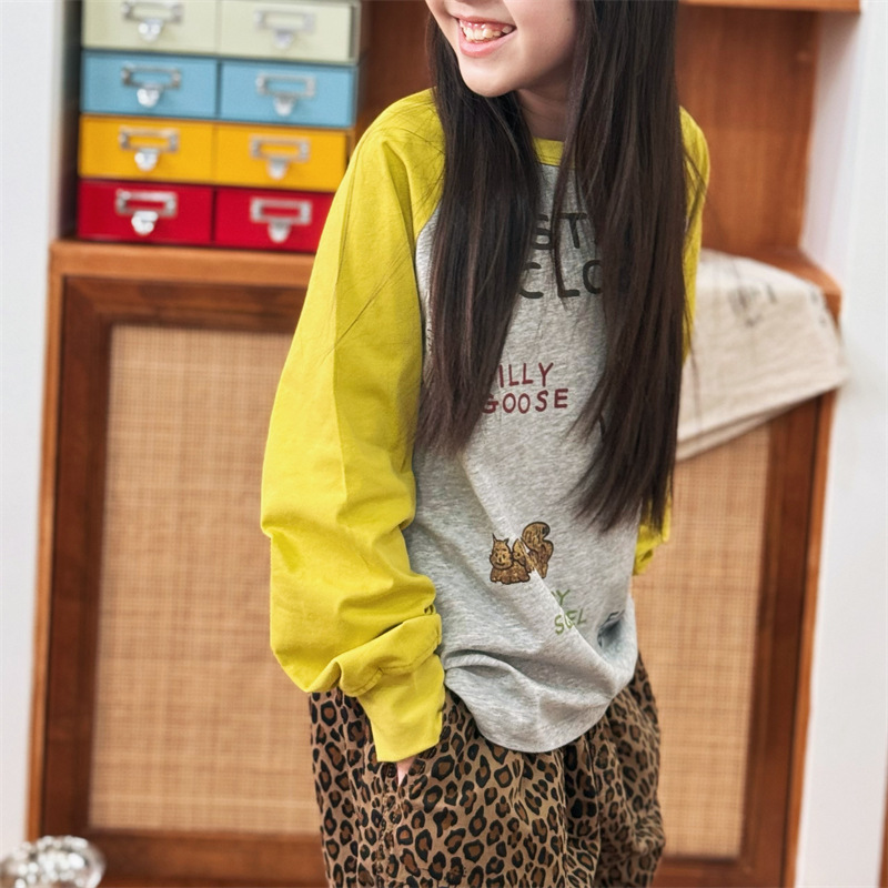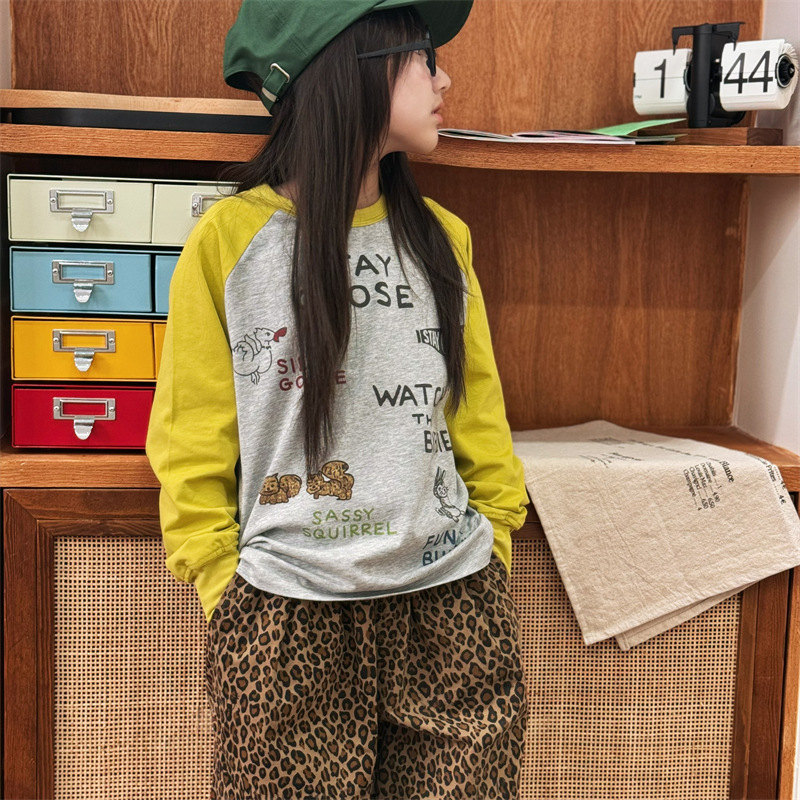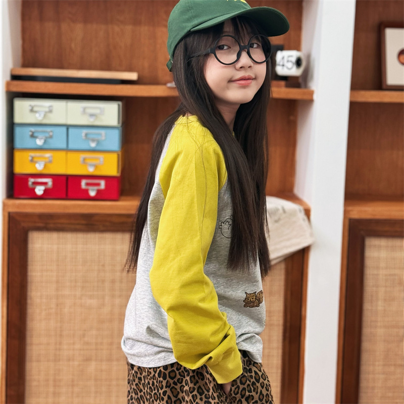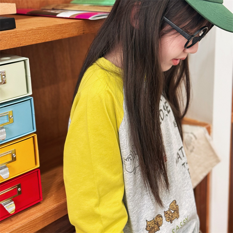 2025 봄 여름 새로운 어린이 동물 바닥 셔츠 소년과 소녀 스플 라이스 낙서 인쇄 라글란 슬리브 티셔츠 재고 있음
