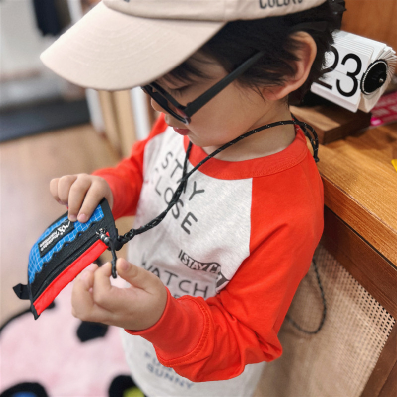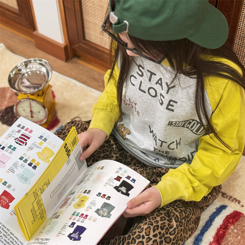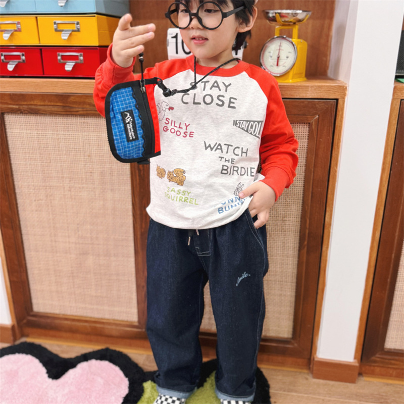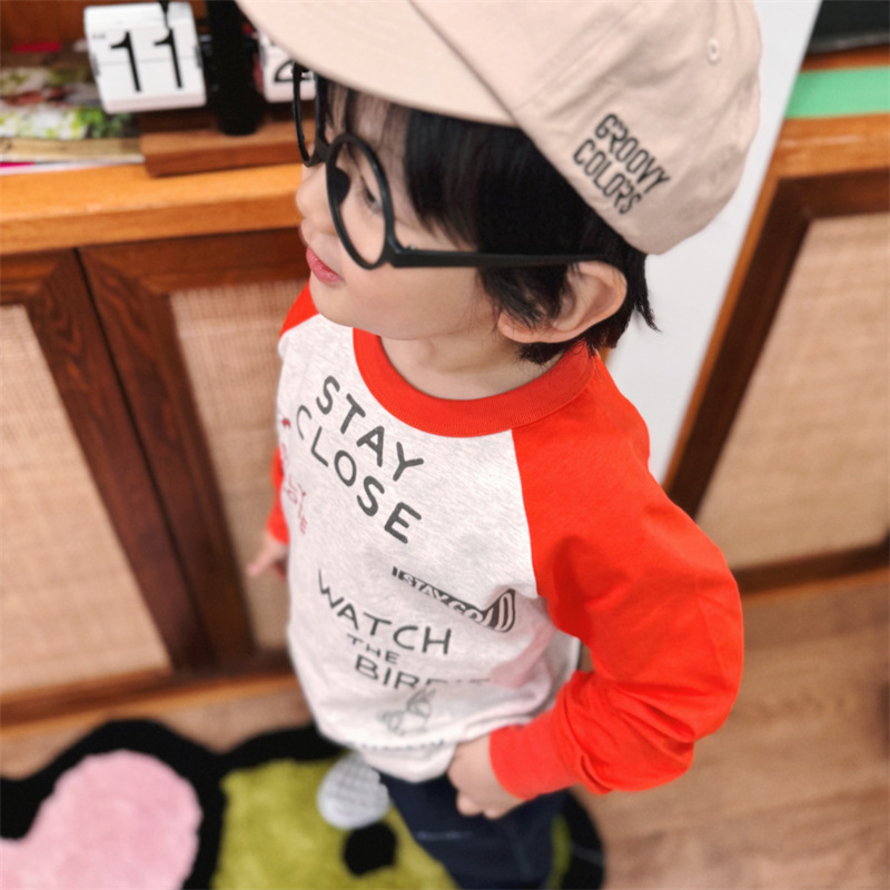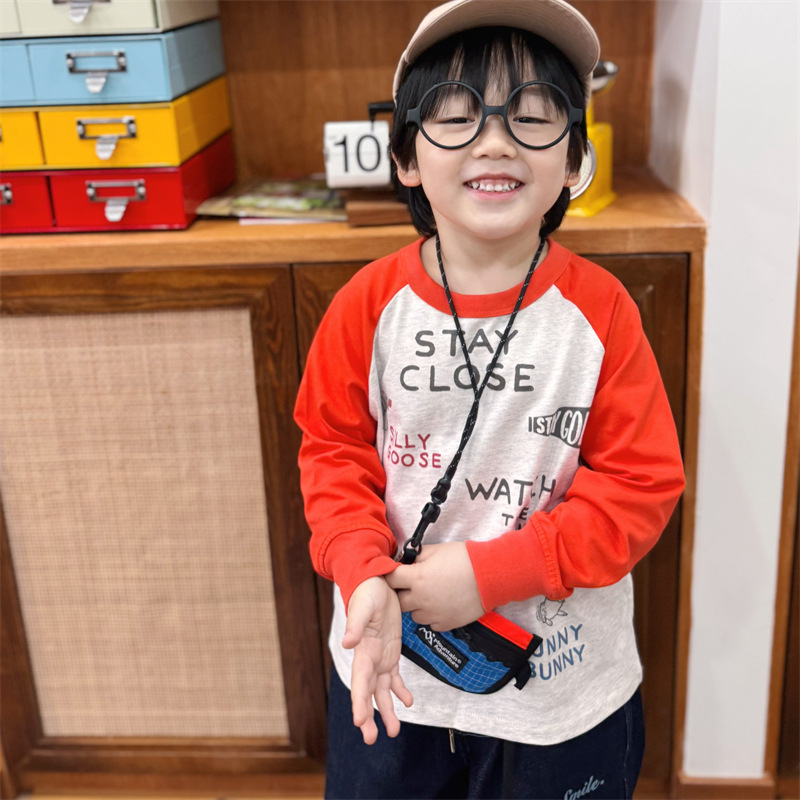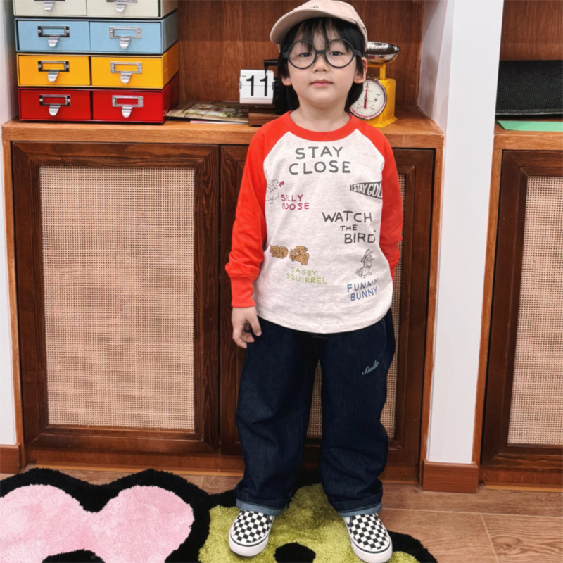2025 봄 여름 새로운 어린이 동물 바닥 셔츠 소년과 소녀 스플 라이스 낙서 인쇄 라글란 슬리브 티셔츠 재고 있음